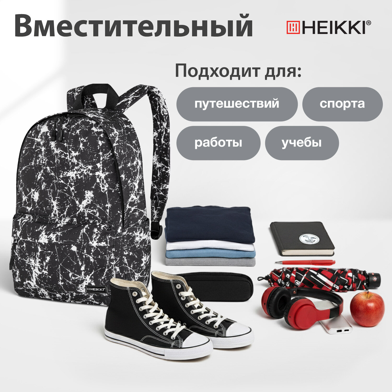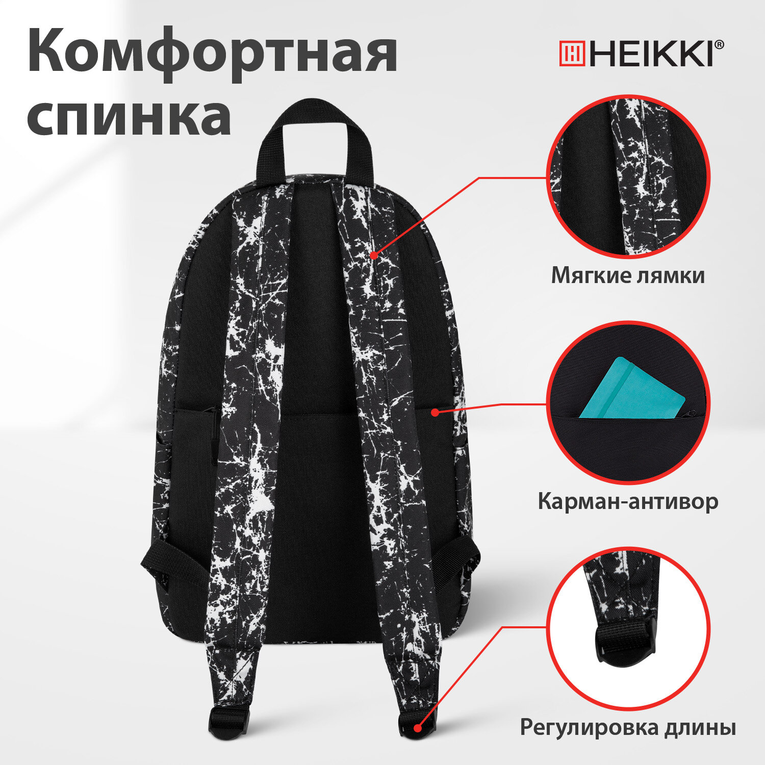 Рюкзак HEIKKI POSITIVE (ХЕЙКИ) универсальный, карман-антивор, "Spatter", 42х28х14 см Код товара: 273854 1 018,25 ₽ Купить Производитель:HEIKKI Оригинальная модель HEIKKI POSITIVE выгодно отличается от аналогов интересным дизайном и улучшенной конструкцией. Боковые карманы и карман-антивор делают эту модель максимально удобной в использовании. Легкий, вместительный и практичный рюкзак – идеальный аксессуар для ежедневного использования. Уплотненная спинка и лямки способствуют комфортной носке. Рюкзак можно использовать для учебы, прогулок и путешествий. Актуальный черно-белый принт добавит вашему образу оригинальности. Рюкзак изготовлен из современного материала с водоотталкивающими свойствами – полиэстера. Ткань обладает отличной устойчивостью цвета к солнечным лучам. Рекомендации по уходу за изделием: загрязнения легко удаляются с помощью мыла и мягкой влажной губки. Сушить рюкзак следует при комнатной температуре. Изделие не предназначено для машинной стирки, отбеливания и химической сушки. Для подкладки используется прочный, устойчивый к воздействию загрязнений полиэстер. Подкладка имеет тиснение с логотипом бренда, что подчеркивает фирменный стиль. Внутри основного отделения находится большой карман на резинке. В боковых карманах можно разместить бутылочки с водой, зонт, салфетки и прочие необходимые вещи. Отличное конструктивное решение – потайной карман на спинке. Он не только защитит важные документы и ценные вещи, но и обеспечит быстрый доступ к ним. Удобная регулировка длины производится с помощью пряжек, выполненных из качественного пластика. Ширина лямок – 5 см. Фиксированная длина – 44 см. Регулируемая длина – 46 см. Минимальная длина лямок – 50,5 см. Максимальная длина – 90 см. Дополнительные швы надежно фиксируют лямки в верхней и нижней части рюкзака. Дно рюкзака уплотнено толстым слоем специальной амортизирующей пены. Рюкзак легко открывать и закрывать одной рукой с любой стороны – основное отделение имеет долговечную реверсивную молнию с двумя удобными брендированными бегунками. Для переноски рюкзака и для подвешивания на крючок можно использовать прочную ручку-петлю. Рюкзак упакован в плотный ПЭТ-пакет, который сохранит качество и товарный вид при хранении и транспортировке.Производство: КитайПол: унисексСерия: POSITIVEОбъем: 16 лКоличество отделений: 1Регулируемые лямки: даКоличество карманов: 5 шт.Фронтальный карман: даБоковые карманы: даНаличие ручки для переноса: даМатериал: полиэстерЦвет: белый/черныйДизайн: SpatterВысота: 42 смШирина: 28 смГлубина: 14 смДлина лямок: 90 смВес: 0.4 кгРазмер упаковки: 3 × 43.5 × 34.9 смОбъём: 0.0049 м3Промежуточная упаковка: 5 штТранспортная упаковка: 20 штШтрих-код: 4606224502588 Сертификат-1.jpg Сертификат-2.jpg Сертификат-3.jpg