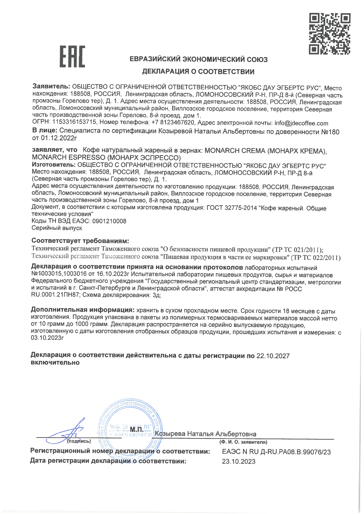Кофе в зернах MONARCH "Original Crema" 1 кг Код товара: 622074 2 816,16 ₽ Купить Производитель:MONARCH MONARCH "Original Crema" – символ деликатной обжарки зерна. Подарит мягкий, но в то же время насыщенный вкус, который идеально сбалансирован легкими цитрусовыми нотками. Изысканное кофейное наслаждение с утонченным ароматом. Способ приготовления: рекомендуется молоть зерна непосредственно перед приготовлением. Используйте 6 г (две чайные ложки) молотого кофе на чашку. Предназначен для кофемашин и других способов приготовления - в кофеварке, турке или прямо в чашке, заварив горячей, но не кипящей водой и оставив настояться на 1-3 мин.Производство: РоссияМасса нетто: 1000 гСтепень обжарки: средняяТип кофе: зерновойСрок годности: 18 мес.Вкус: CremaСерия: MonarchФирма-производитель: ООО "Якобс Дау Эгбертс Рус"Упаковка: вакуумный пакетСрок годности: 18 месВес: 1,09 кгРазмер упаковки: 10.5 × 26.2 × 17.4 смОбъём: 0.0059 м3Промежуточная упаковка: 4 штТранспортная упаковка: 4 штШтрих-код: 4607001773245 Сертификат-1.jpg Сертификат-2.jpg Сертификат-3.jpg