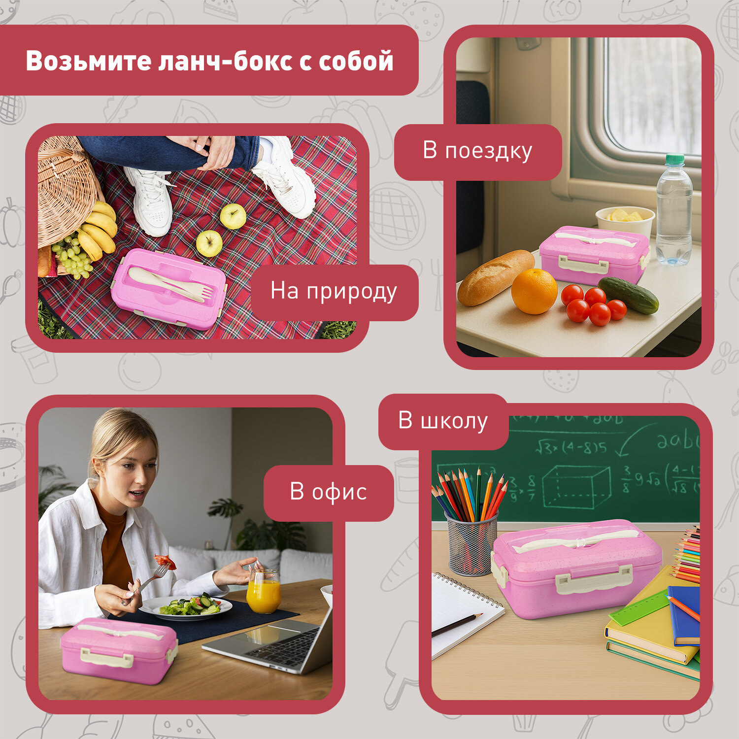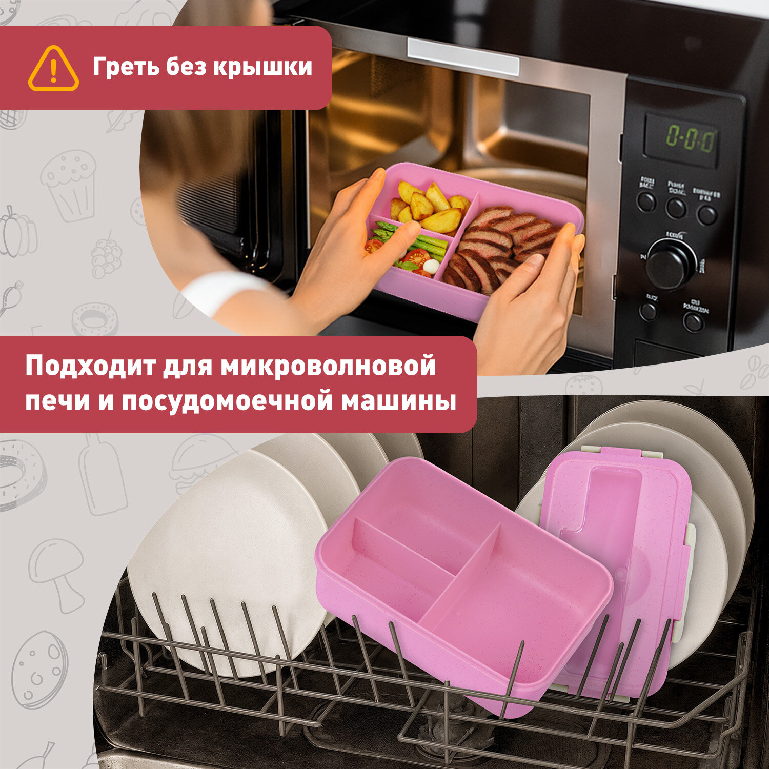 Ланч-бокс контейнер, 1 секция, 3 отделения, 1,4 л, ложка, вилка, 8х21х14 см, розовый, JOYLUX (ДЖОЙЛЮКС) ECO Код товара: 609345 342,88 ₽ Купить Производитель:Joylux Многофункциональный герметичный ланч-бокс JOYLUX объемом 1400 мл имеет три отсека и изготовлен из пластика высокого качества – это универсальное и безопасное решение для полноценного сбалансированного приема пищи в офисе, школе, поездках и путешествиях! Ланч-бокс JOYLUX выполнен из высококачественного полипропилена с добавлением натуральной пшеничной соломы – материал соответствует всем требованиям безопасности и не содержит бисфенола А. Контейнер устойчив к высоким температурам и подходит для использования в микроволновой печи и посудомоечной машине, что делает уход за изделием максимально простым. Герметичность обеспечивается за счёт силиконового уплотнителя на крышке – это позволяет безопасно переносить даже жидкие блюда без риска протекания. В комплект входят пластиковые ложка и вилка, которые удобно хранятся в верхней секции ланч-бокса. Объём ланч-бокса – 1400 мл, что оптимально для полноценного обеда. Он представляет собой одноуровневую конструкцию с тремя отсеками, идеальными для основного блюда, например, гарнира и мяса, а также для салатов, сэндвичей и снеков. Благодаря продуманной конструкции контейнера блюда в нём сохраняют вкусовые качества и не смешиваются между собой. Ланч-бокс JOYLUX отличается современным универсальным дизайном, который понравится и детям, и взрослым. Компактные размеры и удобная форма позволяют легко разместить ланч-бокс в сумке или рюкзаке. Рекомендации по использованию: - Используйте ланч-бокс для хранения и транспортировки горячих и холодных блюд (диапазон температур при использовании от -20 до +110 °C). - Перед разогревом в микроволновой печи убедитесь, что крышка открыта. - Подходит для посудомоечной машины и микроволновой печи.Производство: КитайОбъем: 1.4 лНазначение: СВЧ, хранениеКоличество секций: 1Особенности: герметичныйЦвет контейнера: розовыйЦвет крышки: розовыйМатериал: пластикВысота: 8 смШирина: 21 смГлубина: 14 смВес: 328 грРазмер упаковки: 8.3 × 21.8 × 14.9 смОбъём: 0.0031 м3Промежуточная упаковка: 60 штТранспортная упаковка: 60 штШтрих-код: 4606224440040 Сертификат-1.jpg Сертификат-2.jpg Сертификат-3.jpg