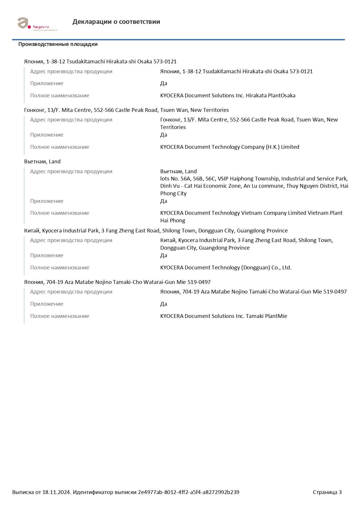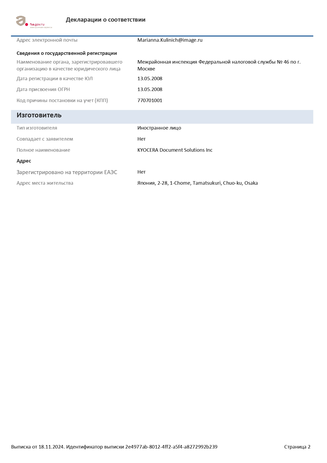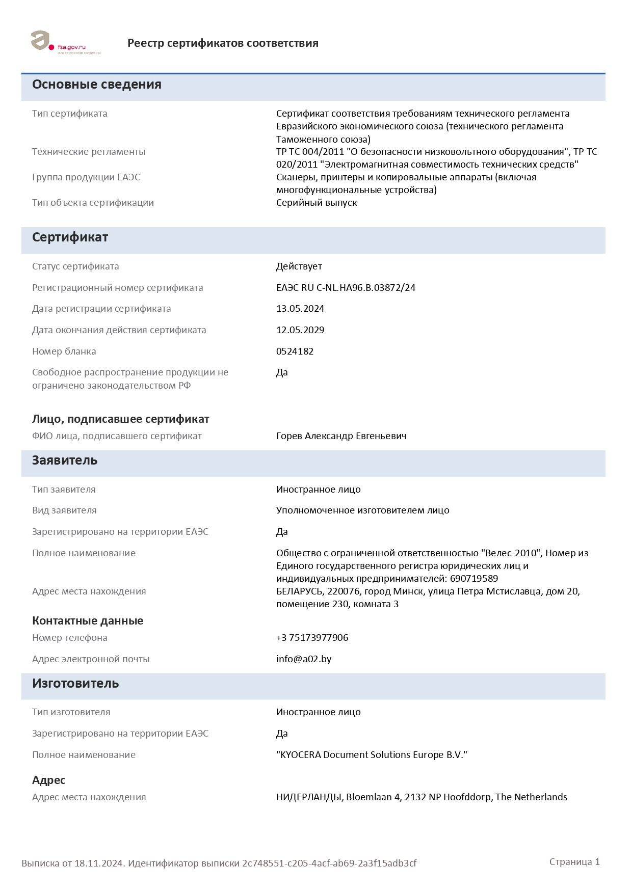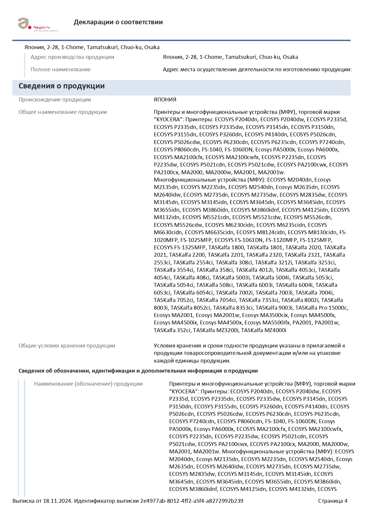 МФУ лазерное KYOCERA MA4500ix "3 в 1", А4, 45 стр./мин.,150000 стр./мес., ДУПЛЕКС, ДАПД, сетевая карта, цветной сенсорный дисплей Код товара: 354972 97 695,62 ₽ Купить Производитель:KYOCERA ВНИМАНИЕ! В коробку с устройством вложен уникальный пароль администратора. В СЛУЧАЕ УТЕРИ ПАРОЛЯ – ВОССТАНОВИТЬ ЕГО НЕВОЗМОЖНО! НЕОБХОДИМО сохранять коробку и пароль до конца эксплуатации оборудования. УТЕРЯ ПАРОЛЯ ВЕДЕТ К ПОТЕРЕ ГАРАНТИИ! KYOCERA MA4500ix – это компактный и мощный аппарат формата A4, который гарантирует выдающееся качество от первого до последнего отпечатка. Это МФУ обладает передовыми функциями обеспечения безопасности и низким энергопотреблением, он идеально подходит для небольших и средних рабочих рабочих групп. KYOCERA MA4500x с лёгкостью позволит оптимизировать работу организации или крупного отдела компании и уменьшить общие эксплуатационные расходы. Устройство оснащено всеми необходимыми функциями: реверсивный автоподатчик оригиналов ёмкостью 75 листов (для бумаги плотностью от 50 до 120 г/м2), модулем дуплекса и сетевым интерфейсом (стандарт RJ-45), цветной сканер с возможностью сканирования по сети. В комплект поставки входят стартовый тонер-картриджи: черный – 6000 страниц. Ресурс картриджа указывается при 5% заполнении листа формата А4 в соответствии с ISO/IEC 19752. Фактический ресурс может значительно отличаться в зависимости от печатаемых изображений, типа бумаги и других факторов.Производство: КитайУстройство: копир, принтер, сканерТехнология печати: лазерная монохромнаяНагрузка: 150000 стр. в месяцМаксимальный формат: А4Автоматическая двухсторонняя печать: даСкорость печати и копирования: 45 стр./мин. (ч/б А4)Важная информация: коробку сохранять, содержит уникальный пароль администратора (необходимо его сохранить)Разрешение сканера: 600х600 dpiСерия: MA4500Устройство автоподачи оригиналов для сканирования: двустороннееЕмкость входного лотка: 100 листовЕмкость выходного лотка: 250 листовМинимальная плотность бумаги: 60 г/м2Максимальная плотность бумаги: 220 г/м2Интерфейс Ethernet (RJ-45): даПодключение по USB: даСенсорный дисплей: даПоддержка ОС: Linux, Mac OS, WindowsКомплект поставки: документация, кабель USB в комплект не входит, код для заказа: 1,5 м - 513128, 3 м - 513129, кабель питания, комплект картриджейКоличество картриджей в комплекте: 1 шт.Ширина: 47.5 смВысота: 57.5 смГлубина: 47.6 смВес: 22.5 кгРазмер упаковки: 69.5 × 57 × 60.7 смОбъём: 0.2405 м3Промежуточная упаковка: 1 штТранспортная упаковка: 1 шт Файлы Сертификат-1.jpg Сертификат-2.jpg Сертификат-3.jpg Сертификат-4.jpg Сертификат-5.jpg Сертификат-6.jpg Сертификат-7.jpg Сертификат-8.jpg Сертификат-9.jpg Сертификат-10.jpg Сертификат-11.jpg Сертификат-12.jpg Сертификат-13.jpg Сертификат-14.jpg
