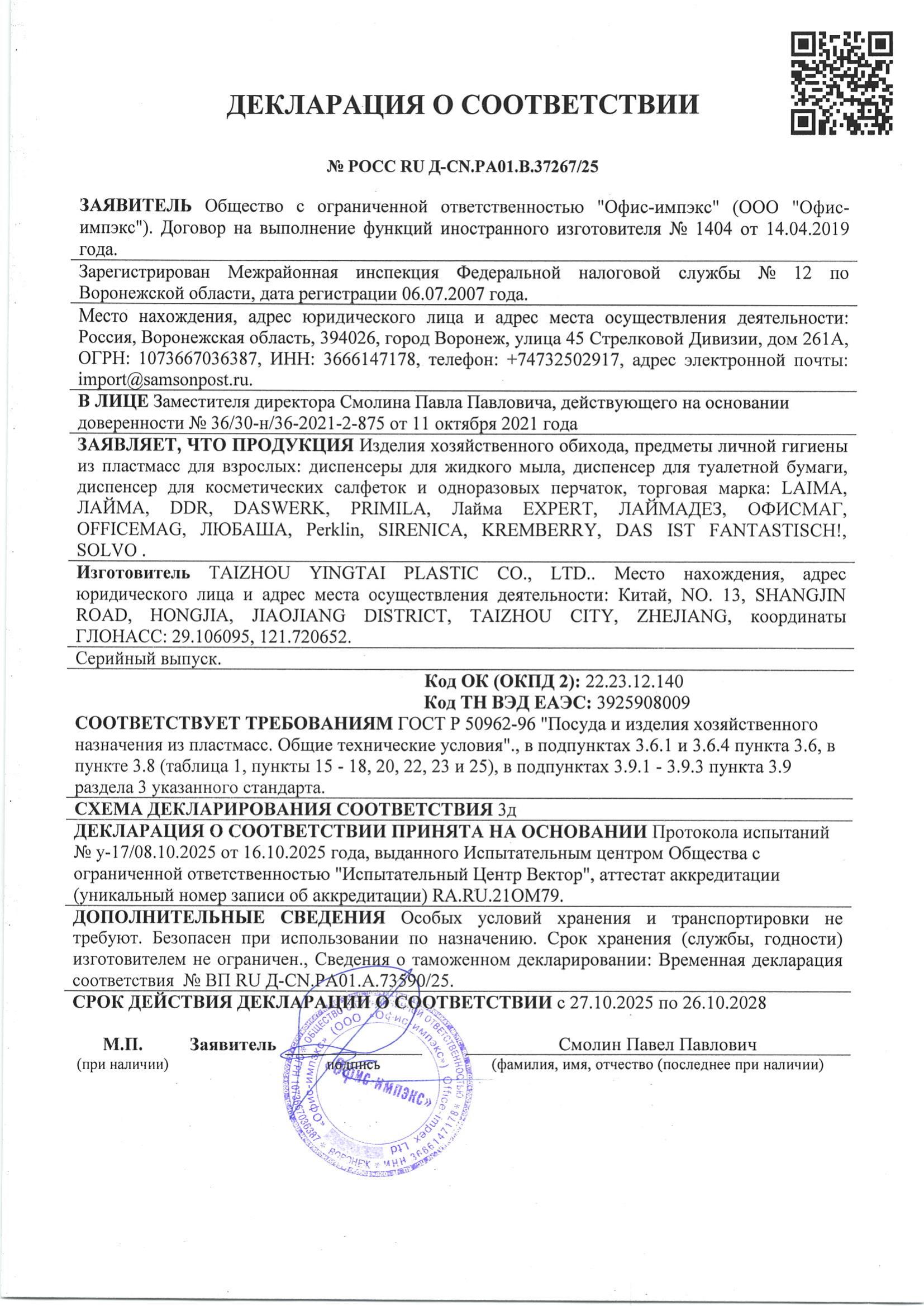 Дозатор для жидкого мыла LAIMA, НАЛИВНОЙ, 0,5 л, белый, ABS-пластик Код товара: 601792 947,54 ₽ Купить Производитель:LAIMA Дозатор для жидкого мыла LAIMA подходит для использования в местах с любой проходимостью, таких как туалетная комната в ресторане, офисе, торговом центре, аэропорту, вокзале. Корпус выполнен из ударопрочного пластика ABS. Выдача мыла осуществляется экономичными порциями. Дозатор сочетается с расходными материалами других производителей. Имеется окно для контроля уровня мыла. В комплект входят крепежные материалы. Преимущества дозатора для жидкого мыла LAIMA: 1) Гигиеничность. 2) Высокий уровень комфорта для пользователей. 3) Легкость и простота в эксплуатации. 4) Не требует особого ухода. 5) Надежность конструкции. Объем – 0,5 л. Расстояние между креплениями – 6,7 см.Производство: КитайОбъем: 0.5 лТип диспенсера: наливной для жидкого мылаАртикул: 601792Серия: EASY_1Диспенсерная система: нетУправление: механическоеИндикаторы: окно для контроля уровня мылаКомплектация: крепежные материалыКоличество режимов дозирования: 1Сочетается с расходными материалами других производителей: даМатериал замка: нетМатериал корпуса: пластикЦвет корпуса: белыйШирина: 85 ммВысота: 230 ммГлубина: 85 ммВес: 301 грРазмер упаковки: 8.6 × 22.8 × 8.4 смОбъём: 0.002 м3Промежуточная упаковка: 50 штТранспортная упаковка: 50 штШтрих-код: 4606224114583 Сертификат-1.jpg Сертификат-2.jpg Сертификат-3.jpg