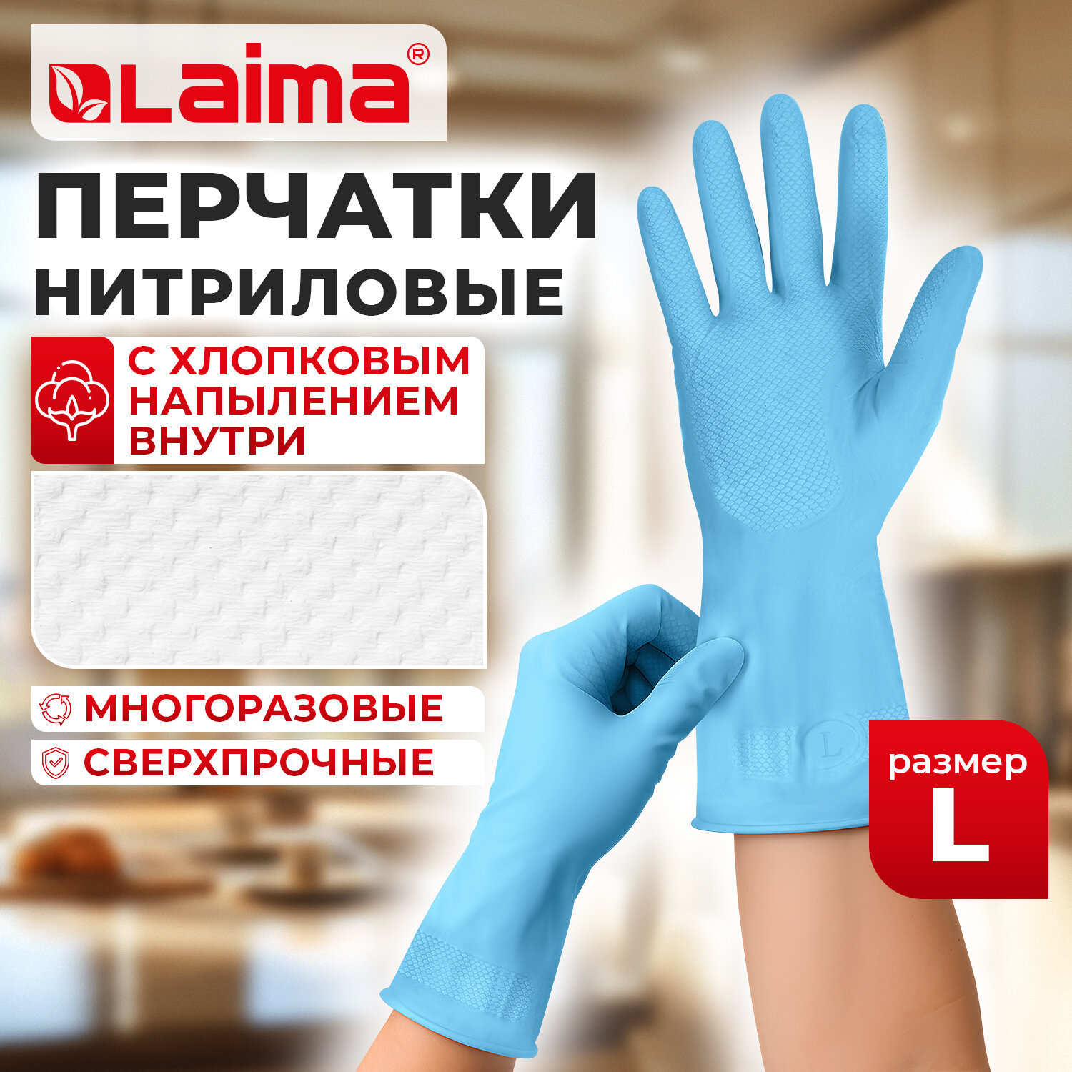 Перчатки МНОГОРАЗОВЫЕ нитриловые LAIMA ГИПОАЛЛЕРГЕННЫЕ, хлопчатобумажное напыление, ПРОЧНЫЕ, размер 8-9, L (большой), синие, вес 38г Код товара: 604999 114,21 ₽ Купить Производитель:LAIMA Перчатки хозяйственные LAIMA защищают руки от воздействия грязи, влаги, моющих и чистящих средств при любых бытовых и хозяйственных работах: мытьё посуды, стирка белья, уборка, садоводческая работа и т.д Они изготовлены из нитрила - называемого искусственным каучуком, — синтетического сополимера из мономеров карбоновой кислоты, акрилонитрила и бутадиена. Материал отлично тянется, прочен, эластичен, выдерживает значительные перепады температур без потери качественных характеристик, а также обладает отличными защитными свойствами свойствами от вредных и агрессивных химических веществ и микроорганизмов. Благодаря этому нитриловые перчатки являются одними из самых надежных на сегодняшний день, они максимально устойчивы к повреждениям, разрывам, проколам, порезам, истиранию, но при этом эластичны и хорошо растягиваются. Классический размер L подойдет на руку стандартного размера. В комплекте - 1 пара. Данные перчатки можно использовать несколько раз. Цвет - синий.Производство: КитайЗащита от: химических воздействийРазмер: L (большой)Размер производителя: 8-9 (L)Вид: хозяйственно-бытовыеМатериал основы: нитрилПокрытие внешнее: нетПодкладка: хлопковое напылениеСерия: МногоразовыеСтепень защиты от кислот: неприменимоСтепень защиты от щелочей: неприменимоПоверхность области захвата: рельефнаяКоличество в комплекте: 1 парДлина: 290 ммЦвет: синийВес: 43 грРазмер упаковки: 0.6 × 25.1 × 15.1 смОбъём: 0.0002 м3Промежуточная упаковка: 12 штТранспортная упаковка: 144 штШтрих-код: 4606224506661 Файлы Сертификат-1.jpg Сертификат-2.jpg Сертификат-3.jpg Сертификат-4.jpg Сертификат-5.jpg Сертификат-6.jpg Сертификат-7.jpg Сертификат-8.jpg Сертификат-9.jpg Сертификат-10.jpg Сертификат-11.jpg Сертификат-12.jpg Сертификат-13.jpg Сертификат-14.jpg Сертификат-15.jpg Сертификат-16.jpg Сертификат-17.jpg Сертификат-18.jpg Сертификат-19.jpg Сертификат-20.jpg Сертификат-21.jpg Сертификат-22.jpg Сертификат-23.jpg Сертификат-24.jpg Сертификат-25.jpg Сертификат-26.jpg