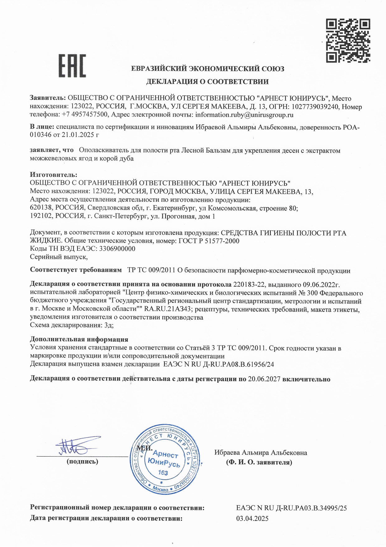 Формула ополаскивателя усилена хвойными смолами и экстрактами можжевеловых ягод и коры дубы, не содержит парабенов, SLS и спирта и рекомендован стоматологами для ежедневного использования: