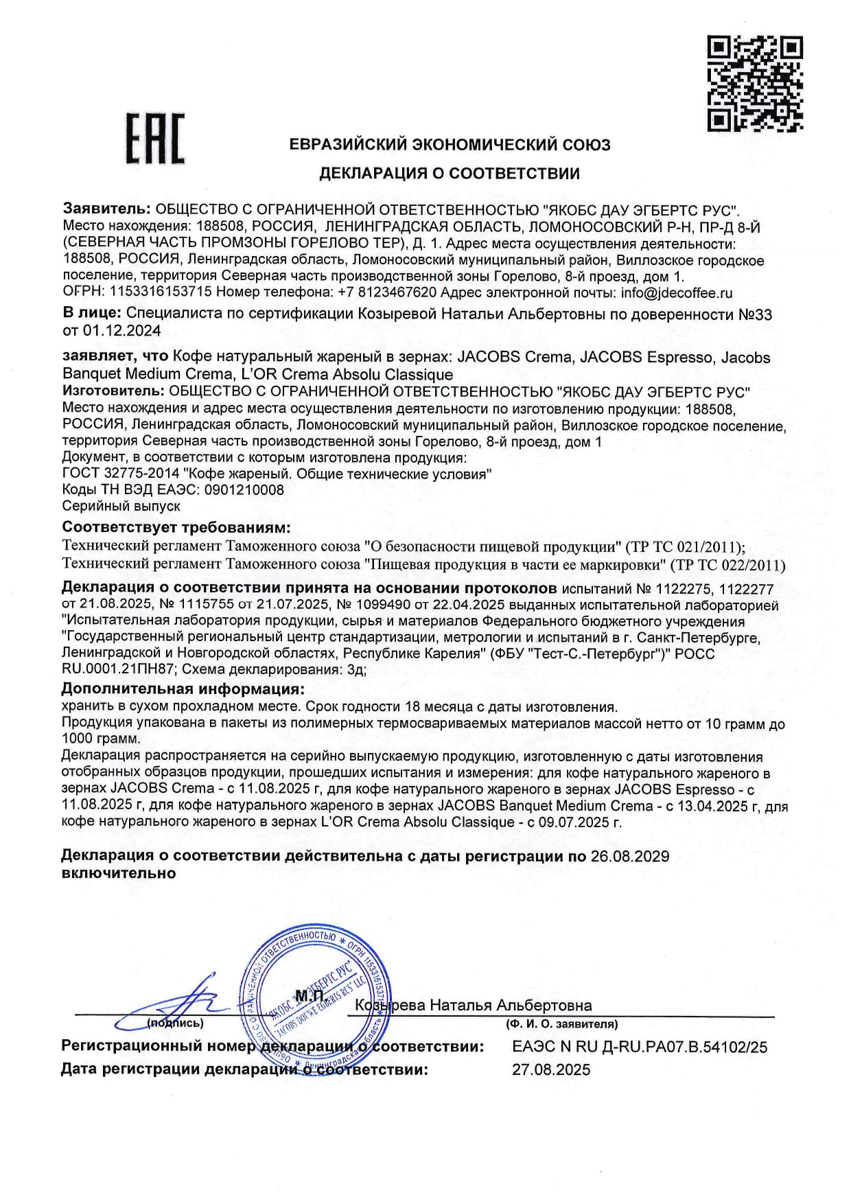 Кофе в зернах L’OR "Crema Absolu Classique" 1 кг Код товара: 622078 3 551,89 ₽ Купить Производитель:L’OR В великолепном вкусе L’OR CLASSIQUE проявляются пикантные нотки кофейных зерен средней обжарки. Это сдержанная элегантность, которая никогда не выходит из моды. Производство: РоссияМасса нетто: 1000 гСтепень обжарки: средняяТип кофе: зерновойСрок годности: 12 мес.Вкус: Crema Absolu ClassiqueСерия: Crema Absolu ClassiqueФирма-производитель: ООО "Якобс Дау Эгбертс Рус"Упаковка: вакуумный пакетСрок годности: 30 месВес: 1,1 кгРазмер упаковки: 9.2 × 29.9 × 18.1 смОбъём: 0.0057 м3Промежуточная упаковка: 4 штТранспортная упаковка: 4 штШтрих-код: 4607001778943 Сертификат-1.jpg Сертификат-2.jpg Сертификат-3.jpg
