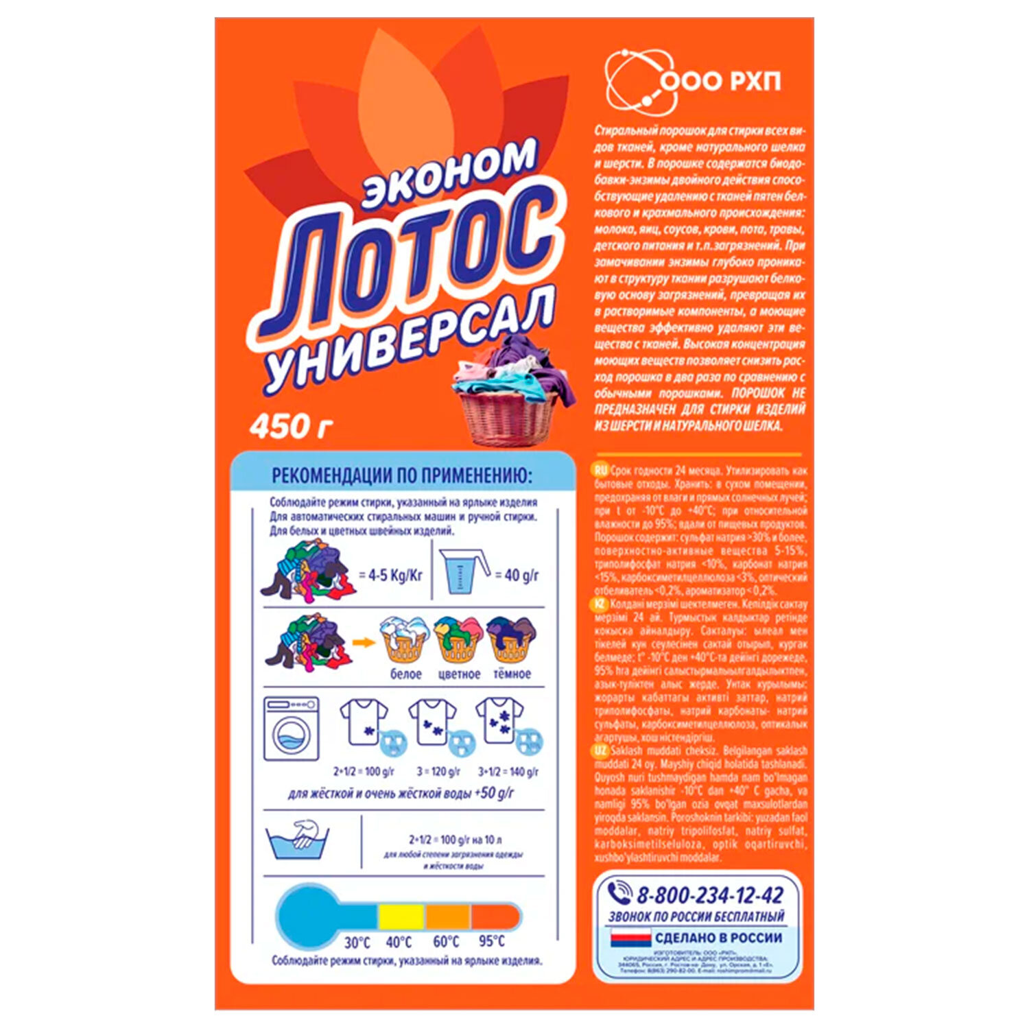 Стиральный порошок универсальный 450 г, ЛОТОС Код товара: 600638 56,84 ₽ Купить Производитель:ЛОТОС Предназначен для стирки и замачивания изделий из хлопчатобумажных, льняных, синтетических тканей, кроме изделий из шерсти и натурального шелка. Наиболее эффективен при замачивании и кипячении. Пригоден для мытья стен,полов, кафеля и эмалированных изделий. Состав: ПАВ, триполифосфат натрия, карбонат натрия, сульфат натрия, карбометилцелюлоза, оптический отбеливатель, ароматизатор.ТУ 2381-001-49794431-2012. Это товар эконом-сегмента, поэтому он отличается привлекательной ценой. Товар обладает базовым набором характеристик и простой упаковкой, при этом полностью соответствует основным требованиям потребителей.Производство: РоссияТип: универсальныйВес/Объем: 450 г/млВид средства: порошокНазначение: для цветного бельяОтдушка: свежестьТовар относится к сегменту ЭКОНОМ: даСерия: LAUNDRYВид упаковки: картонная коробкаСрок годности: 24 месВес: 479 грРазмер упаковки: 3.5 × 20.8 × 12.5 смОбъём: 0.0009 м3Промежуточная упаковка: 24 штТранспортная упаковка: 24 штШтрих-код: 4607117310037 Файлы Приложение-1.pdf Приложение-2.pdf Сертификат-1.jpg Сертификат-2.jpg