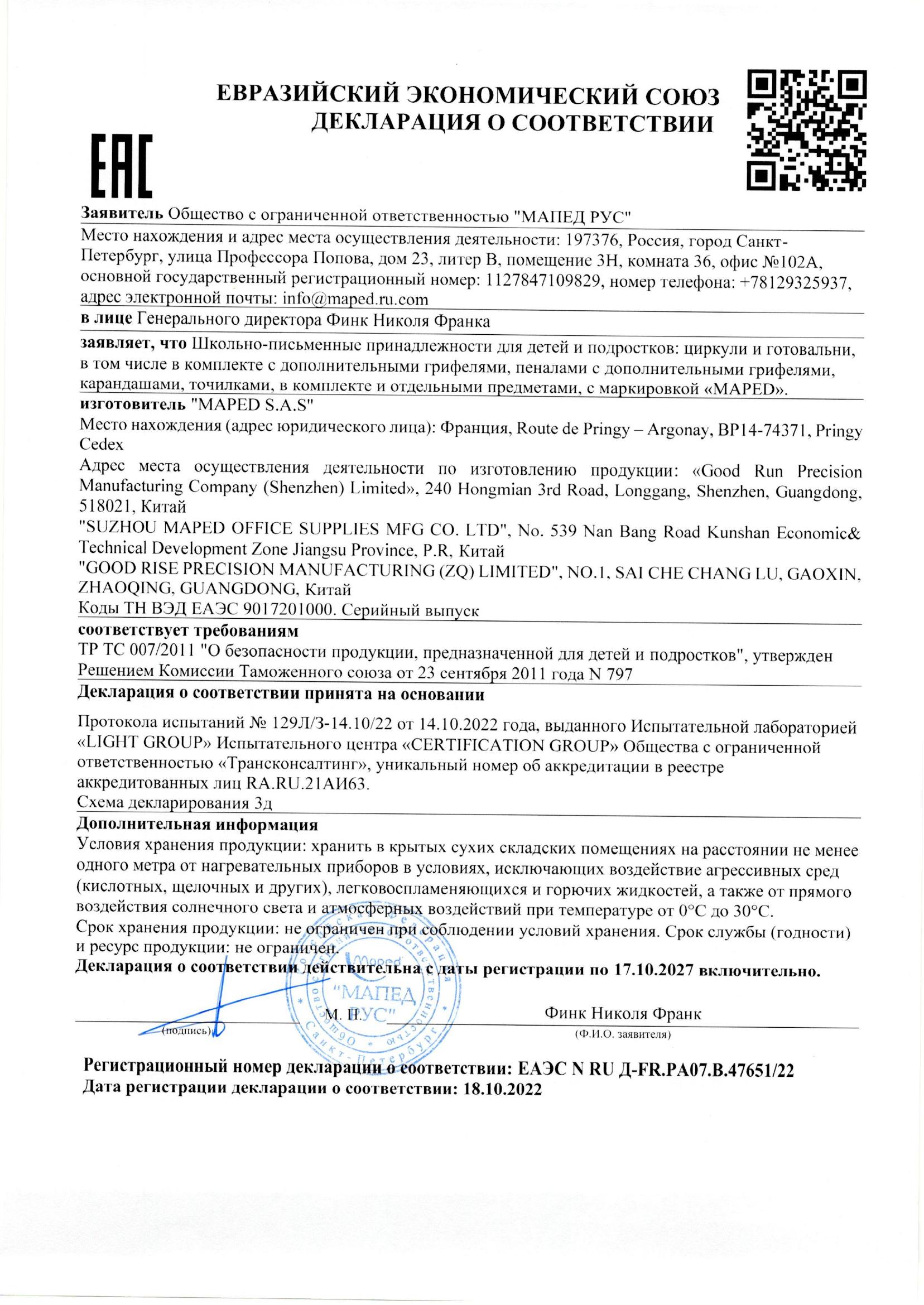 Готовальня MAPED (Франция) "Stop System", 3 предмета, ударопрочный пенал с европодвесом Код товара: 210362 667,39 ₽ Купить Производитель:MAPED Готовальня MAPED "Stop System" идеально подходит школьникам средней школы и студентам для чертёжных работ. Металлический циркуль из трех предметов поставляется в ударопрочном пенале с подвесом. Произведен с эксклюзивной инновацией, запатентованной Maped - "Стоп-система", которая позволяет фиксировать штанги циркуля в нужном положении. Чертит ровную окружность и прослужит долго. Штанги изготовлены из цинкового сплава. Длина циркуля - 12 см. В футляр встроена линейка (12 см). В комплекте: циркуль с грифелем, запасной грифель, точилка, отвёртка и ластик.Производство: КитайТип товара: готовальняСерия: Stop SystemКоличество предметов: 3 шт.Длина циркуля: 135 ммТип штанги: несгибаемыеСменный грифель: 0.7 ммСтоп-система: даКомплектация: держатель, пенал с запасным грифелем, циркульЦвет корпуса: разноцветныйМатериал: металлУпаковка: пластиковый пенал с европодвесомВес: 79 грРазмер упаковки: 1.9 × 17.5 × 5.6 смОбъём: 0.0003 м3Промежуточная упаковка: 10 штТранспортная упаковка: 120 штШтрих-код: 3154141961007 Сертификат-1.jpg Сертификат-2.jpg Сертификат-3.jpg