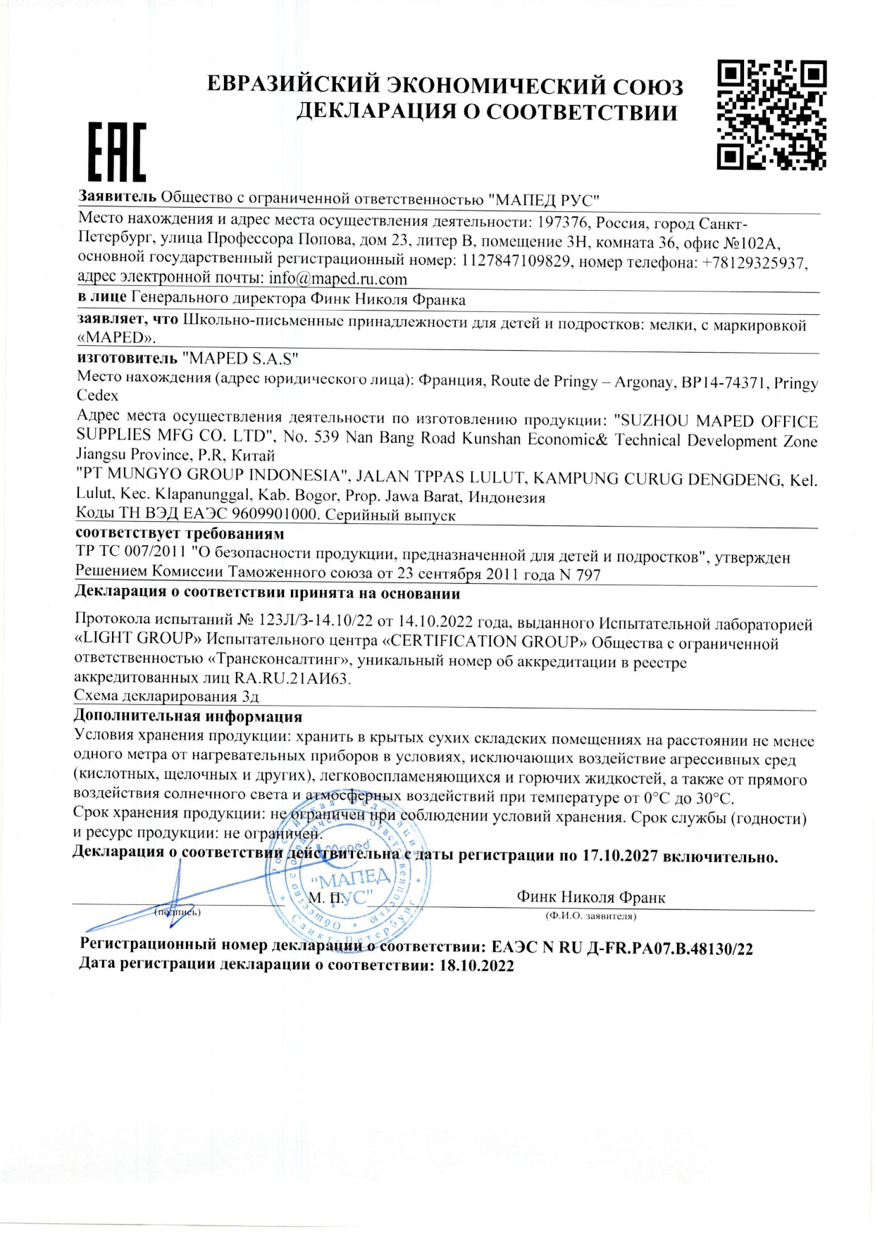 Мелки MAPED (Франция), набор 10 шт., белые, круглые, специальная формула "без пыли" Код товара: 223142 119,16 ₽ Купить Производитель:MAPED Белые круглые мелки высшего качества MAPED "White'Peps". Уникальная формула "без пыли": мелки не крошатся, не пачкают руки и одежду. Подходят для любых школьных досок. Твердый, прочный мел оставляет на доске чёткую линию и легко смывается водой. Не царапает поверхность. Продолговатый округлый корпус идеально "ложится" в руку.Производство: ИндонезияЦвет: белыйНазначение: для асфальта, для досокКоличество в упаковке: 10 шт.Количество цветов: 1Форма корпуса: круглаяСерия: White'PepsДлина: 79.8 ммДиаметр: 9.8 ммТвердость: средней твердостиФормула "без пыли": даУпаковка: картонная коробкаВес: 113 грРазмер упаковки: 2.4 × 8.6 × 5.1 смОбъём: 0.0001 м3Промежуточная упаковка: 10 штТранспортная упаковка: 160 штШтрих-код: 3154145935004 Сертификат-1.jpg Сертификат-2.jpg Сертификат-3.jpg
