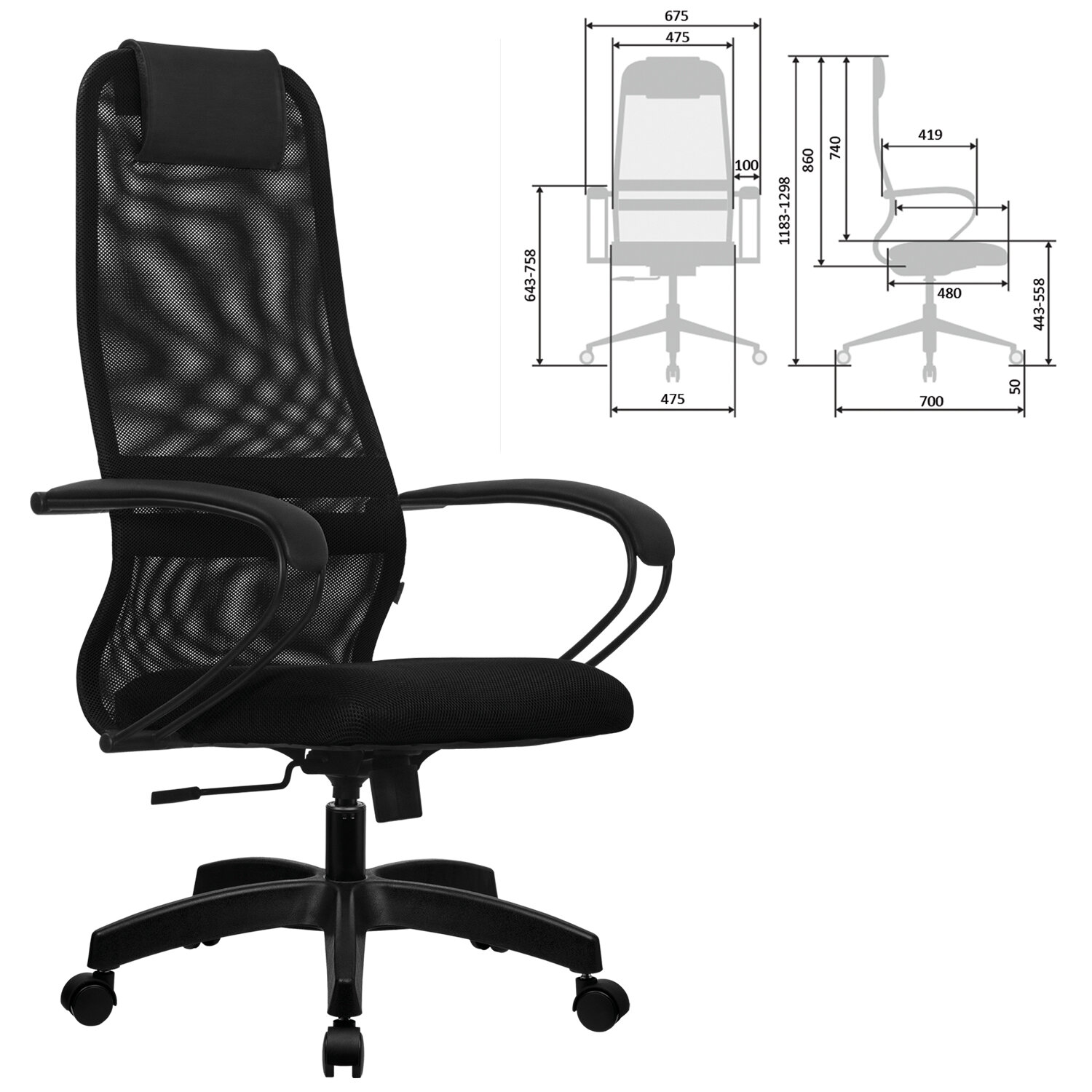 Кресло офисное МЕТТА "SU-B-8" пластик, ткань-сетка, сиденье мягкое, черное Код товара: 532432 10 017,96 ₽ Купить Производитель:МЕТТА Наиболее популярная, классическая модель офисных кресел МЕТТА. Сочетает в себе высокую надежность, эргономику, соответствующую анатомической форме человека, современный дизайн и максимальный комфорт по доступной цене. Спинка высокая, эргономичной формы с ярко выраженной поясничной поддержкой. Спинка имеет сверхпрочный стальной каркас с износостойким полимерным покрытием черного цвета. Спинка снабжена мягким комфортным подголовником. Сиденье средней жесткости, объемное на столярном каркасе. Обивка из износоустойчивой "дышащей" сетчатой ткани. Подлокотники стальные классические, с мягкими накладками из экокожи. Прочное пластиковое пятилучие. Модель оснащена механизмом качания "Top-Gun" с регулировкой под вес и возможностью фиксации в рабочем положении.Производство: РоссияМатериал обивки: ткань/сеткаМаксимальная нагрузка: до 120 кгЦвет обивки: черныйТип механизма кресла: "Топ-ган" - качание с регулировкой под вес и фиксацией в 1 положенииСетчатая спинка: даКрестовина (пятилучие): пластикПодлокотники: металл с накладкамиМинимальная высота кресла: 1183 ммМаксимальная высота кресла: 1298 ммШирина кресла: 675 ммМинимальная высота до сиденья: 443 ммМаксимальная высота до сиденья: 558 ммСиденье ширина: 475 ммСиденье глубина: 480 ммСпинка ширина: 475 ммСпинка высота: 860 ммСерия: SU-8Соответствует требованиям ГОСТа: ГОСТ 19917-93Поставляется в разобранном виде: даВес: 14,99 кгРазмер упаковки: 91 × 68.5 × 25 смОбъём: 0.1558 м3Промежуточная упаковка: 1 штТранспортная упаковка: 1 штШтрих-код: 4665312471632 Файлы Приложение-1.pdf Приложение-2.pdf Приложение-3.pdf Сертификат-1.jpg Сертификат-2.jpg Сертификат-3.jpg Сертификат-4.jpg