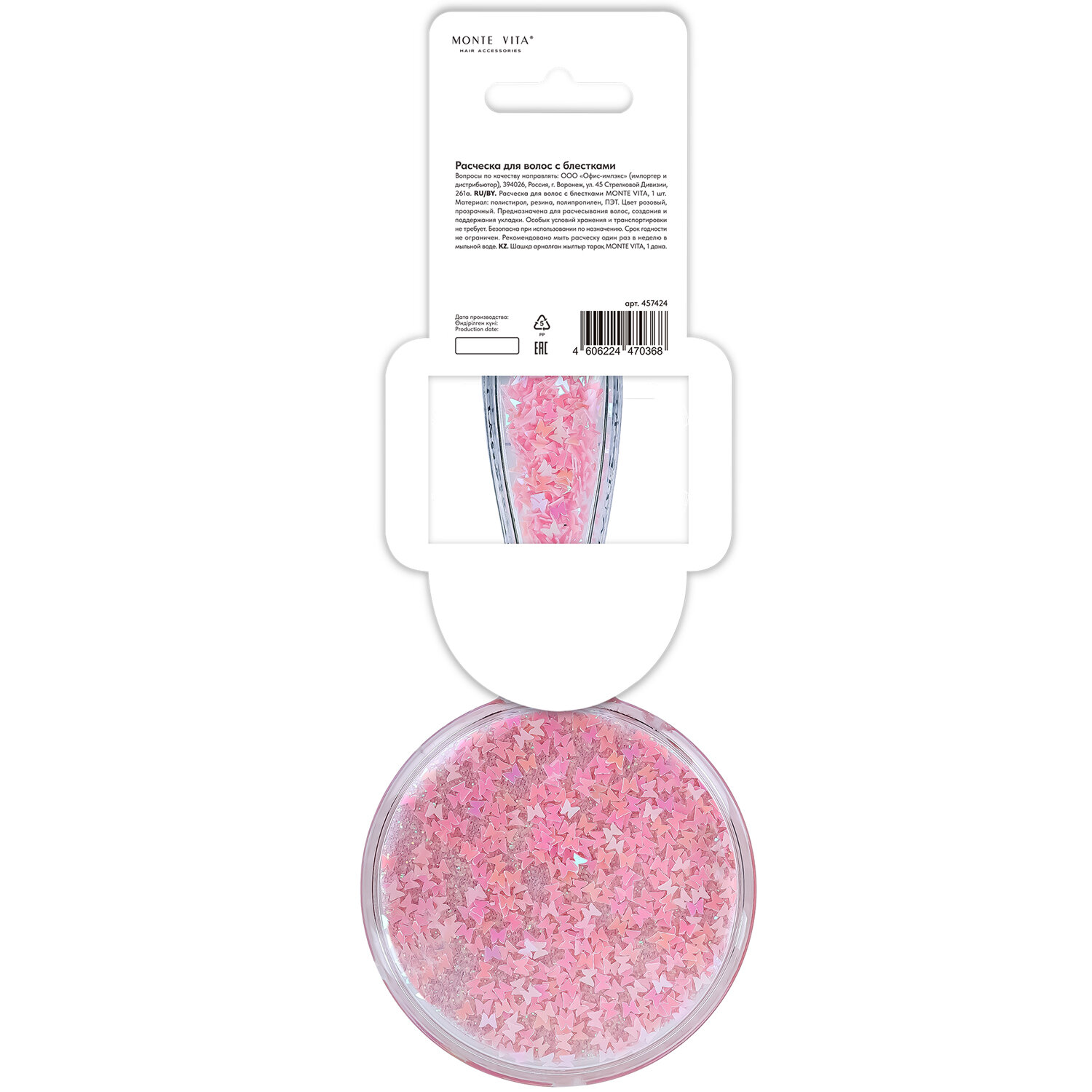 Расческа для волос массажная 15х7 см, с блестками прозрачный/розовый, MONTE VITA (МОНТЕ ВИТА), 457424 Код товара: 457424 218,93 ₽ Купить Производитель:MONTE VITA Расческа MONTE VITA – это не просто аксессуар, а незаменимый инструмент для ухода за волосами. Применяется для массажа головы, расчесывания волос, создания прически. Эффектная прозрачная расческа со стильными блестками. Изготовлена из прочного полистирола, который сохраняет прозрачность и блеск на долгое время. Мягкие закругленные зубчики обеспечивают бережное расчесывание без царапин на коже головы и минимальное воздействие на волосы, предотвращая сечение кончиков. Яркий дизайн поднимает настроение, а компактный формат делает расческу незаменимым аксессуаром для быстрой коррекции прически.Производство: КитайТип расчески: массажнаяНазначение: массаж, разглаживаниеМатериал: полистирол/резинаЦвет: прозрачный/розовыйСостав набора: массажная расческаРазмер: 15х7 смСерия: РасческиУпаковка: пластиковая карточка с европодвесомВес: 62 грРазмер упаковки: 3.9 × 21.2 × 7.2 смОбъём: 0.0004 м3Промежуточная упаковка: 6 штТранспортная упаковка: 144 штШтрих-код: 4606224470368 Файлы Сертификат-1.jpg Сертификат-2.jpg Сертификат-3.jpg Сертификат-4.jpg
