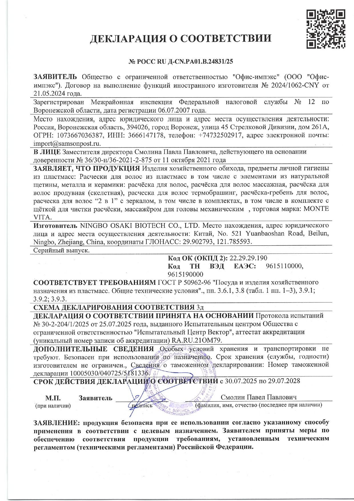 Расческа для волос массажная "2 в 1", 6,5 см с зеркалом, компактная цвета АССОРТИ, MONTE VITA (МОНТЕ ВИТА), 457425 Код товара: 457425 101,95 ₽ Купить Производитель:MONTE VITA Расческа MONTE VITA – это не просто аксессуар, а незаменимый инструмент для ухода за волосами. Применяется для массажа головы, расчесывания волос, создания прически. Практичная складная мини-расческа с зеркалом. Прочный корпус из ABS-пластика надежно защищает встроенное круглое зеркальце и нейлоновую расческу на гибкой TPEE-подушечке. Несмотря на компактные размеры, расческа обладает достаточной плотностью зубчиков для эффективного распутывания и укладки волос средней длины и густоты. Идеальный аксессуар для путешествий, офиса и быстрой коррекции прически в любых условиях.Производство: КитайТип расчески: складнаяНазначение: массаж, разглаживаниеМатериал: ABS-пластик/нейлонЦвет: ассортиСостав набора: складная расческа с зеркаломРазмер: 6,5 смСерия: РасческиУпаковка: пластиковая карточка с европодвесомВес: 42 грРазмер упаковки: 2.8 × 7.5 × 6.5 смОбъём: 0.0002 м3Промежуточная упаковка: 12 штТранспортная упаковка: 120 штШтрих-код: 4606224470375 Файлы Сертификат-1.jpg Сертификат-2.jpg Сертификат-3.jpg Сертификат-4.jpg