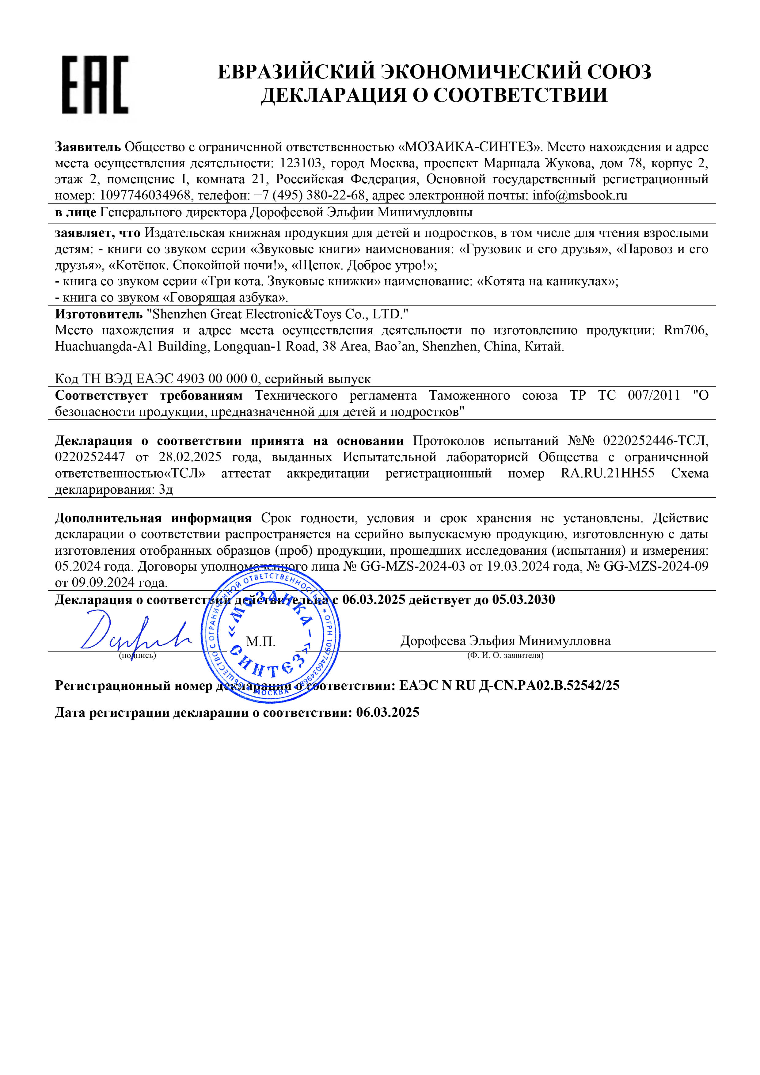 Музыкальная говорящая книга, 12 стр., 22х22 см, АССОРТИ, МОЗАИКА-СИНТЕЗ Код товара: 691183 988,9 ₽ Купить Производитель:МОЗАИКА-СИНТЕЗ Дети обожают звуковые книги – ведь так интересно нажимать на кнопки и слушать разные звуки. Музыкальная говорящая книга с красочными иллюстрациями и добрыми стихами станет любимой игрушкой вашего малыша, помогая ему познавать окружающий мир через игру. Каждое нажатие на кнопку – это новое открытие. Малыш с удовольствием будет нажимать на кнопки снова и снова, развивая мелкую моторику, слуховое восприятие и любознательность. Красочные иллюстрации с добрыми персонажами притягивают взгляд и надолго удерживают внимание. Книга прекрасно подходит для совместного чтения и игр, помогая вам весело и с пользой проводить время с ребенком. Книга имеет удобный для игры формат 22х22 см. Все материалы, включая звуковой блок, полностью безопасны для детей. Изделие сочетает качественную пластмассу с прочным картоном, что обеспечивает легкость и долговечность. Развивающая игрушка готова к использованию – в комплекте уже есть три батарейки LR1130.Производство: КитайФормат: 22х22Тип обложки: твердаяКоличество страниц: 12Тип скрепления: -Особенности: звуковой эелементВозраст: от 3 лет летСюжет: ассортиСерия: МОЗАИКА-СИНТЕЗВес: 361 грРазмер упаковки: 1.4 × 22.2 × 22.3 смОбъём: 0.0009 м3Промежуточная упаковка: 4 штТранспортная упаковка: 20 штШтрих-код: 9785431539855 Сертификат-1.jpg Сертификат-2.jpg Сертификат-3.jpg