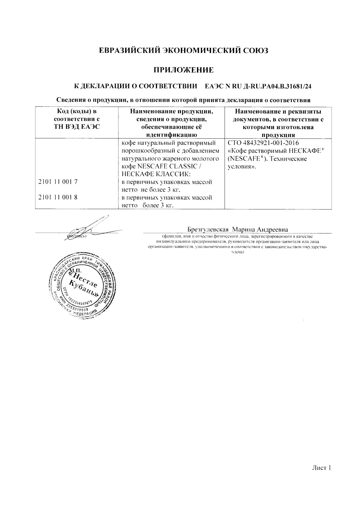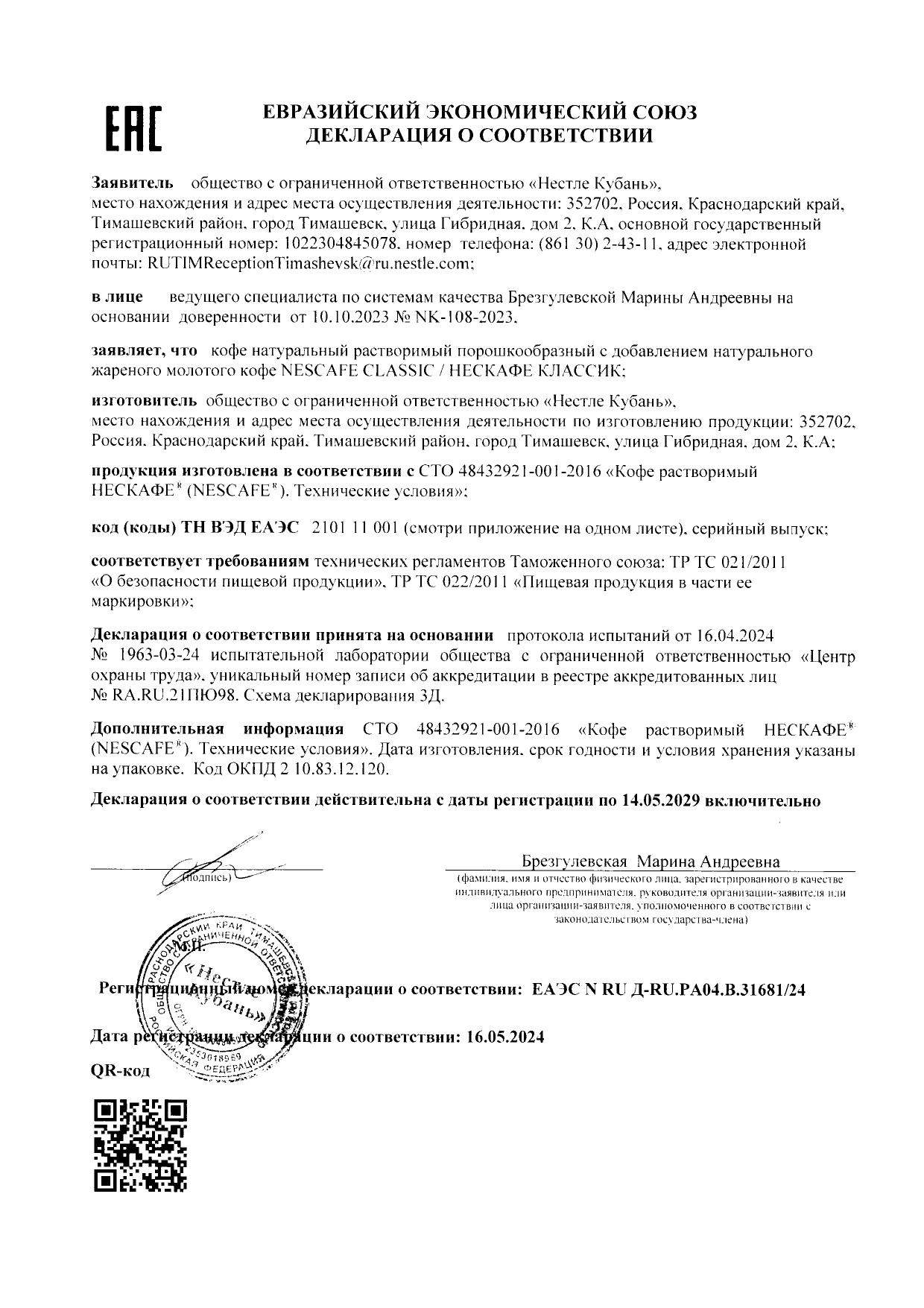 Кофе растворимый NESCAFE "Classic" 1 кг Код товара: 621072 2 993 ₽ Купить Производитель:NESCAFE Кофе NESCAFЕ CLASSIC – 100% натуральный кофе, приготовленный только из отборных кофейных зерен, которые были собраны на пике созревания, обжарены и сохранили легкую горчинку кофейных зерен. Начните день с глотка классики. Позвольте свежему вкусу и аромату NESCAFЕ Classic пробудить чувства и подготовить к новым открытиям. NESCAFЕ остается любимым брендом в мире кофе, который потребляют более чем в 180 странах. Каждую секунду по всему миру выпивается 5 500 чашек кофе NESCAFЕ. Большой формат упаковки NESCAFЕ Classic особенно удобен для употребления в офисах, ресторанах, отелях и вендинговых аппаратах.Производство: РоссияТип кофе: порошкообразныйСерия: NESCAFE ClassicВкус: ClassicВес: 1000 гУпаковка: пакетСрок годности: 18 месРазмер упаковки: 8.5 × 31.6 × 17.3 смОбъём: 0.0054 м3Промежуточная упаковка: 6 штТранспортная упаковка: 6 штШтрих-код: 4600680011691 Файлы Сертификат-1.jpg Сертификат-2.jpg Сертификат-3.jpg Сертификат-4.jpg
