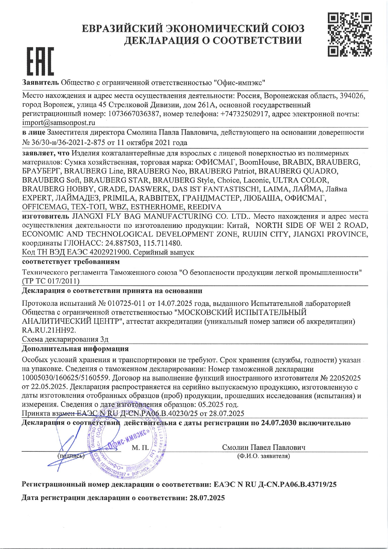 Сумка хозяйственная до 20 кг, 39x45x21 см, 4 ручки, глянцевая полиэстровая ткань, ОФИСМАГ Код товара: 700239 151,01 ₽ Купить Производитель:ОФИСМАГ Хозяйственная сумка ОФИСМАГ удобна и вместительна, не промокает и надежно защищает вещи от влаги. Предназначена для повседневного использования при покупках и транспортировке небольших грузов. Незаменима при переезде, в магазинах, на ярмарках и рынках. Хозяйственная сумка ОФИСМАГ изготовлена из высококачественного плотного переработанного материала ПЭТ плотностью 110 г/м2. Сумка сочетает в себе экологичность, прочность, стиль и практичность. Подходит для вторичной переработки. Основные характеристики: Размер: 39х45х21 см. Объем: 37 л. Материал: переработанный полиэстер. Грузоподъемность: до 20 кг. Цвет: комбинация красного и белого. Основные преимущества: - 4 ручки для максимального удобства при использовании. - Отстрочка по периметру гарантирует дополнительную прочность и придает сумке аккуратный вид. - Нагрузка до 20 кг позволяет поместить в сумку большое количество вещей разного размера и веса и сохранить их в целости при переезде, совершении покупок, переноске грузов. Долговечна и практична в использовании.Производство: КитайОбъем: 37 лМатериал: ПЭТПлотность материала: 110 г/м2Отстрочка по периметру: даЗастежка: нетВысота: 39 смШирина: 45 смГлубина: 21 смЦвет: красныйВес: 104 грРазмер упаковки: 0.5 × 45.9 × 37.8 смОбъём: 0.0006 м3Промежуточная упаковка: 100 штТранспортная упаковка: 100 штШтрих-код: 4606224472171 Сертификат-1.jpg Сертификат-2.jpg Сертификат-3.jpg
