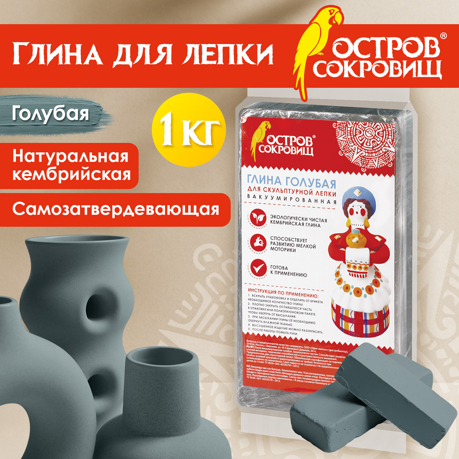 Глина для лепки голубая ОСТРОВ СОКРОВИЩ, 1 кг, вакуумированная, готовая, размачиваемая Код товара: 227138 160,17 ₽ Купить Производитель:ОСТРОВ СОКРОВИЩ Экологически чистая кембрийская глина ОСТРОВ СОКРОВИЩ, добываемая в России на Чкаловском месторождении, идеально подойдет для художественной и скульптурной лепки. Способствует развитию мелкой моторики, творческих способностей и пространственного мышления. Безопасный экологичный продукт, не вызывает аллергической реакции. Благодаря самозатвердевающему свойству изделия сохнут самостоятельно без участия высоких температур. Выполнена в голубом цвете, являющемся наиболее востребованным. Вес - 1 кг. Хранить неиспользуемую часть глины в полиэтилене или обернуть мокрой тканью для предотвращения ее засыхания. В случае засыхания глину также необходимо обернуть мокрой тканью до момента ее размягчения.Производство: РоссияКоличество цветов в наборе: 1 шт.Серия: Глина классическаяТип: вакуумированнаяВид: мягкийОтвердевающий: даДля запекания: даЦвет: голубойУпаковка: полиэтиленВес: 1000 гРазмер упаковки: 5.6 × 13.9 × 8.4 смОбъём: 0.0008 м3Промежуточная упаковка: 20 штТранспортная упаковка: 20 штШтрих-код: 4606224177267 Файлы Сертификат-1.jpg Сертификат-2.jpg Сертификат-3.jpg Сертификат-4.jpg Сертификат-5.jpg Сертификат-6.jpg Сертификат-7.jpg Сертификат-8.jpg Сертификат-9.jpg Сертификат-10.jpg Сертификат-11.jpg Сертификат-12.jpg Сертификат-13.jpg Сертификат-14.jpg Сертификат-15.jpg Сертификат-16.jpg Сертификат-17.jpg Сертификат-18.jpg Сертификат-19.jpg Сертификат-20.jpg Сертификат-21.jpg Сертификат-22.jpg Сертификат-23.jpg Сертификат-24.jpg Сертификат-25.jpg Сертификат-26.jpg