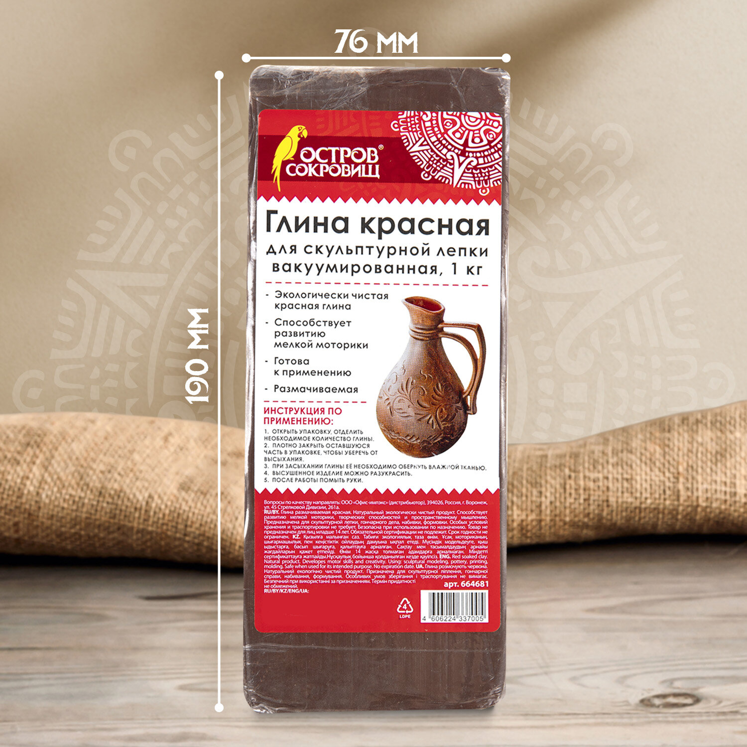 Глина для лепки красная ОСТРОВ СОКРОВИЩ, 1 кг, готовая, размачиваемая Код товара: 664681 139,59 ₽ Купить Производитель:ОСТРОВ СОКРОВИЩ Экологически чистая красная глина ОСТРОВ СОКРОВИЩ идеально подойдет для скульптурной лепки, гончарного дела, набивки, формовки. Способствует развитию мелкой моторики, творческих способностей и пространственного мышления. Безопасный экологичный продукт, не вызывает аллергической реакции. Благодаря самозатвердевающему свойству изделия сохнут самостоятельно без участия высоких температур. Обожженные изделия можно использовать в бытовых целях (например, в качестве посуды). Глина в красном цвете является наиболее востребованной. Вес - 1 кг. Хранить неиспользуемую часть глины в полиэтилене или обернуть мокрой тканью для предотвращения ее засыхания. В случае засыхания глину также необходимо обернуть мокрой тканью до момента ее размягчения.Производство: РоссияКоличество цветов в наборе: 1 шт.Серия: Глина классическаяТип: вакуумированнаяВид: мягкийОтвердевающий: даДля запекания: даЦвет: красныйУпаковка: полиэтиленВес: 1000 гРазмер упаковки: 5.2 × 14.8 × 7.8 смОбъём: 0.0007 м3Промежуточная упаковка: 20 штТранспортная упаковка: 20 штШтрих-код: 4606224337005 Сертификат-1.jpg Сертификат-2.jpg Сертификат-3.jpg