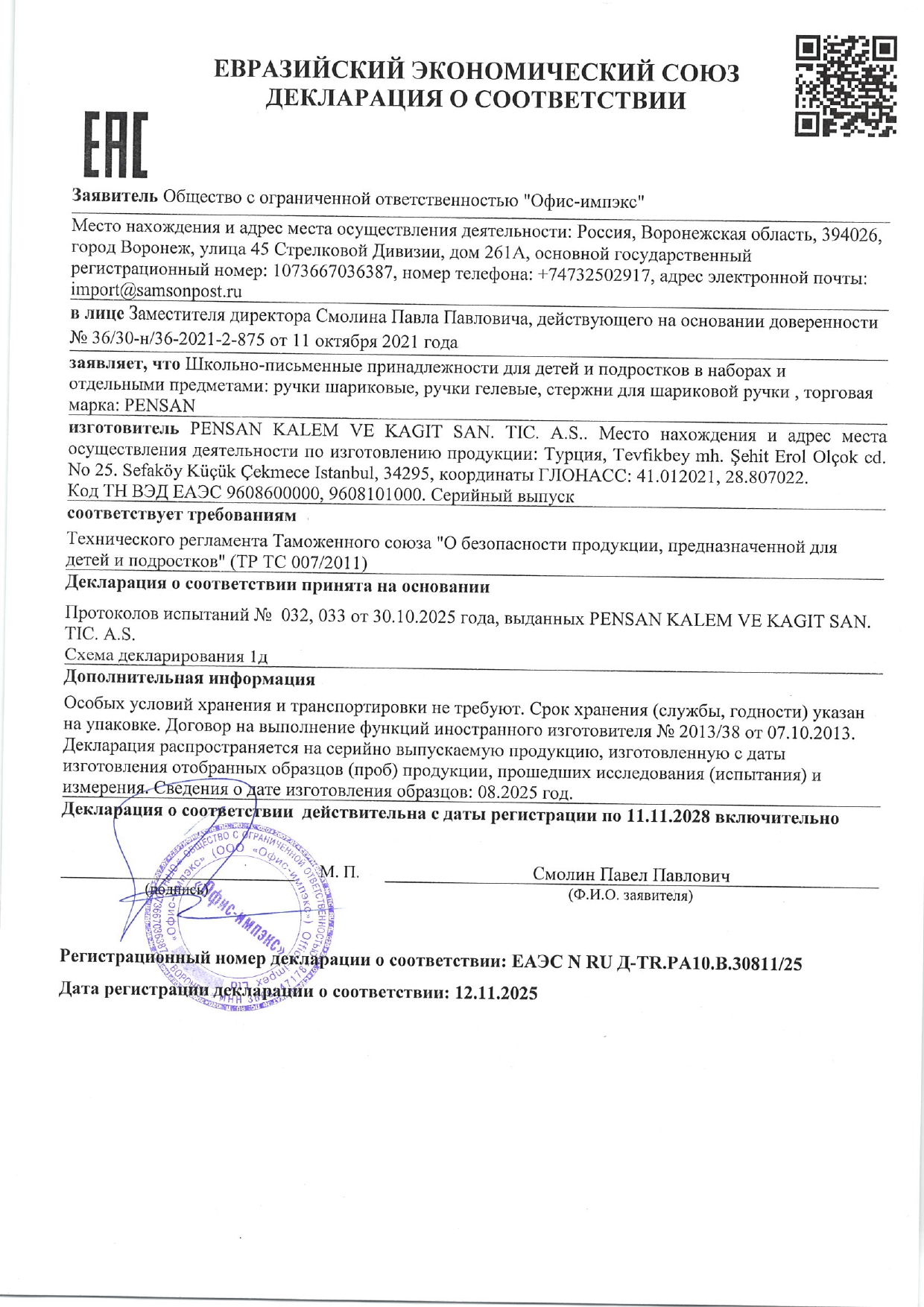 Ручка шариковая масляная PENSAN "Buro", СИНЯЯ, игольчатый узел 1 мм, линия письма 0,8 мм Код товара: 143833 35,28 ₽ Купить Производитель:PENSAN Шариковая ручка PENSAN "Buro" с масляными чернилами в классическом круглом корпусе из пластика в цвет чернил. Швейцарский никелево-серебряный игольчатый наконечник PREMEC (Швейцария) толщиной 1 мм обеспечит более качественное и долговечное письмо, а в совокупности с масляными чернилами пониженной вязкости гарантирует письмо без пропусков. Ширина линии письма - 0,8 мм. Цвет чернил - синий.Производство: ТурцияЦвет чернил: синийКоличество в комплекте: 1 шт.Толщина линии письма: 0.8 ммДиаметр пишущего узла: 1 ммЧернила на масляной основе: даФорма наконечника: игольчатыйДлина сменного стержня: 140 ммСерия: BuroСтиль: для офиса и учебыЭргономичная зона захвата: рифлениеЦвет корпуса: синийДлина письма: 1500 мДизайн: без дизайнаФорма корпуса: круглаяПокрытие корпуса: -Для левшей: даУпаковка: картонная коробкаСрок годности: 60 месВес: 7 грРазмер упаковки: 1 × 14.8 × 1.4 смПромежуточная упаковка: 50 штТранспортная упаковка: 2000 шт Сертификат-1.jpg Сертификат-2.jpg Сертификат-3.jpg