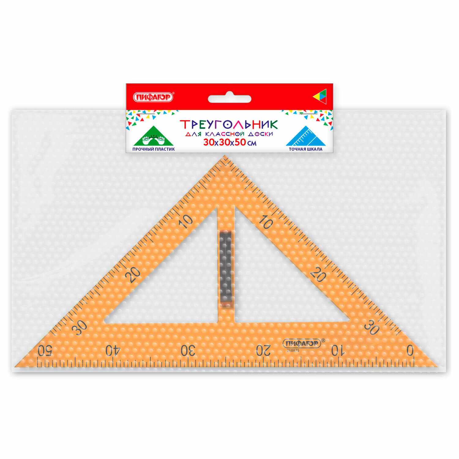Треугольник прямоугольный для классной доски, пластиковый 30х30х50 см, с держателем, ПИФАГОР Код товара: 210875 300,24 ₽ Купить Производитель:ПИФАГОР Пластиковый треугольник ПИФАГОР предназначен для выполнения чертежных работ на классных досках. Изготовлен из прочного пластика. Длина шкалы – 50 см, углы – 45° и 90°. Обладает четкой контрастной печатной разметкой. Цвет треугольника – оранжевый. Упакован в воздушно-пузырчатую пленку.Производство: КитайТип товара: треугольник 45° для классной доскиСерия: School boardКомплектация: треугольникШкала: 50 смУгол: 45°, 90°Наличие ручки: даМатериал: пластикУпаковка: воздушно-пузырчатая пленкаВес: 218 грРазмер упаковки: 1.9 × 40 × 40 смОбъём: 0.001 м3Промежуточная упаковка: 50 штТранспортная упаковка: 50 штШтрих-код: 4606224499734 Сертификат-1.jpg Сертификат-2.jpg