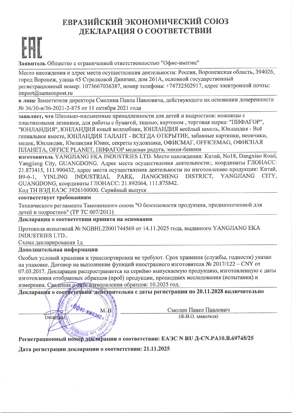 Ножницы ПИФАГОР "Тигренок", 120 мм, с безопасными пластиковыми лезвиями, оранжевые, картонная упаковка с европодвесом Код товара: 236858 132,31 ₽ Купить Производитель:ПИФАГОР Универсальные ножницы ПИФАГОР с фигурными ручками в виде тигренка идеально подойдут для детского творчества. Они абсолютно безопасны даже для самых маленьких. Ножницы ПИФАГОР предназначены для правшей. Ребенок без труда сможет ими воспользоваться, так как их длина всего 120 мм. Благодаря специальным пластиковым лезвиям с закругленными концами ножницы не повреждают кожу, волосы или одежду, режут только бумагу и картон. Изготовлены из прочного качественного пластика, что обеспечивает максимально долгий срок службы. Продаются в картонной упаковке с европодвесом.Производство: КитайДлина: 120 ммТип ножниц: универсальныеЗакругленные концы: даЦвет: оранжевыйДлина лезвий: 62 ммРучки: фигурныеС цветным рисунком на лезвиях: даМатериал ручек: пластикМатериал лезвия: пластикУпаковка: с европодвесомВес: 26 грРазмер упаковки: 1.1 × 15.5 × 6.5 смОбъём: 0.0001 м3Промежуточная упаковка: 24 штТранспортная упаковка: 288 штШтрих-код: 4606224180809 Сертификат-1.jpg Сертификат-2.jpg Сертификат-3.jpg