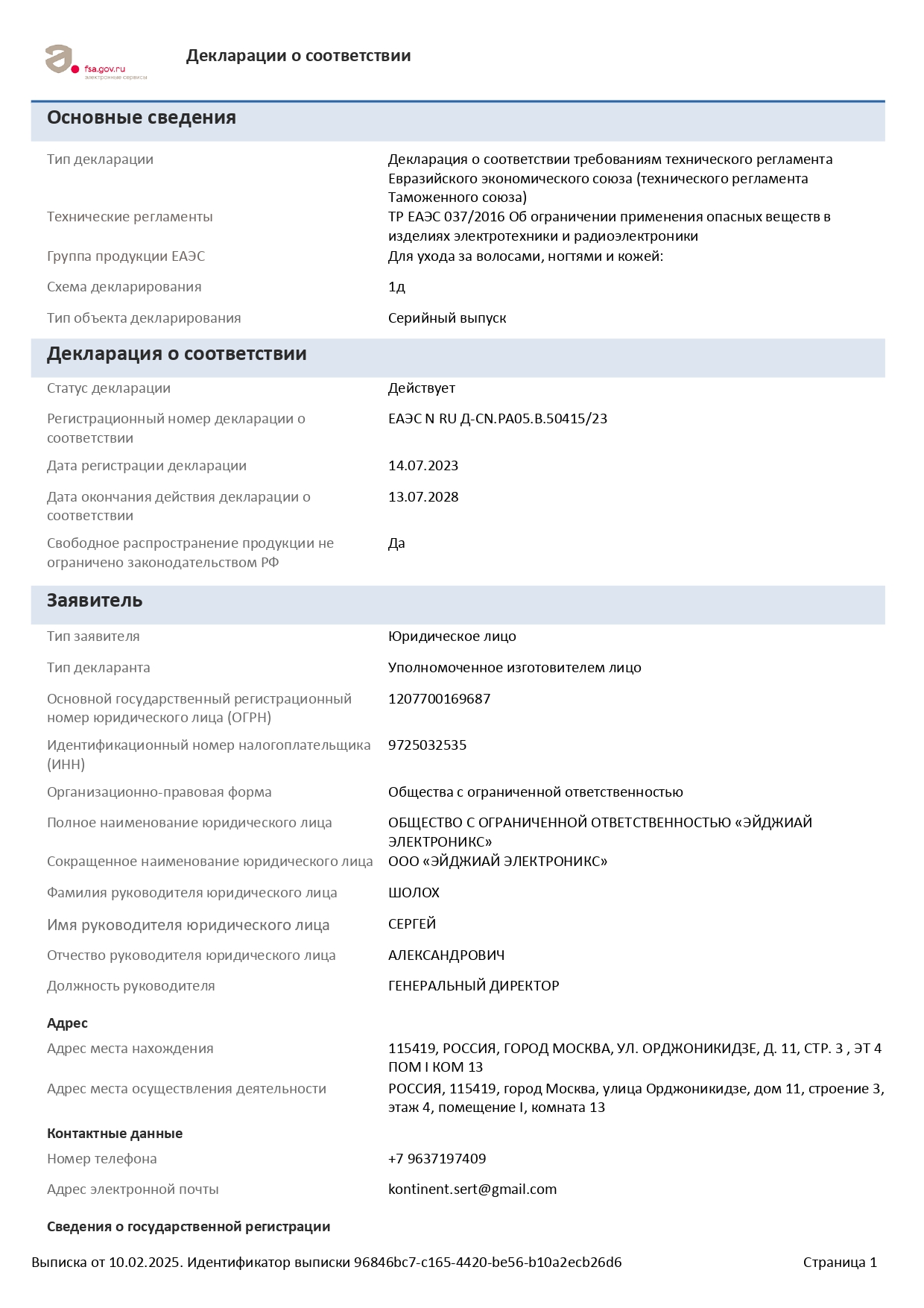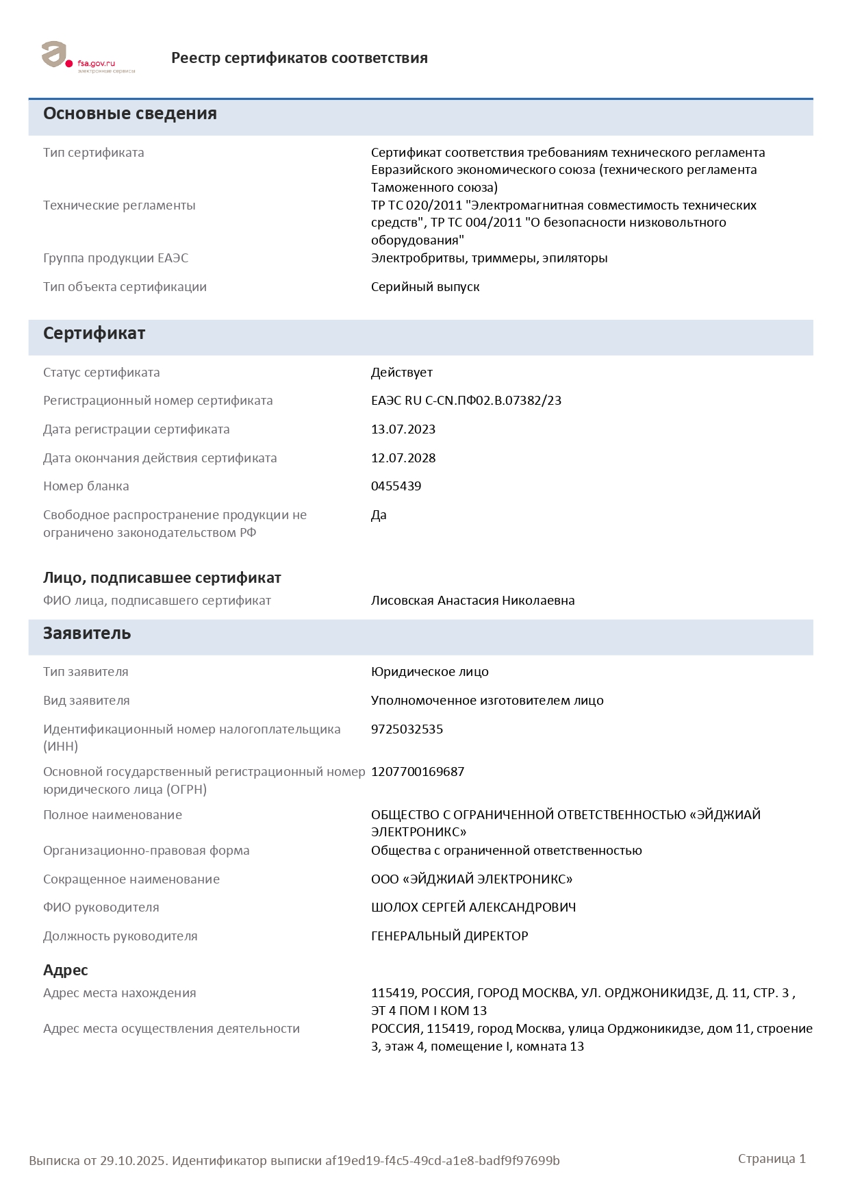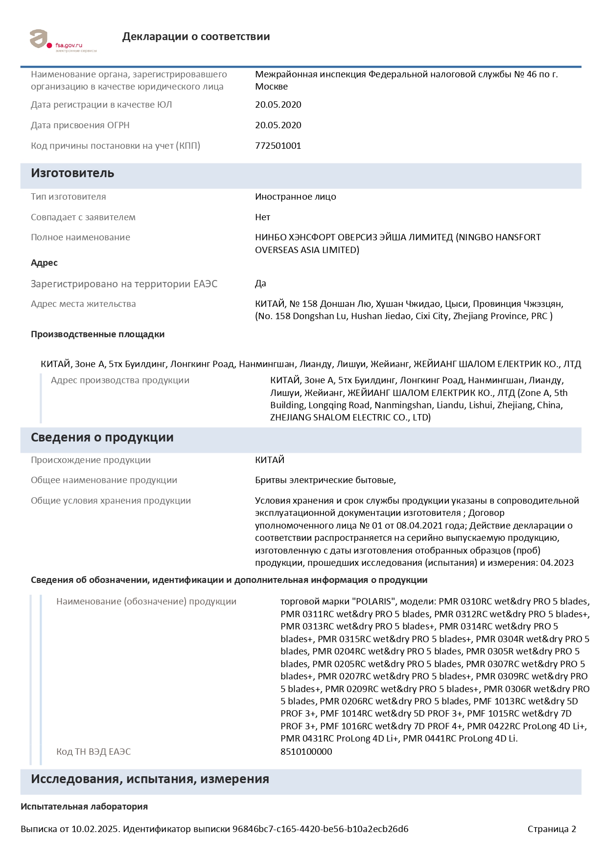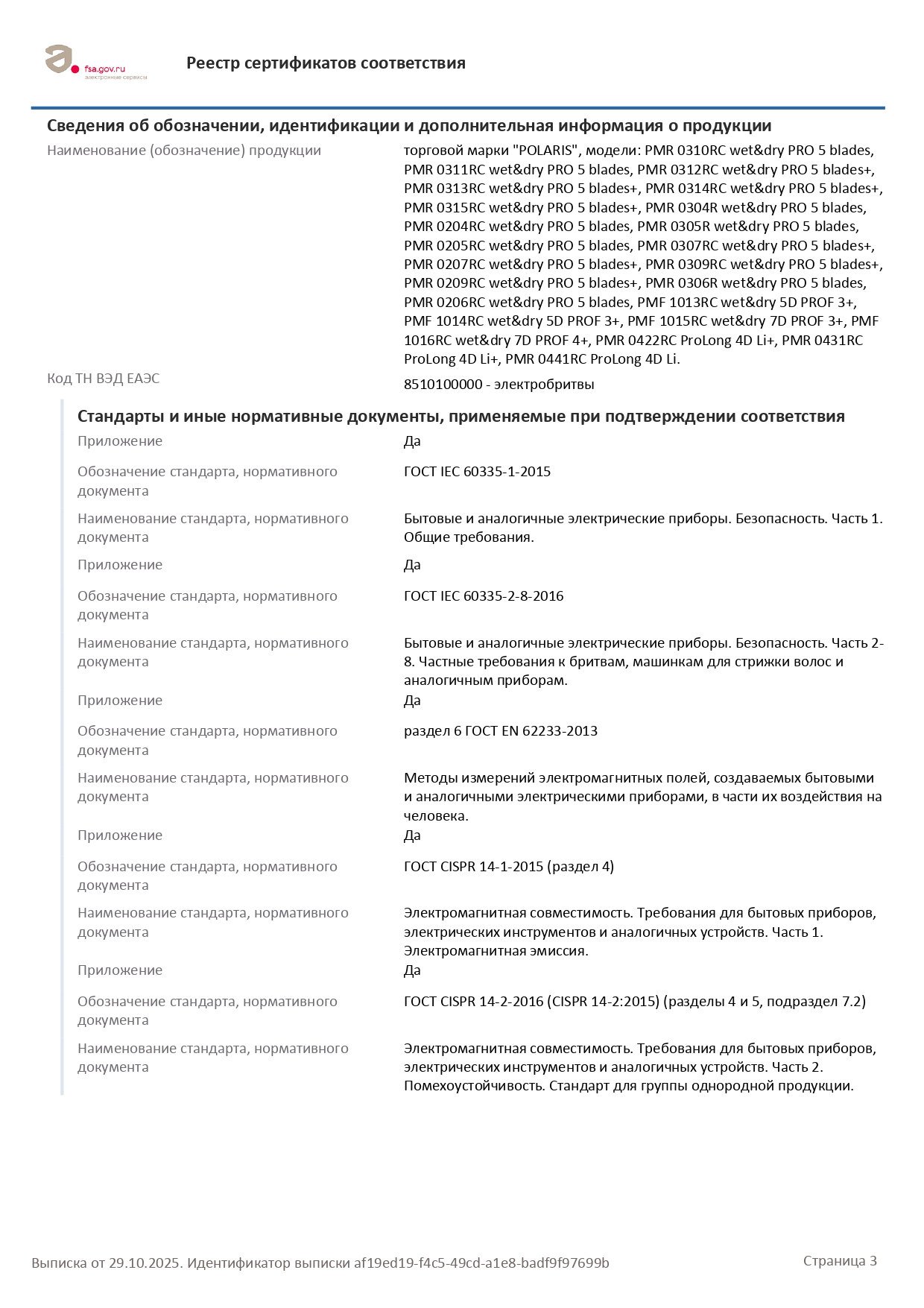 Электробритва POLARIS PMR 0305R PRO 5, 3 головки, аккумулятор, сухое и влажное бритье, черная, 51919 Код товара: 456716 2 736,43 ₽ Купить Производитель:POLARIS Электробритва Polaris PMR 0305R - это стильный и функциональный прибор, который станет незаменимым аксессуаром для мужчин, предпочитающих удобное и качественное бритье. Устройство предназначено для сухого и влажного бритья с одинаковым комфортом. Электробритва Polaris оснащена продуманной 4D-системой повторения контуров лица и уникальной конструкцией бритвенной насадки PRO 5 BLADES с супермягкими кольцами для гладкого скольжения без раздражения и плавающей конструкцией лезвий для точного повторения контура подбородка. Три плавающие роторные головки с высокоточными бритвенными лезвиями образуют двойной контур бритья, ускоряющий процесс, и обеспечивают максимально плотное прилегание к коже и позволяют добиться идеально гладкого бритья без раздражения. Высокоточные двойные лезвия обеспечивают чистое и быстрое бритье, а наличие встроенного триммера позволяет моделировать бороду и усы, а также подравнивать виски и бакенбарды. Радиальная заточка двойных лезвий не дает им забиваться на протяжении всего времени бритья. Лезвия из нержавеющей стали обладают высокой прочностью и долговечностью, гарантируя долгий срок службы прибора. Благодаря работе от аккумулятора электробритвой можно пользоваться даже в поездках и путешествиях, не завися от близости розетки. Время работы до 75 минут без подзарядки. Контролировать уровень заряда удобно благодаря дисплею с индикатором на корпусе бритвы. Полная зарядка батареи от нулевого показателя до 100% займет 90 минут. В комплекте с бритвой идет чехол, который упрощает хранение и перевозку электробритвы, а также защищает ее от пыли и загрязнений. Современный эргономичный дизайн и малый вес устройства делают его использование комфортным и приятным. Производитель оставляет за собой право без предварительного уведомления вносить изменения в технические характеристики, комплектацию и конструкцию, не ухудшающие эксплуатационные характеристики изделия.Производство: КитайМощность: 4 ВтКоличество бритвенных головок: 3 шт.Система бритья: роторная (вращательная)Возможность влажного бритья: даПромывка ножей под водой: даВстроенный триммер: даЭргономичный дизайн: даРабота от: аккумулятора, сетиВ комплекте: мягкий чехол, щеточка для чисткиЦвет: черныйВес: 520 грРазмер упаковки: 7.4 × 19.2 × 16.2 смОбъём: 0.0028 м3Промежуточная упаковка: 18 штТранспортная упаковка: 18 штШтрих-код: 5055539151919 Файлы Приложение-1.pdf Сертификат-1.jpg Сертификат-2.jpg Сертификат-3.jpg Сертификат-4.jpg Сертификат-5.jpg Сертификат-6.jpg Сертификат-7.jpg Сертификат-8.jpg Сертификат-9.jpg Сертификат-10.jpg Сертификат-11.jpg