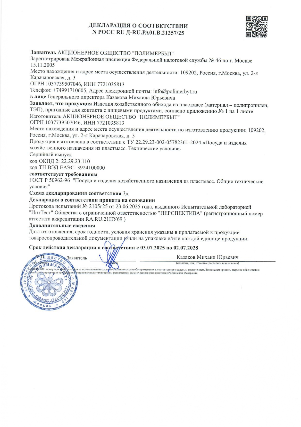 Ящик-контейнер 10 л с КРЫШКОЙ НА ЗАЩЕЛКАХ И РУЧКОЙ, 19х35х23 см, пластик, прозрачный, крышка ассорти, 810 Код товара: 530765 531,16 ₽ Купить Производитель:ПОЛИМЕРБЫТ Пластиковый контейнер - это вместительность, компактность, надежность, современный внешний вид. Плотная крышка не даст пыли проникнуть внутрь. Ручка на крышке позволяет переносить контейнер. Производство: РоссияТип товара: контейнерОбъем: 10 лНаличие крышки: даКоличество выдвижных секций: 0 шт.Количество ручек: 3 шт.Цвет корпуса: прозрачныйЦвет крышки: ассортиМатериал: пластикВысота: 19 смШирина: 23 смГлубина: 35 смВес: 431 грРазмер упаковки: 19 × 36.9 × 23.2 смОбъём: 0.0068 м3Промежуточная упаковка: 6 штТранспортная упаковка: 6 штШтрих-код: 4601532008104 Файлы Приложение-1.pdf Приложение-2.pdf Сертификат-1.jpg Сертификат-2.jpg Сертификат-3.jpg Сертификат-4.jpg