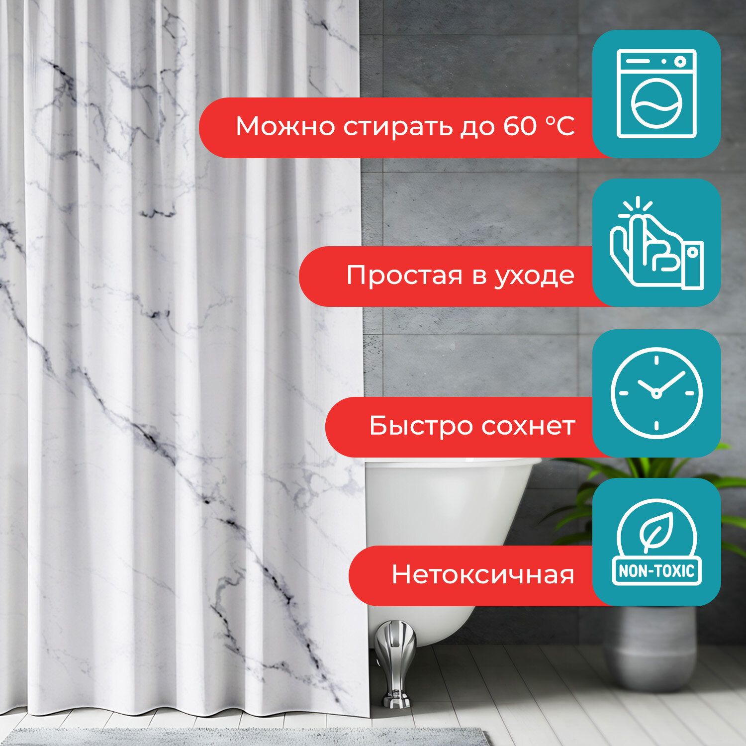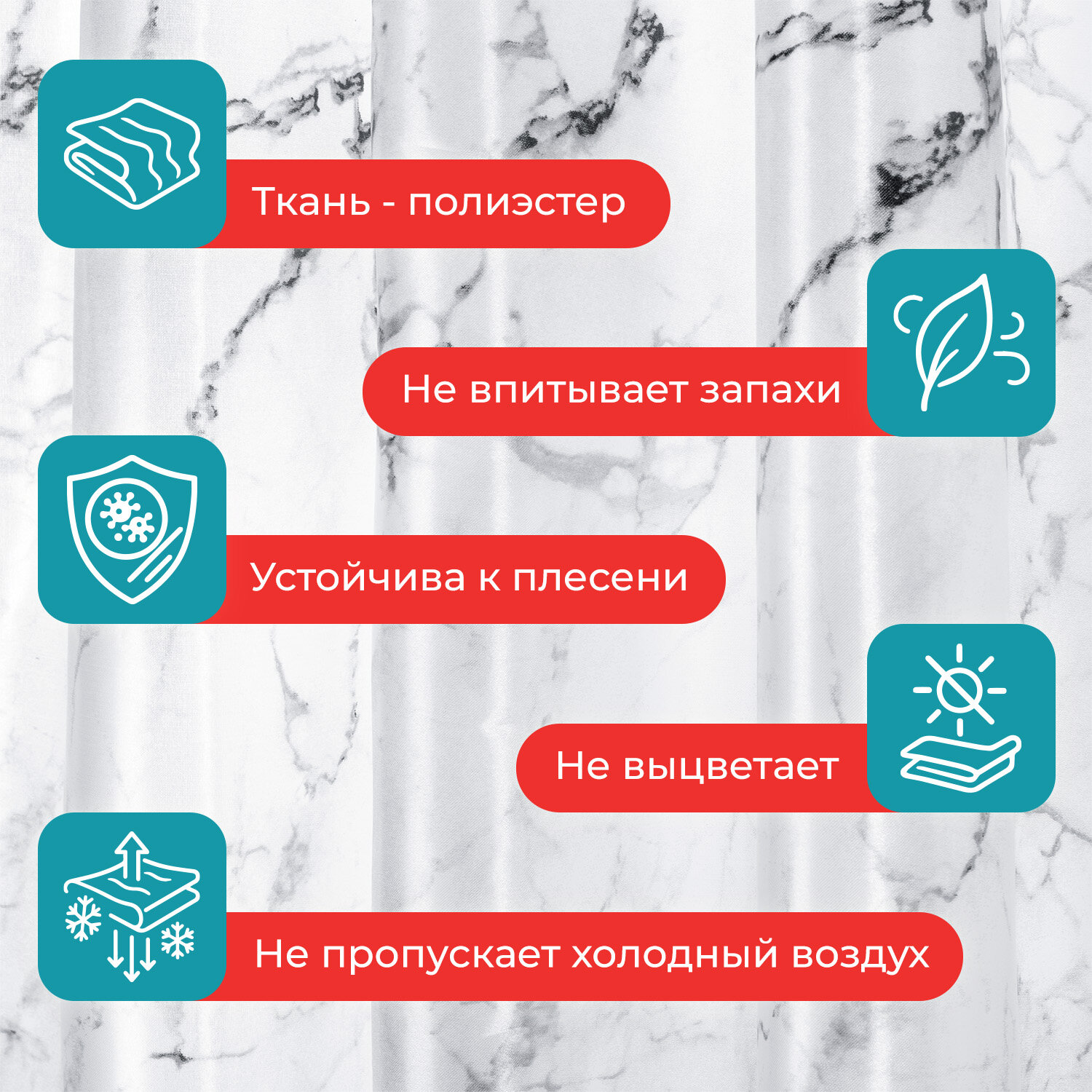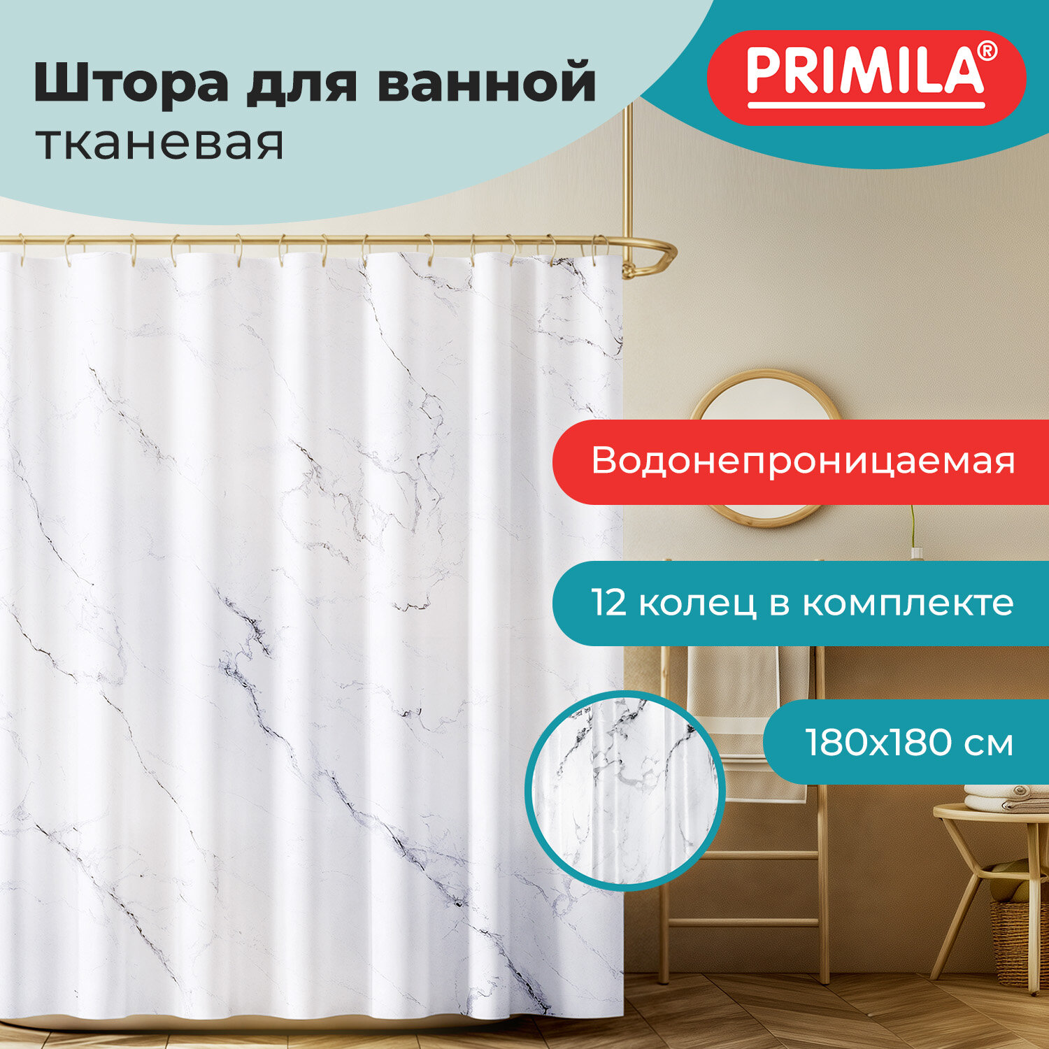 Шторка для ванной ПОЛИЭСТЕР, 180х180 см, кольца в комплекте, БЕЛЫЙ МРАМОР, PRIMILA (ПРИМИЛА) Код товара: 700079 499,13 ₽ Купить Производитель:PRIMILA Шторка для ванной комнаты PRIMILA – залог чистоты и уюта ванной комнаты. Используется для защиты пола, стен, мебели и зеркала от брызг. Эта шторка идеально впишется в любой интерьер. Шторка для ванной PRIMILA изготовлена из качественного, практичного, износостойкого полиэстера, что гарантирует отсутствие заломов и водостойкость. Быстро сохнет, не шуршит, без запаха и приятная на ощупь. Шторку можно стирать в стиральной машине при температуре до 60 °С. В комплекте с шторкой идут 12 прочных полипропиленовых колец, которые подойдут под любой тип карниза. • Основные характеристики: - Размер: 180х180 см. - Рисунок: белый мрамор. - Материал: полиэстер. - Плотность шторки: 80 г/м2. • Основные преимущества: - Устойчива к плесени. - Легко вписывается в любой интерьер. - Не требует сложного ухода. - Долговечна и практична в использовании. - Безопасна для здоровья.Производство: КитайРазмер (ДхШ): 180х180 смНаличие колец в комплекте: даВид принта: рисунокДизайн: Белый мраморВодонепроницаемая: даВодоотталкивающая: даОсобенности: Нет данныхПлотность материала: 80 г/м2Материал: полиэстерЦвет: белыйВес: 355 грРазмер упаковки: 2.4 × 30.6 × 23.5 смОбъём: 0.0013 м3Промежуточная упаковка: 72 штТранспортная упаковка: 72 штШтрих-код: 4606224466897 Сертификат-1.jpg Сертификат-2.jpg Сертификат-3.jpg