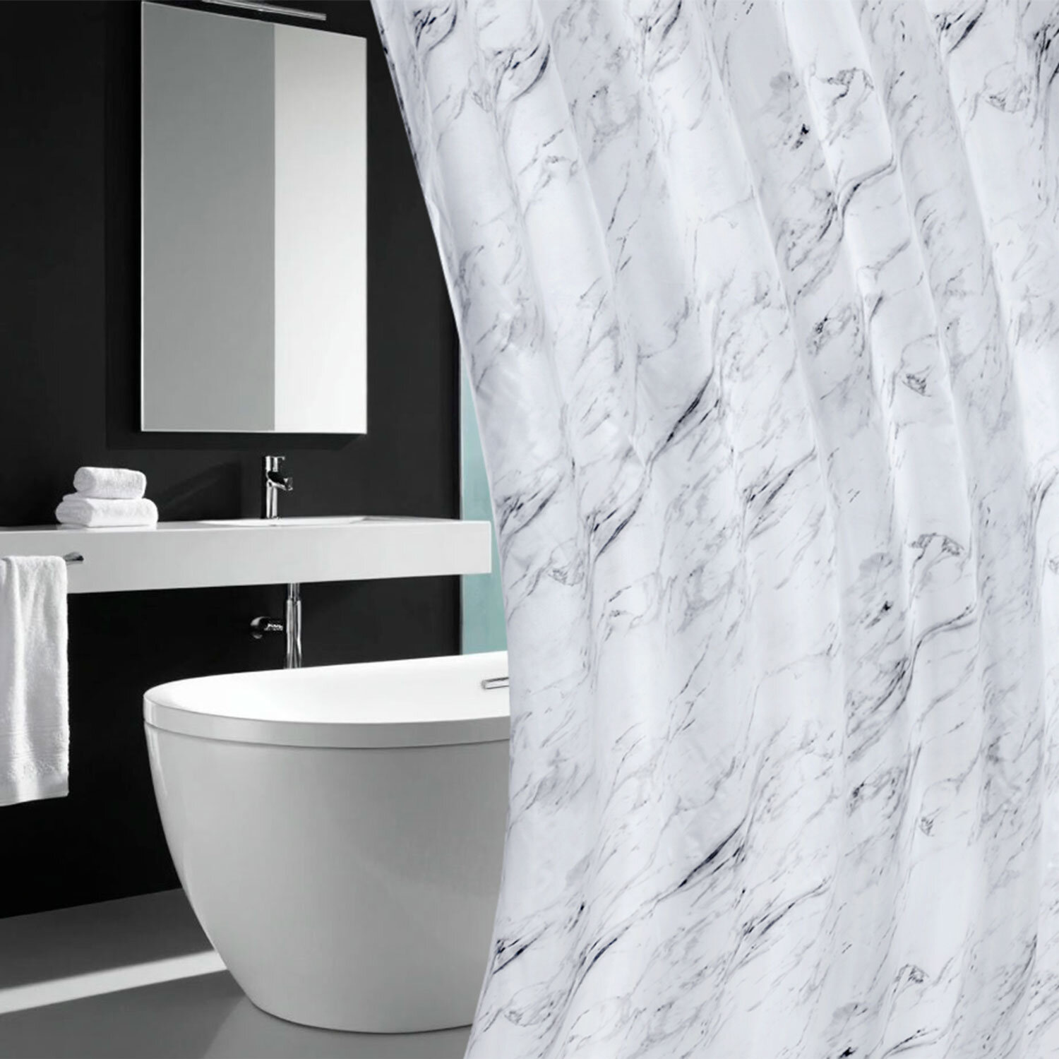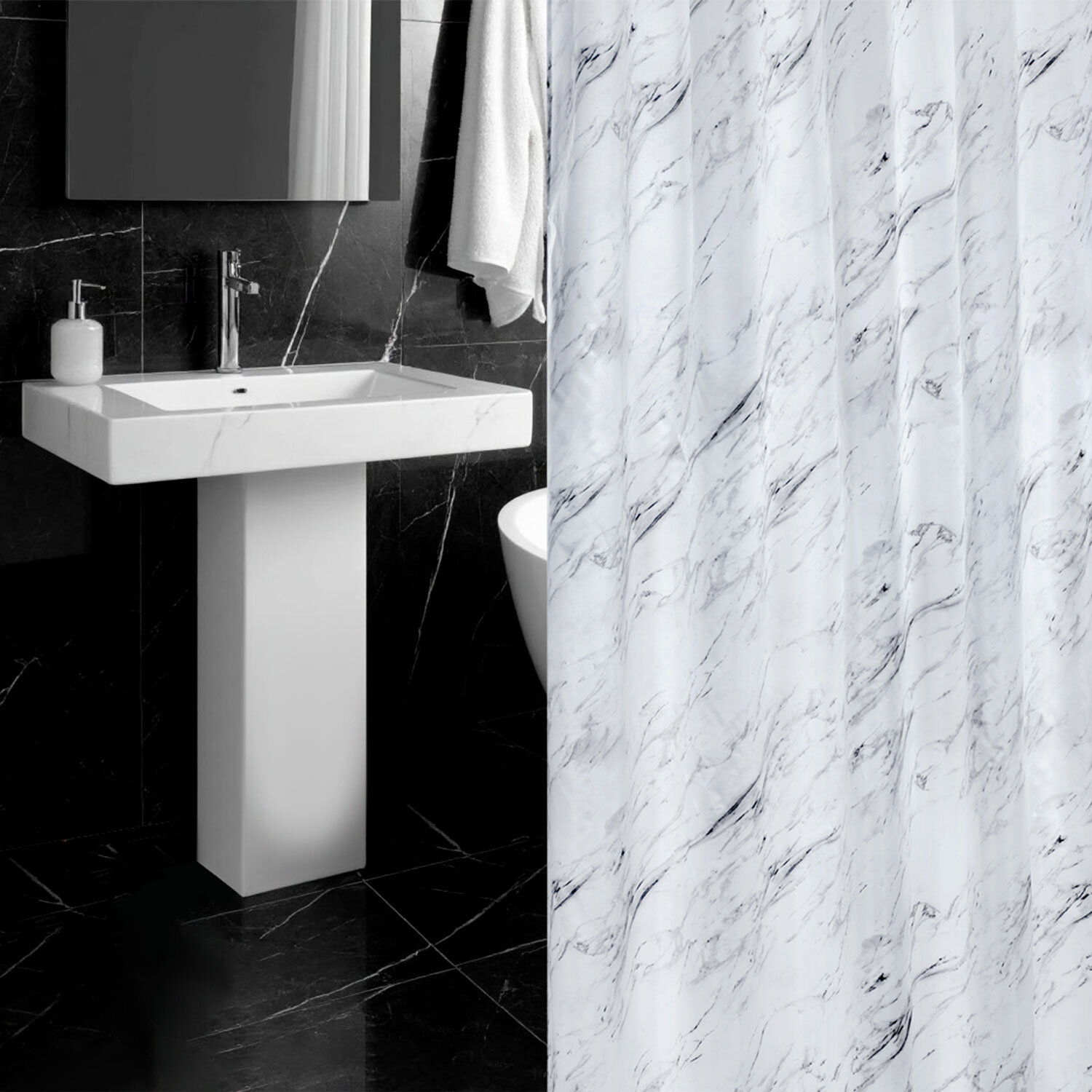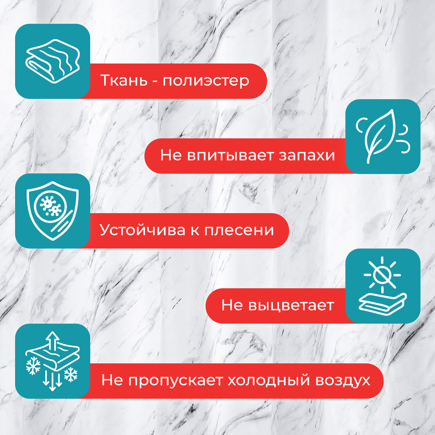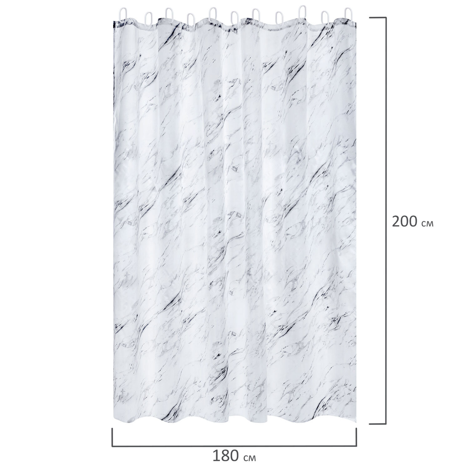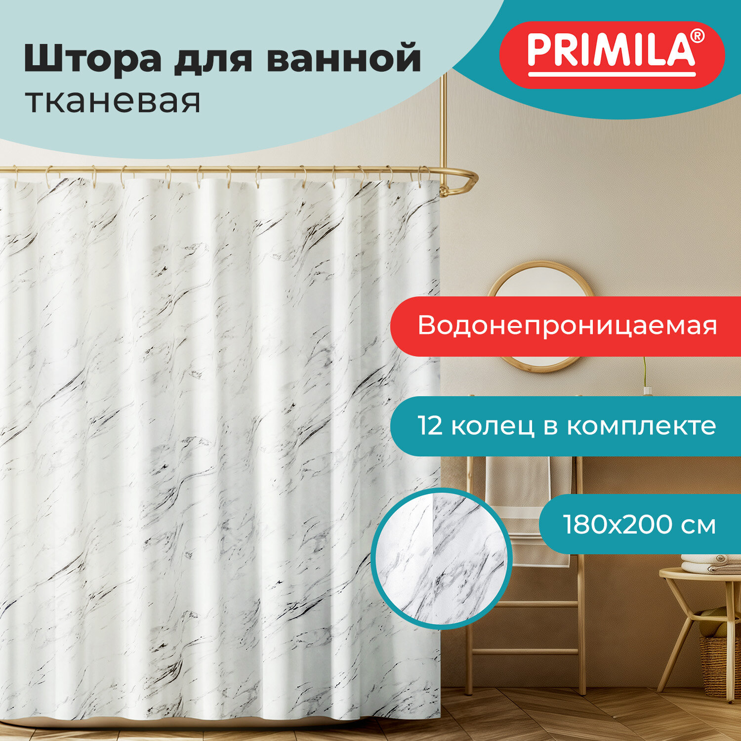 Шторка для ванной ПОЛИЭСТЕР, 180х200 см, кольца в комплекте, БЕЛЫЙ МРАМОР, PRIMILA (ПРИМИЛА) Код товара: 700084 541,13 ₽ Купить Производитель:PRIMILA Шторка для ванной комнаты PRIMILA – залог чистоты и уюта ванной комнаты. Используется для защиты пола, стен, мебели и зеркала от брызг. Эта шторка идеально впишется в любой интерьер. Шторка для ванной PRIMILA изготовлена из качественного, практичного, износостойкого полиэстера, что гарантирует отсутствие заломов и водостойкость. Быстро сохнет, не шуршит, без запаха и приятная на ощупь. Шторку можно стирать в стиральной машине при температуре до 60 °С. В комплекте с шторкой идут 12 прочных полипропиленовых колец, которые подойдут под любой тип карниза. • Основные характеристики: - Размер: 180х200 см. - Цвет: белый с рисунком. - Материал: полиэстер. - Плотность шторки: 80 г/м2. • Основные преимущества: - Устойчива к плесени. - Легко вписывается в любой интерьер. - Не требует сложного ухода. - Долговечна и практична в использовании. - Безопасна для здоровья.Производство: КитайРазмер (ДхШ): 180х200 смНаличие колец в комплекте: даВид принта: рисунокДизайн: Белый мраморВодонепроницаемая: даВодоотталкивающая: даОсобенности: Нет данныхПлотность материала: 80 г/м2Материал: полиэстерЦвет: белыйВес: 383 грРазмер упаковки: 2.3 × 30.2 × 22.9 смОбъём: 0.0014 м3Промежуточная упаковка: 72 штТранспортная упаковка: 72 штШтрих-код: 4606224466941 Сертификат-1.jpg Сертификат-2.jpg Сертификат-3.jpg