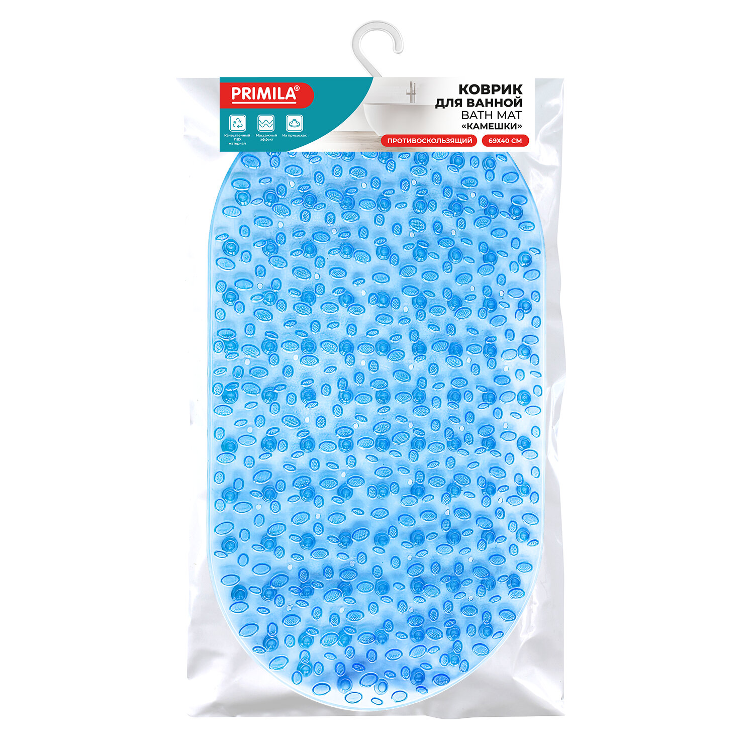 Коврик для ванны противоскользящий 69х40 см, "Камешки", овальный, прозрачно-голубой, ПВХ, PRIMILA (ПРИМИЛА) Код товара: 700368 435,87 ₽ Купить Производитель:PRIMILA Противоскользящий коврик для ванны PRIMILA обеспечит безопасность и комфорт во время купания. Предназначен для защиты от падений во время водных процедур. Противоскользящий коврик для ванны изготовлен из прочного ПВХ-материала. Размер: 69х40 см. Форма: овал. Рисунок: камешки. По всей задней поверхности коврика равномерно распределены присоски. Мягкая фактурная поверхность с выступами обеспечивает дополнительный массажный эффект для ступней. Перед использованием наберите в ванну теплую воду, положите коврик и плотно прижмите каждую присоску, чтобы закрепить коврик. Поднимите его за края, чтобы убедиться, что он надежно закреплен. Коврик предназначен для использования на гладких, ровных, чистых и влажных поверхностях. Внимание! Коврик не прилипает к текстурированным, выложенным плиткой и неровным поверхностям! Коврик легко очищается и быстро сохнет, что делает его идеальным выбором для повседневного использования.Производство: КитайНазначение: в ваннуРазмер коврика для ванной (ДхШ): 69х40 смРазмер коврика для туалета (ДхШ): - смТолщина: 0 ммКоличество в комплекте: 1 шт.Цвет: светло-голубойОсобенности: на присоскахСерия: СтандартДизайн: КамешкиМатериал: ПВХВес: 671 грРазмер упаковки: 3 × 55.7 × 39.9 смОбъём: 0.0022 м3Промежуточная упаковка: 24 штТранспортная упаковка: 24 штШтрих-код: 4606224474052 Сертификат-1.jpg Сертификат-2.jpg