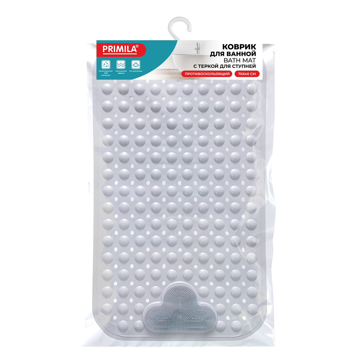 Коврик для ванны противоскользящий с теркой для ступней 70х40 см, серый, ПВХ, присоски, PRIMILA (ПРИМИЛА) Код товара: 700374 510,69 ₽ Купить Производитель:PRIMILA Противоскользящий коврик для ванны PRIMILA с теркой для ступней обеспечит безопасность и комфорт во время купания. Предназначен для защиты от падений во время водных процедур. Противоскользящий коврик для ванны изготовлен из ПВХ-материала. Размер: 70х40 см. Форма: прямоугольник с закругленными углами. По всей задней поверхности коврика равномерно распределены присоски. Особенность: на одной стороне коврика расположена специальная терка для ступней. Перед использованием наберите в ванну теплую воду, положите коврик и плотно прижмите каждую присоску, чтобы закрепить коврик. Поднимите его за края и убедитесь, что он надежно закреплен. Коврик предназначен для использования на гладких, ровных, чистых и влажных поверхностях. Внимание! Коврик не прилипает к текстурированным, выложенным плиткой и неровным поверхностям! Коврик легко очищается и быстро сохнет, что делает его идеальным выбором для повседневного использования.Производство: КитайНазначение: в ваннуРазмер коврика для ванной (ДхШ): 70х40 смРазмер коврика для туалета (ДхШ): - смТолщина: 0 ммКоличество в комплекте: 1 шт.Цвет: серыйОсобенности: на присоскахСерия: СтандартДизайн: НейтральныйМатериал: ПВХВес: 798 грРазмер упаковки: 1.7 × 75.3 × 39.4 смОбъём: 0.0033 м3Промежуточная упаковка: 24 штТранспортная упаковка: 24 штШтрих-код: 4606224474113 Сертификат-1.jpg Сертификат-2.jpg