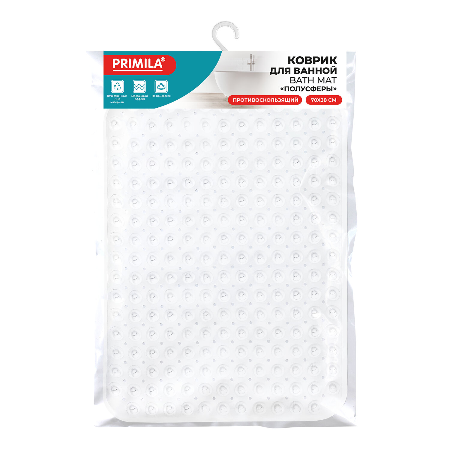 Коврик для ванны противоскользящий 70х38 см, "Полусферы", прозрачный, ПВХ, присоски, PRIMILA (ПРИМИЛА) Код товара: 700382 362,7 ₽ Купить Производитель:PRIMILA Противоскользящий коврик для ванны PRIMILA обеспечит безопасность и комфорт во время купания. Предназначен для защиты от падений во время водных процедур. Противоскользящий коврик для ванны изготовлен из прочного ПВХ-материала. Размер: 70х38 см. Форма: прямоугольник с закругленными углами. Рисунок: Полусферы. По всей задней поверхности коврика равномерно распределены присоски. Мягкая фактурная поверхность с полусферами обеспечивает дополнительный массажный эффект для ступней. Перед использованием наберите в ванну теплую воду, положите коврик и плотно прижмите каждую присоску, чтобы закрепить коврик. Поднимите его за края и убедитесь, что он надежно закреплен. Коврик предназначен для использования на гладких, ровных, чистых и влажных поверхностях. Внимание! Коврик не прилипает к текстурированным, выложенным плиткой и неровным поверхностям! Коврик легко очищается и быстро сохнет, что делает его идеальным выбором для повседневного использования.Производство: КитайНазначение: в ваннуРазмер коврика для ванной (ДхШ): 70х38 смРазмер коврика для туалета (ДхШ): - смТолщина: 0 ммКоличество в комплекте: 1 шт.Цвет: прозрачныйОсобенности: на присоскахСерия: СтандартДизайн: ПолусферыМатериал: ПВХВес: 582 грРазмер упаковки: 1.7 × 58.7 × 38.9 смОбъём: 0.0019 м3Промежуточная упаковка: 24 штТранспортная упаковка: 24 штШтрих-код: 4606224474199 Сертификат-1.jpg Сертификат-2.jpg