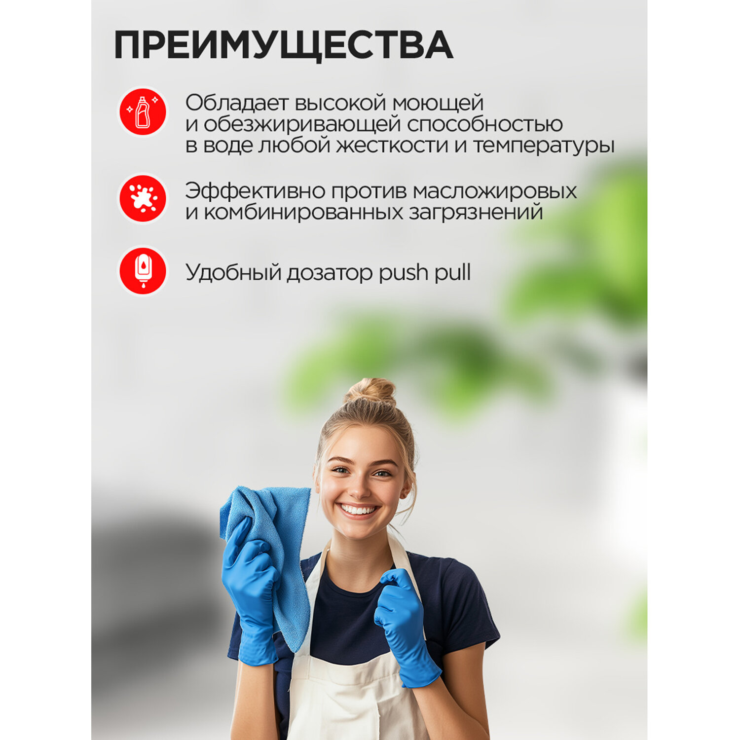 Удобная упаковка с крышкой с дозатором "пуш-пул" облегчает процесс дозировки, поэтому вы легко сможете дозировать необходимое количество средства, экономя ваше время и усилия. Просто разведите средство в воде – и наслаждайтесь идеальной чистотой!
