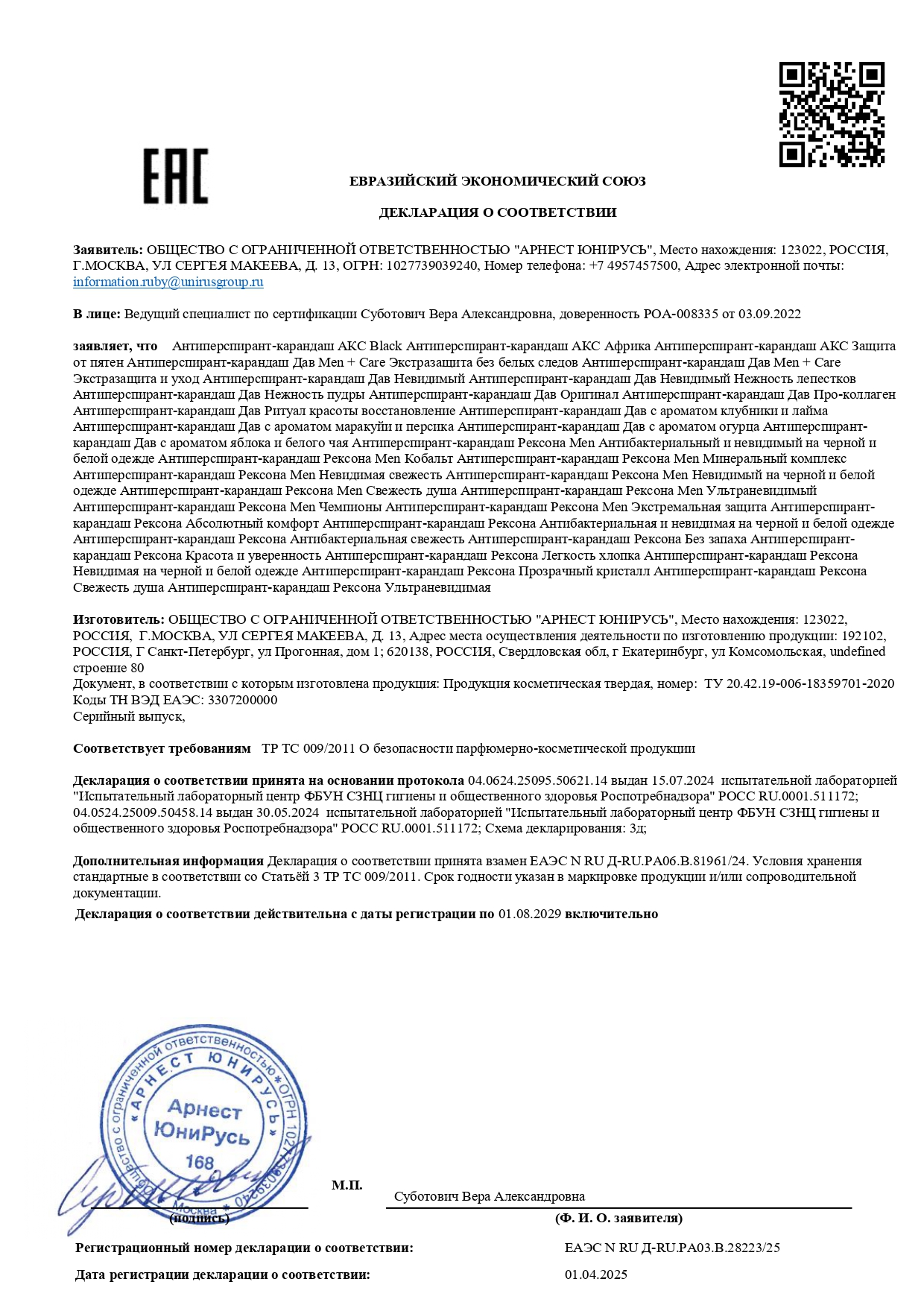 Дезодорант-антиперспирант карандаш 40 мл, РЕКСОНА "Без запаха", усиленная защита, унисекс Код товара: 609841 350,65 ₽ Купить Производитель:REXONA Дезодорант-антиперспирант карандаш РЕКСОНА "Без запаха" надежно защитит вас от пота и запаха в течение 72 часов. Сразу после освежающего душа далее воспользуйтесь антиперспирантом-карандашом РЕКСОНА "Без запаха". Новая революционная технология Motionsense активируется при движении, сохраняя свежесть и абсолютный комфорт на весь день. Микрочастицы создают дышащую микропленку для надежной защиты от пота и запаха. Потовые железы блокируются частично, кожа при этом дышит. Больше движений – больше уверенности! Не требует повторного нанесения в течение дня. Дезодорант-карандаш одинаково подходит как для женщин, так и для мужчин. Надежно защитит вас от пота и запаха в течение 72 часов. Антиперспирант не имеет аромата и не перебивает аромат вашего парфюма. То, что нужно, если вы обладаете чувствительной кожей или предпочитаете антиперспиранты без запаха. Антиперспирант-карандаш удобен в использовании и быстро высыхает после нанесения. Будет весьма кстати, если вы собираетесь на тренировку или любое другое мероприятие, где сильные ароматы не уместны. Продукт представлен в новом стильном дизайне, который так и просится в руки. Не содержит этилового спирта. Дерматологически протестирован. Способ применения: поверните основание контейнера и проведите "карандашом" по чистой и сухой коже подмышек. Состав: Cyclopentasiloxane, Aluminum Zirconium Tetrachlorohydrex GLY, Stearyl Alcohol, C12-15 Alkyl Benzoate, PPG-14 Butyl Ether, Hydrogenated Castor Oil, Polyethylene, Dimethicone, Helianthus Annuus Seed Oil, Citric Acid, BHT.Производство: РоссияПол: универсальныйТип дезодоранта: стикТекстура: твердаяОбъем/вес: 40 мл/гСерия: DEO REXАромат: без запахаСрок годности: 30 месВес: 79 грРазмер упаковки: 11.6 × 3.2 × 5.8 смОбъём: 0.0002 м3Промежуточная упаковка: 6 штТранспортная упаковка: 6 штШтрих-код: 96045312 Сертификат-1.jpg Сертификат-2.jpg Сертификат-3.jpg