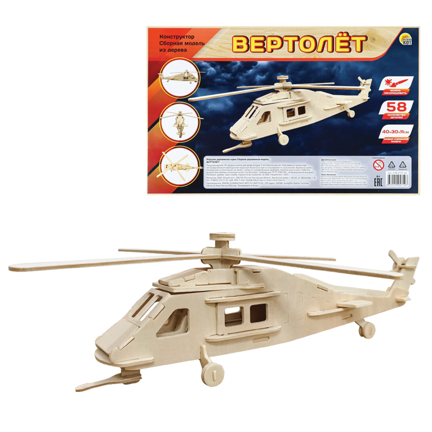 Сборная модель из дерева, АССОРТИ, 15 видов, РК Код товара: 666319 246,01 ₽ Купить Производитель:Рыжий кот Сборная модель из дерева станет отличным подарком для любого ребенка! Она поможет не только интересно провести время с семьей, но и развить воображение, художественное мышление и мелкую моторику. Собранное изделие можно склеить и раскрасить. Уникальную модель, состоящую из мелких деревянных деталей, можно собрать своими руками, следуя простой схеме (при сборке необходимо строго соблюдать последовательность чисел, которыми отмечены детали на схеме).Производство: РоссияТип товара: сборная модельСерия: нетМатериал: деревоУровень сложности сборки: начальныйРекомендуемый возраст: от 3 летТип деталей: разные формыКоличество элементов: 0 шт.Количество моделей для сборки: 1Комплектация: инструкция по сборкеЦвет: нетУпаковка: термоусадочная пленкаВес: 239 грРазмер упаковки: 0.6 × 34.4 × 21.5 смОбъём: 0.0006 м3Промежуточная упаковка: 15 штТранспортная упаковка: 30 штШтрих-код: 4680088486215 Файлы Сертификат-1.jpg Сертификат-2.jpg Сертификат-3.jpg Сертификат-4.jpg