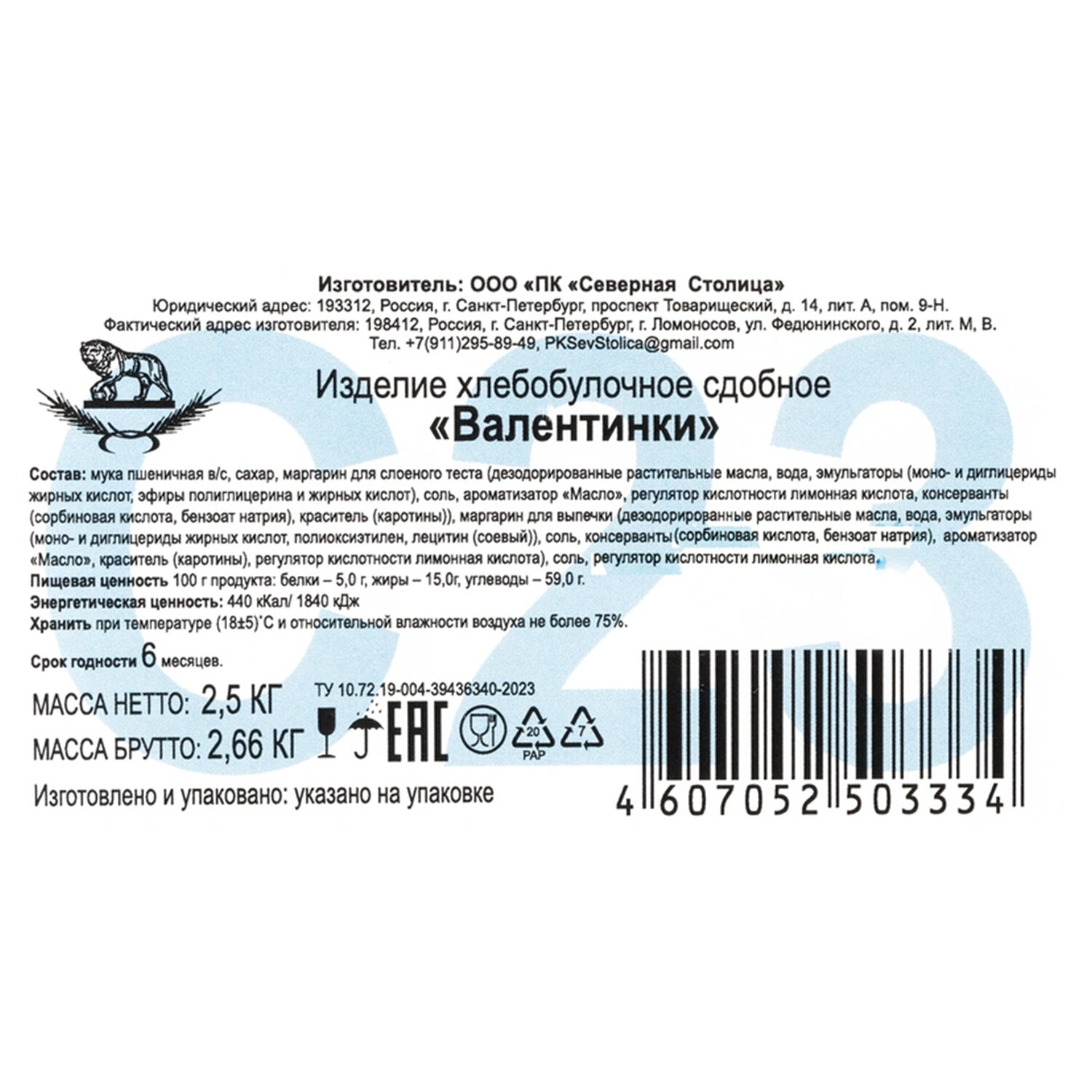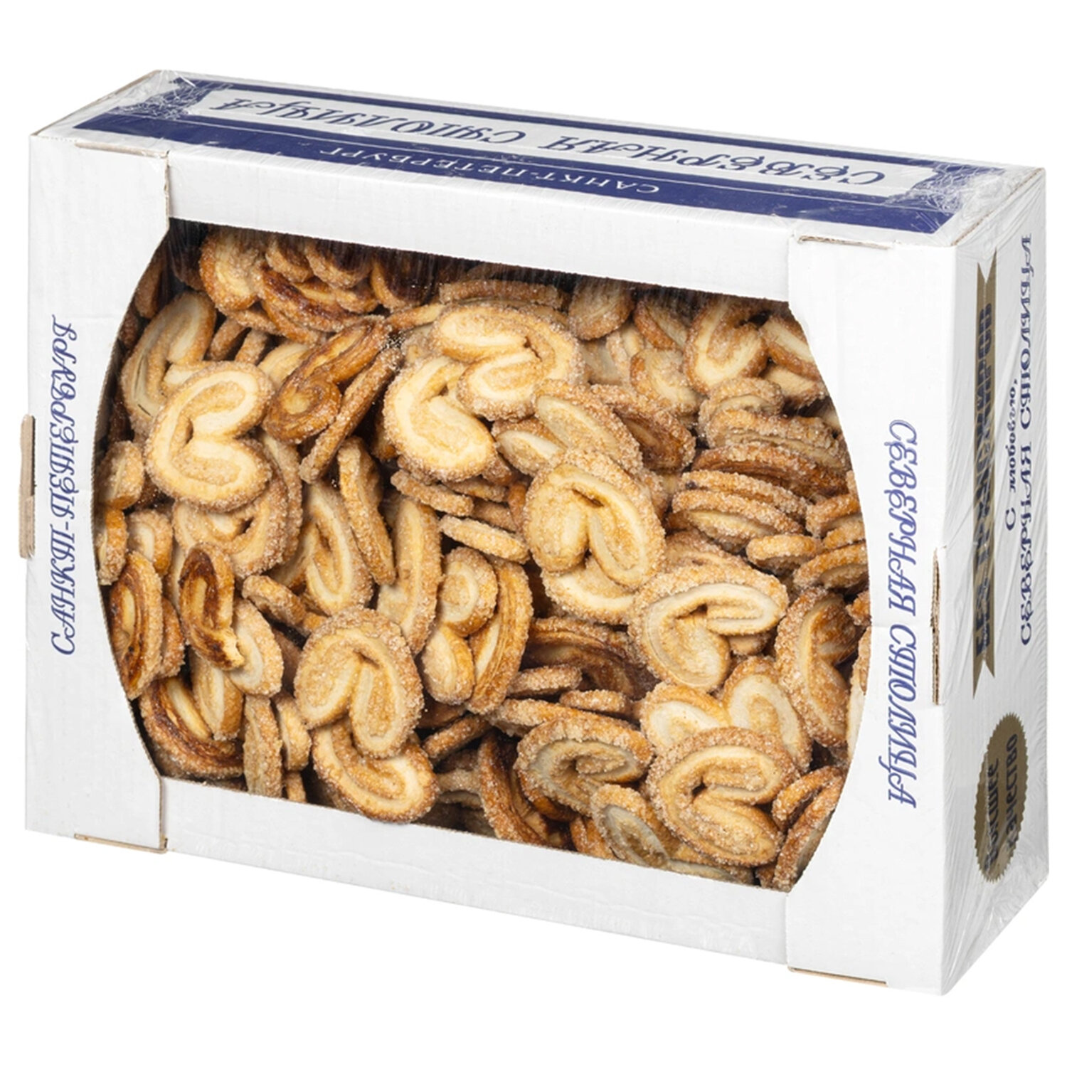 Печенье слоеное СЕВЕРНАЯ СТОЛИЦА "Валентинки" 2,5 кг, картонная коробка Код товара: 624222 1 336,63 ₽ Купить Производитель:СЕВЕРНАЯ СТОЛИЦА Печенье слоеное СЕВЕРНАЯ СТОЛИЦА "Валентинки" – это тонкие хрустящие слоеные печенюшки в форме сердечка, посыпанные сахарным песком. Состав: мука пшеничная высшего сорта, маргарин для слоеного теста (дезодорированные растительные масла, вода, эмульгаторы (моно- и диглицериды жирных кислот, эфиры полиглицерина и жирных кислот), соль, ароматизатор "Масло", регулятор кислотности лимонная кислота, консерванты (сорбиновая кислота, бензоат натрия), краситель (каротины)), маргарин для выпечки (дезодорированные растительные масла, вода, эмульгаторы (моно- и диглицериды жирных кислот, полиоксиэтилен, лецитин соевый)), соль, консерванты (сорбиновая кислота, бензоат натрия), ароматизатор "Масло", краситель (каротины), регулятор кислотности лимонная кислота), соль, какао-порошок, регулятор кислотности лимонная кислота, ароматизатор.Производство: РоссияТип товара: печеньеВес нетто: 2500 гВесовое: даВид: слоеноеТип вкуса: классический в сахареСерия: СЕВЕРНАЯ СТОЛИЦАСоответствует требованиям ГОСТа: нетТип упаковки: картонная коробкаСрок годности: 6 мес.Фирма-производитель: Северная СтолицаСрок годности: 6 месВес: 2,69 кгРазмер упаковки: 13 × 39.3 × 29.9 смОбъём: 0.0153 м3Промежуточная упаковка: 1 штТранспортная упаковка: 1 штШтрих-код: 4607052503334 Файлы Сертификат-1.jpg Сертификат-2.jpg Сертификат-3.jpg Сертификат-4.jpg Сертификат-5.jpg Сертификат-6.jpg Сертификат-7.jpg Сертификат-8.jpg Сертификат-9.jpg Сертификат-10.jpg Сертификат-11.jpg Сертификат-12.jpg