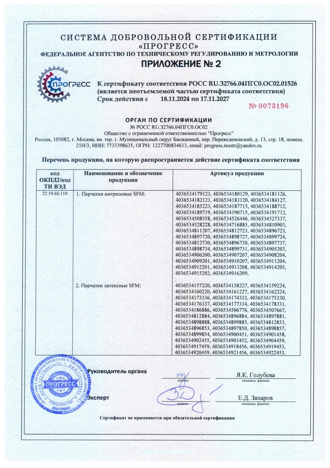 Перчатки нитриловые сверхпрочные с текстурой SFM MEGA TEX ORANGE, Германия, 25 пар (50 штук), размер XL (очень большой) Код товара: 702146 602 ₽ Купить Производитель:SFM SFM MEGA TEX ORANGE – сверхпрочные перчатки, устойчивые к механическим повреждениям, с высоким уровнем защиты от воздействия химически агрессивных сред. Перчатки сверхпрочные, нестерильные, неопудренные, не разделяются на левую и правую. Имеют текстурированную ромбовидную поверхность по всей площади, чтобы избежать скольжения. Отсутствие талька исключает раздражение кожи. Длина – 240 мм. Манжета: валик на перчатках хорошо удерживается на руке и обеспечивает комфортную естественную посадку. Перчатки предназначены только для одноразового использования. Цвет – оранжевый. Материал – нитрил. Назначение: хозяйственные службы, патологическая анатомия, пищевая промышленность. Неанатомические, плоская форма.Производство: ГерманияМатериал: нитрилРазмер перчаток: 9-10 (XL)Серия: SFMТип: смотровыеНеопудренные: даТип поверхности: текстурированныеПовышенная чувствительность: даХлоринация: даФорма: плоскаяОсобенности: особо прочныеСоответствует требованиям ГОСТа: ГОСТ Р 52239-2004Количество в комплекте: 25 парШирина ладони: 115 ммЦвет: оранжевыйВид упаковки: картонная коробкаВес: 537 грРазмер упаковки: 6.2 × 24.2 × 13.5 смОбъём: 0.0023 м3Промежуточная упаковка: 10 штТранспортная упаковка: 10 штШтрих-код: 4036534915202 Файлы Сертификат-1.jpg Сертификат-2.jpg Сертификат-3.jpg Сертификат-4.jpg Сертификат-5.jpg Сертификат-6.jpg