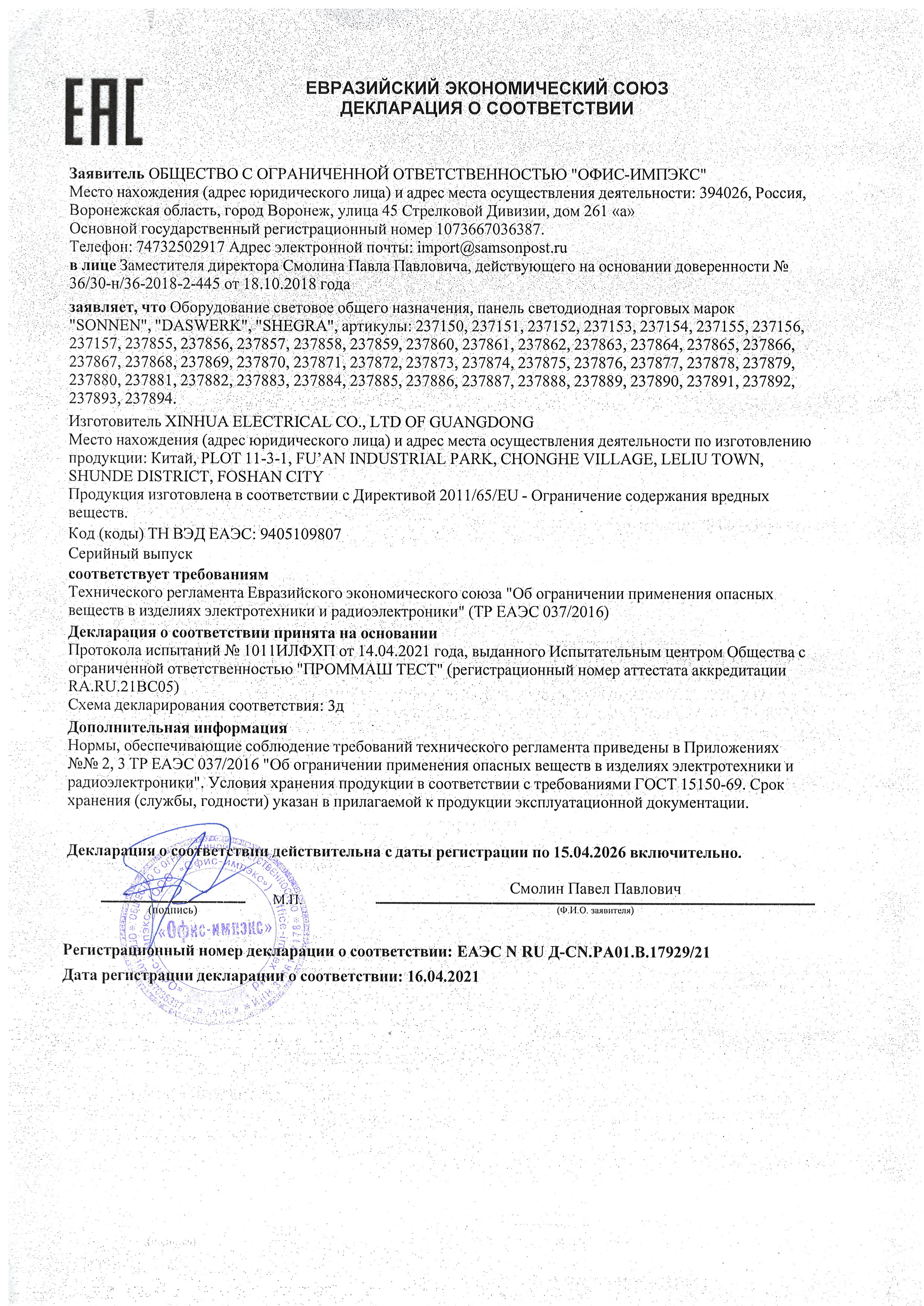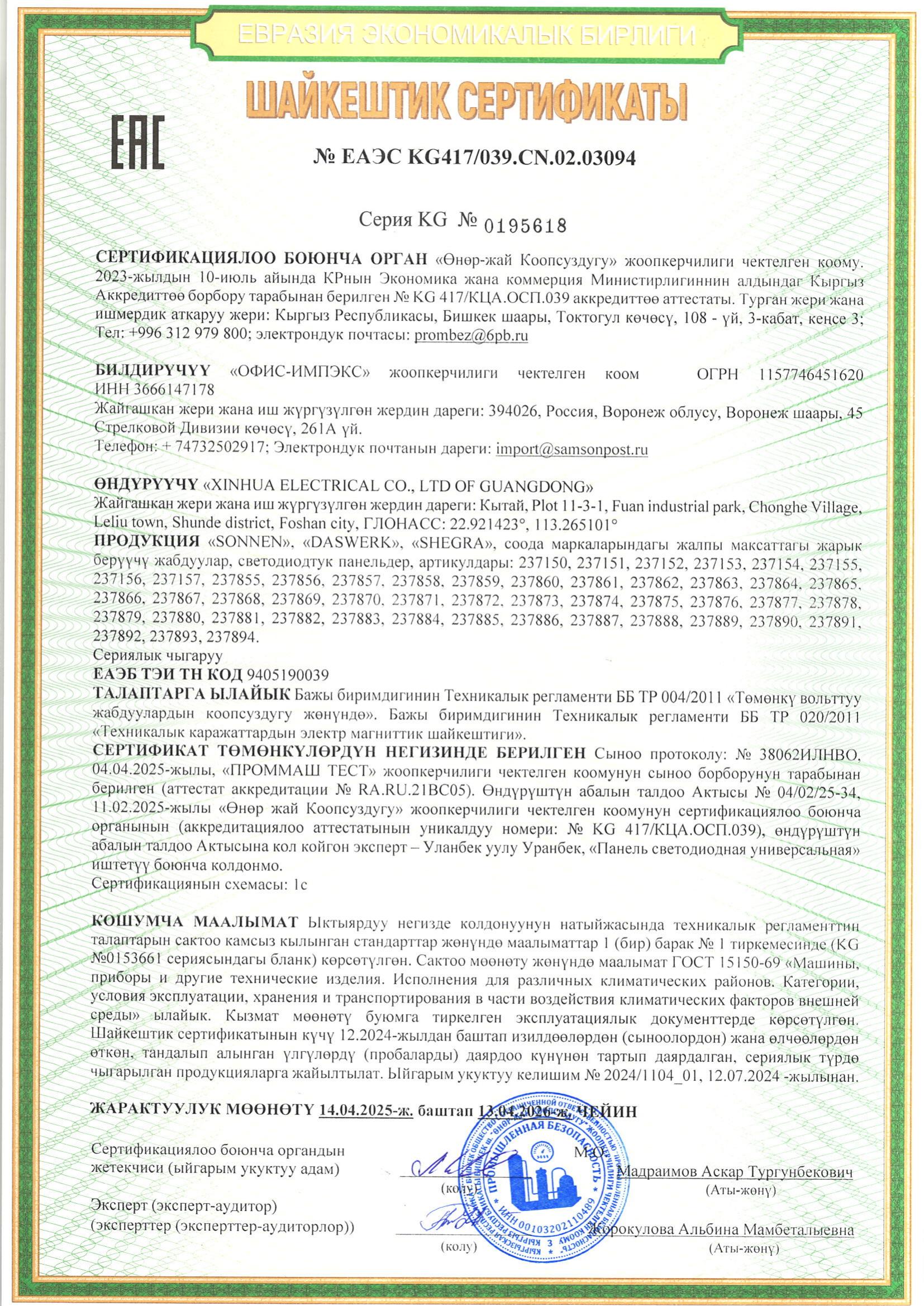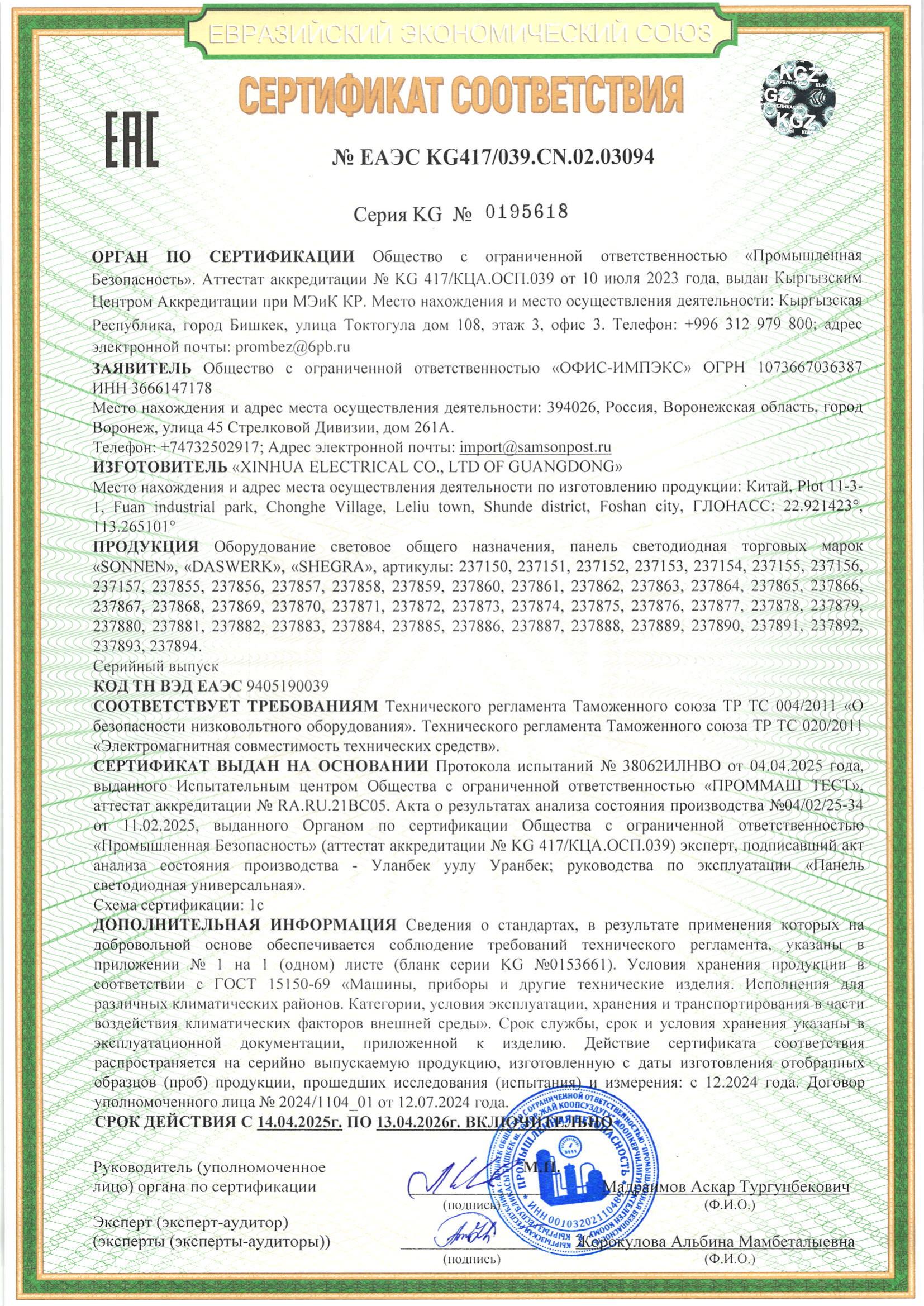 Светильник светодиодный АРМСТРОНГ SONNEN, нейтральный свет 4000 K, 595х595х19, 36 Вт, прозрачный Код товара: 237855 1 077,27 ₽ Купить Производитель:SONNEN Потолочный светильник SONNEN типа АРМСТРОНГ предназначен для освещения рабочего места в офисе. ДРАЙВЕР (блок питания для светодиодов) в комплекте! Для установки и работы светильников SONNEN не нужно ничего докупать. Светодиодная панель SONNEN оснащена металлическим корпусом с пластиковыми элементами. Степень пылевлагозащиты IP40 способствует длительному сроку службы. Устройство работает от стандартной электросети с напряжением 180-260 В и мощностью 36 Вт. Высококачественные LED-диоды в количестве 112 штук от ведущего мирового производителя способны работать до 30000 часов. Рассеиватель типа "Призма". Светильник SONNEN освещает пространство со световым потоком 3600 Лм при цветовой температуре 4000 К, что делает его подходящим для использования в больших помещениях. Размеры светодиодной панели – 595x19x595 мм. Индивидуальная упаковка светильника - термоусадочная плёнка. Единица продажи – 1 штука. Производитель сохраняет за собой право на внесение изменений в технические характеристики, комплектацию и конструкцию данной модели для улучшения эксплуатационных свойств без предварительного уведомления.Производство: КитайТип товара: светильникТип лампы: светодиодныйТип светильника: АрмстронгМаксимальная мощность ламп: 36 ВтТип света: нейтральный белыйКоличество ламп/светодиодов: 112 шт.Класс пылевлагозащищенности: IP40Напряжение питания: 180-260 ВПотребляемая мощность: 36 ВтЦветовая температура: 4000 КСветовой поток: 3600 ЛмИндекс цветопередачи Ra: >70Срок службы: 30000 чВстроенный драйвер (блок питания): даТип рассеивателя: Призма (прозрачный)Класс защиты от поражения электрическим током: IКласс энергоэффективности: AДиапазон рабочих температур: от +1 до +35 °CТип корпуса: потолочныйКомплектация: драйвер, лампыМатериал: металл, пластикЦвет корпуса: белыйДлина: 595 ммШирина: 595 ммВысота: 19 ммВес: 995 грРазмер упаковки: 2 × 59.7 × 59.9 смОбъём: 0.0081 м3Промежуточная упаковка: 4 штТранспортная упаковка: 4 штШтрих-код: 4606224452937 Файлы Сертификат-1.jpg Сертификат-2.jpg Сертификат-3.jpg Сертификат-4.jpg Сертификат-5.jpg Сертификат-6.jpg Сертификат-7.jpg