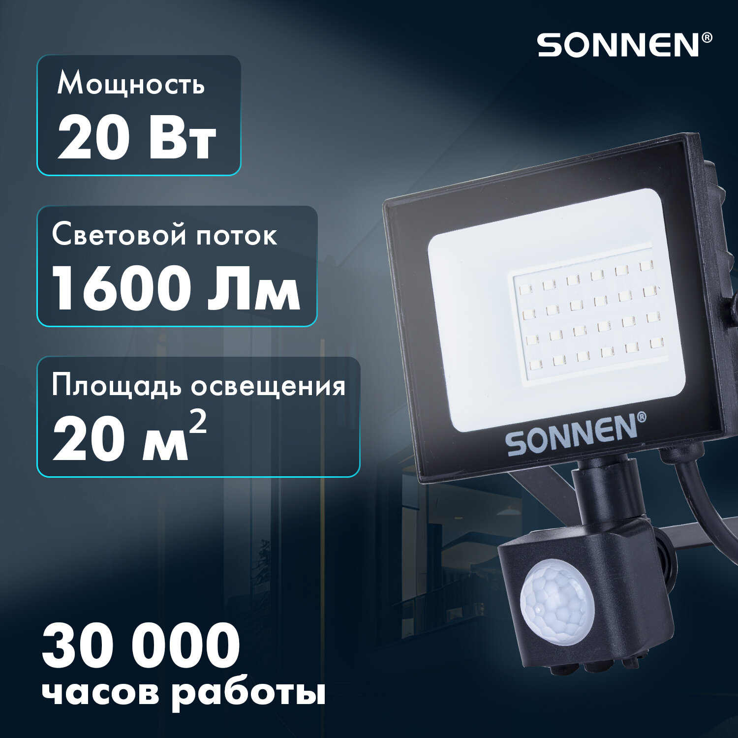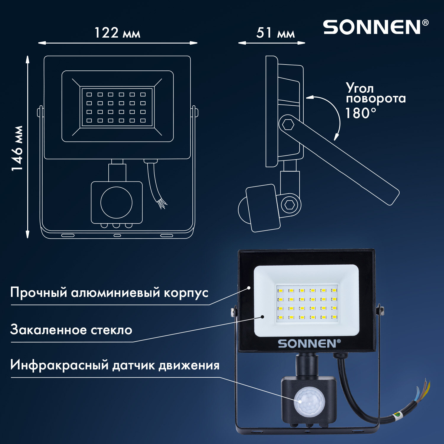 Прожектор светодиодный с датчиком движения 20 Вт, 6500 К, 1600 Лм, 20 м2, IP65, 122х146х51 мм, черный, SONNEN Код товара: 238416 647,85 ₽ Купить Производитель:SONNEN Светодиодный прожектор SONNEN – это современное решение для освещения, сочетающее эффективность, экономию энергии и длительный срок службы. Светодиодный прожектор идеально подходит для ландшафтного освещения, архитектурной подсветки, освещения рекламных конструкций, промышленных и складских помещений. Его мощность составляет 20 Вт, световой поток – 1600 лм, цветовая температура – 6500 К (холодный белый свет). Имеет высокую степень пылевлагозащиты IP65, которая позволяет использовать прожектор на улице и в помещениях с повышенной влажностью. Светодиодный прожектор оснащён поворотным регулируемым инфракрасным датчиком движения. Регулятор TIME позволяет настроить время работы прожектора после включения – от 10 секунд до 10 минут. Регулятор LUX установит порог срабатывания датчика в зависимости от уровня освещённости окружающей среды – от 10 люкс (ночное время) до 2000 люкс (дневное освещение). Регулятор SENS поможет установить чувствительность датчика в зависимости от дальности обнаружения объекта – от 4 до 10 м. Прожектор устойчив к перепадам температур и работает в диапазоне от -40 до +50 °C. Корпус прожектора выполнен из металла с антикоррозийными свойствами и дополнен закалённым стеклом. Производитель сохраняет за собой право на внесение изменений в технические характеристики, комплектацию и конструкцию данной модели для улучшения эксплуатационных свойств без предварительного уведомления.Производство: КитайНапряжение питания: 220 ВПотребляемая мощность: 20 ВтКласс пылевлагозащиты: IP65Цветовая температура: 6500 КТип датчика движения: инфракрасныйЭквивалент галогенного прожектора: 100 ВтТемпература эксплуатации: -40 + 50 °CСветовой поток: 1600 ЛмСерия: STDВысота: 146 ммШирина: 122 ммГлубина: 51 ммМатериал: стекло, металл, пластикЦвет: черныйВес: 265 грРазмер упаковки: 5.6 × 15.3 × 12.8 смОбъём: 0.0013 м3Промежуточная упаковка: 50 штТранспортная упаковка: 50 штШтрих-код: 4606224444055 Файлы Сертификат-1.jpg Сертификат-2.jpg Сертификат-3.jpg Сертификат-4.jpg Сертификат-5.jpg Сертификат-6.jpg Сертификат-7.jpg