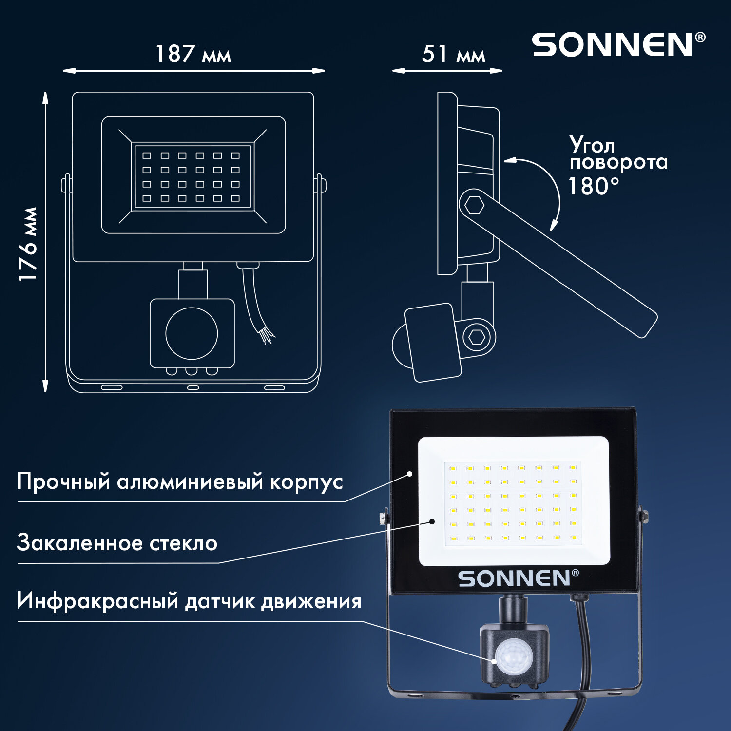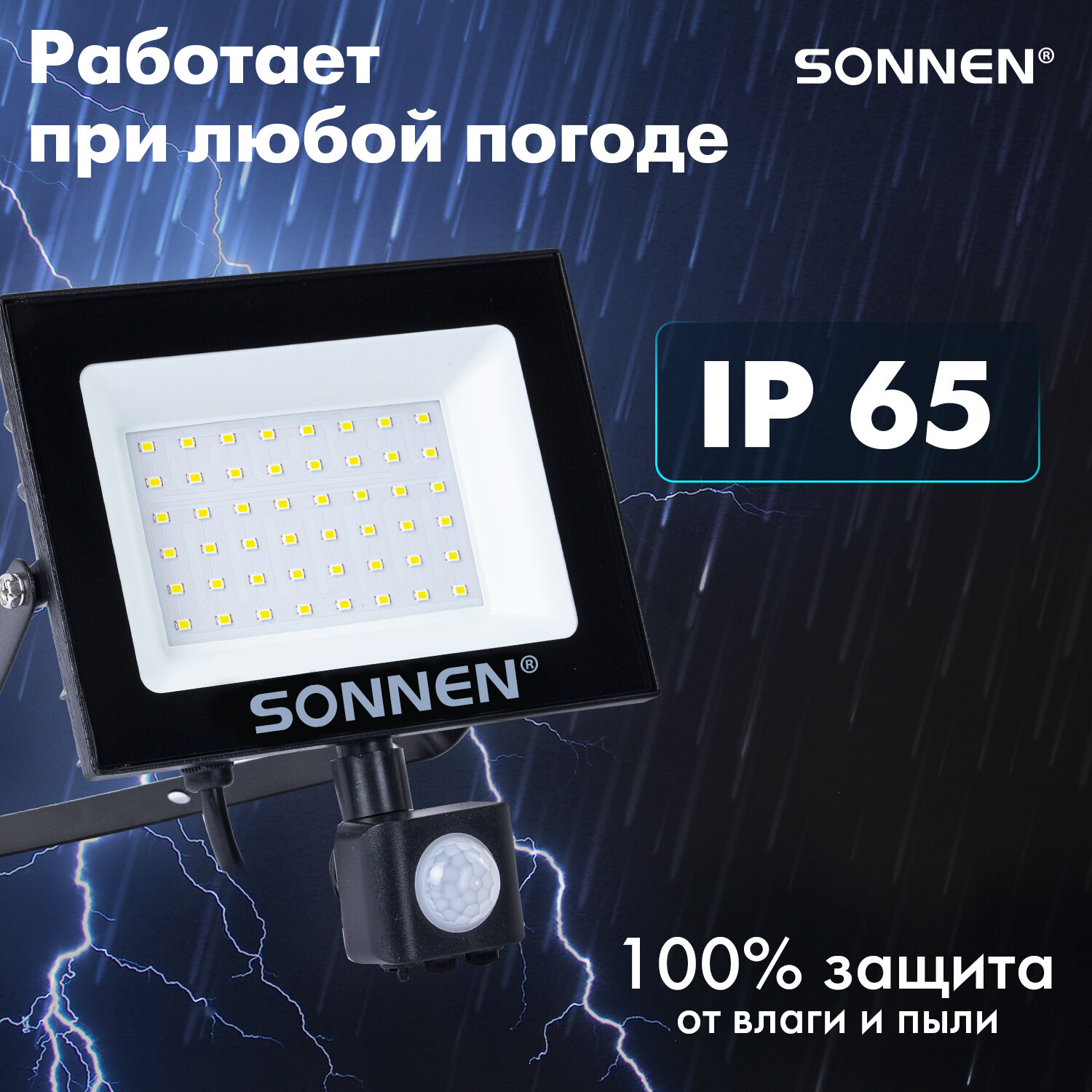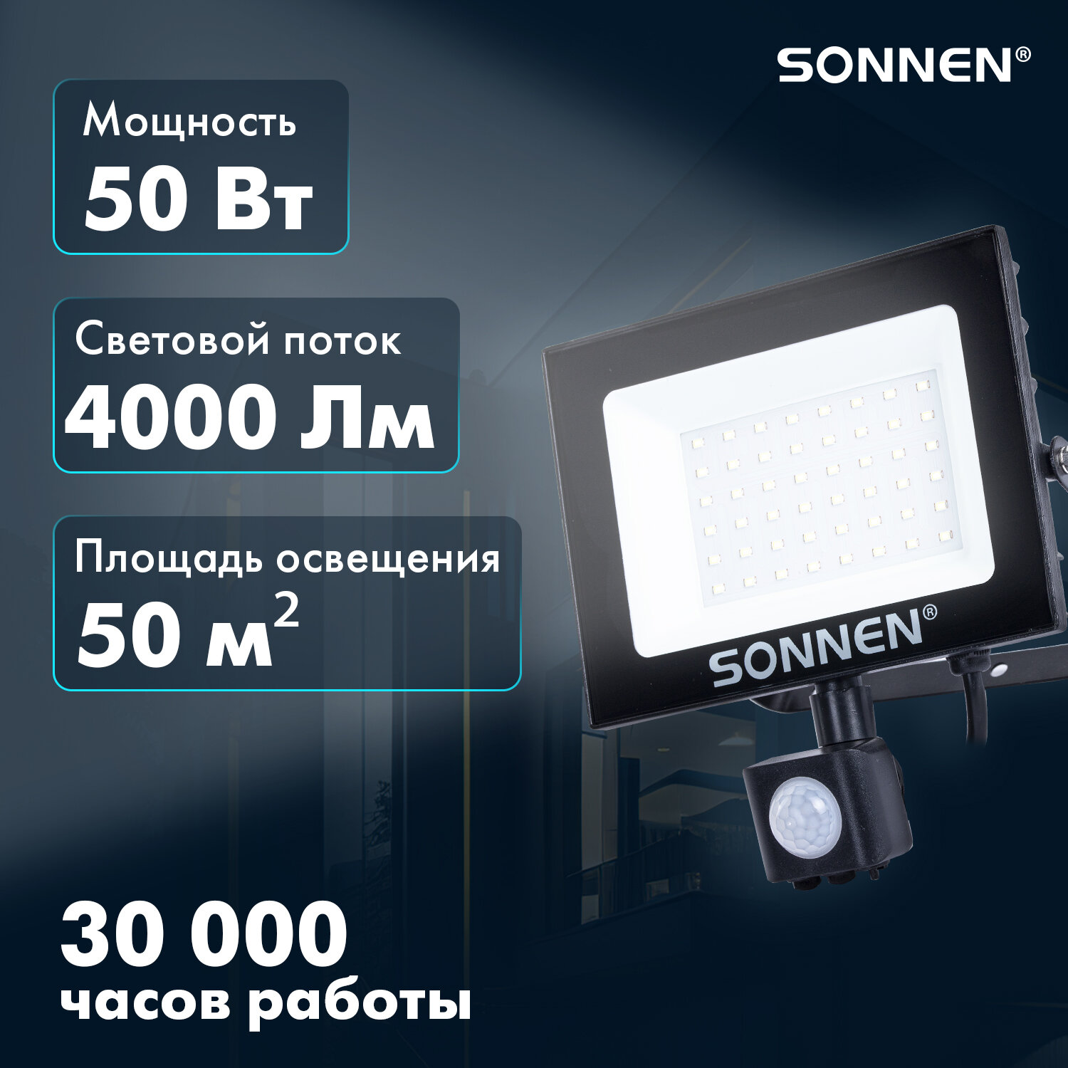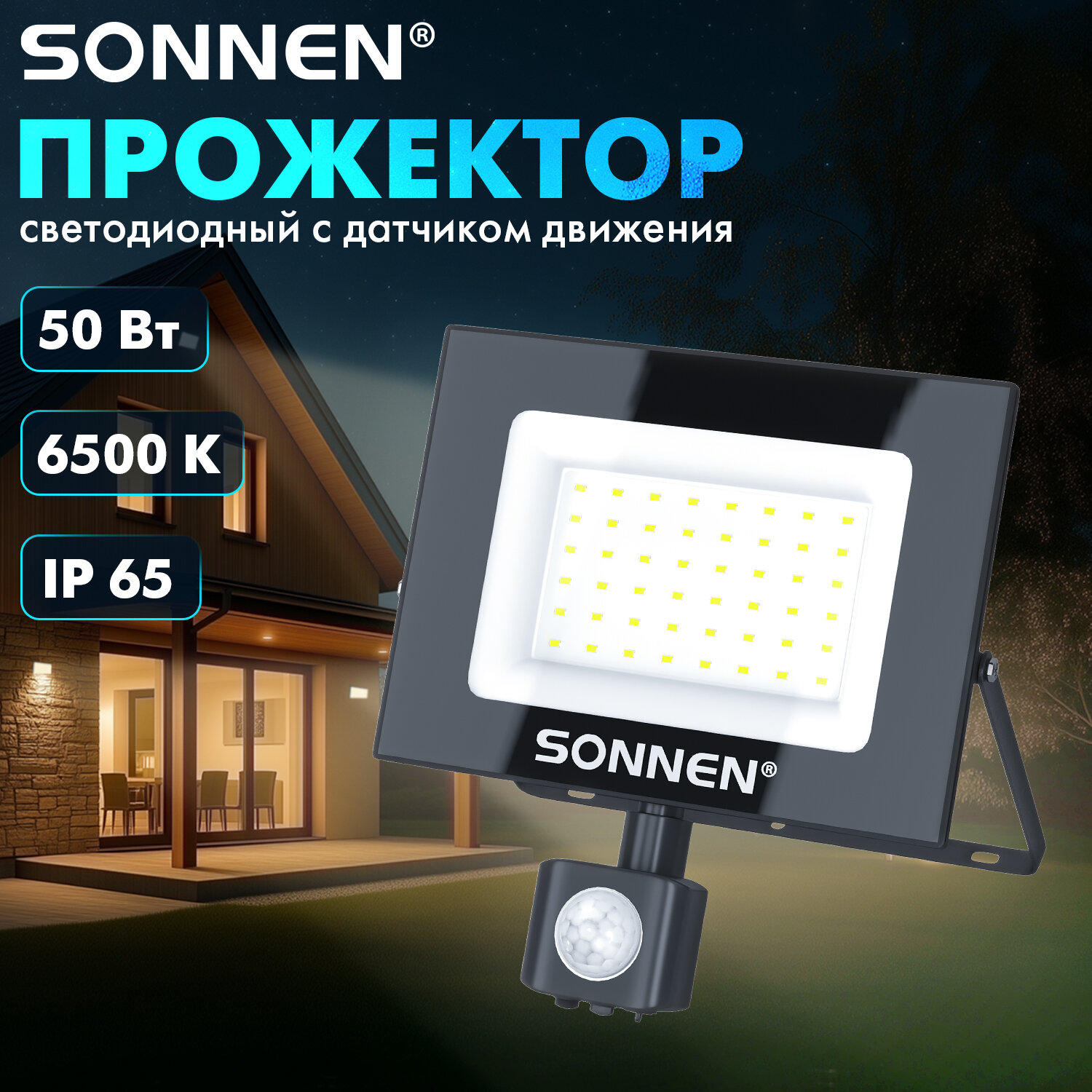 Прожектор светодиодный с датчиком движения 50 Вт, 6500 К, 4000 Лм, 50 м2, IP65, 187х176х51 мм, черный, SONNEN Код товара: 238418 801,46 ₽ Купить Производитель:SONNEN Светодиодный прожектор SONNEN – это современное решение для освещения, сочетающее эффективность, экономию энергии и длительный срок службы. Светодиодный прожектор идеально подходит для ландшафтного освещения, архитектурной подсветки, освещения рекламных конструкций, промышленных и складских помещений. Его мощность составляет 50 Вт, световой поток – 4000 лм, цветовая температура – 6500 К (холодный белый свет). Имеет высокую степень пылевлагозащиты IP65, которая позволяет использовать прожектор на улице и в помещениях с повышенной влажностью. Светодиодный прожектор оснащён поворотным регулируемым инфракрасным датчиком движения. Регулятор TIME позволяет настроить время работы прожектора после включения – от 10 секунд до 10 минут. Регулятор LUX установит порог срабатывания датчика в зависимости от уровня освещённости окружающей среды – от 10 люкс (ночное время) до 2000 люкс (дневное освещение). Регулятор SENS поможет установить чувствительность датчика в зависимости от дальности обнаружения объекта – от 4 до 10 м. Прожектор устойчив к перепадам температур и работает в диапазоне от -40 до +50 °C. Корпус прожектора выполнен из металла с антикоррозийными свойствами и дополнен закалённым стеклом. Производитель сохраняет за собой право на внесение изменений в технические характеристики, комплектацию и конструкцию данной модели для улучшения эксплуатационных свойств без предварительного уведомления.Производство: КитайНапряжение питания: 220 ВПотребляемая мощность: 50 ВтКласс пылевлагозащиты: IP65Цветовая температура: 6500 КТип датчика движения: инфракрасныйЭквивалент галогенного прожектора: 300 ВтТемпература эксплуатации: -40 + 50 °CСветовой поток: 4000 ЛмСерия: STDВысота: 176 ммШирина: 187 ммГлубина: 51 ммМатериал: стекло, металл, пластикЦвет: черныйВес: 458 грРазмер упаковки: 5.8 × 19.4 × 18 смОбъём: 0.0023 м3Промежуточная упаковка: 30 штТранспортная упаковка: 30 штШтрих-код: 4606224444079 Файлы Сертификат-1.jpg Сертификат-2.jpg Сертификат-3.jpg Сертификат-4.jpg Сертификат-5.jpg Сертификат-6.jpg Сертификат-7.jpg