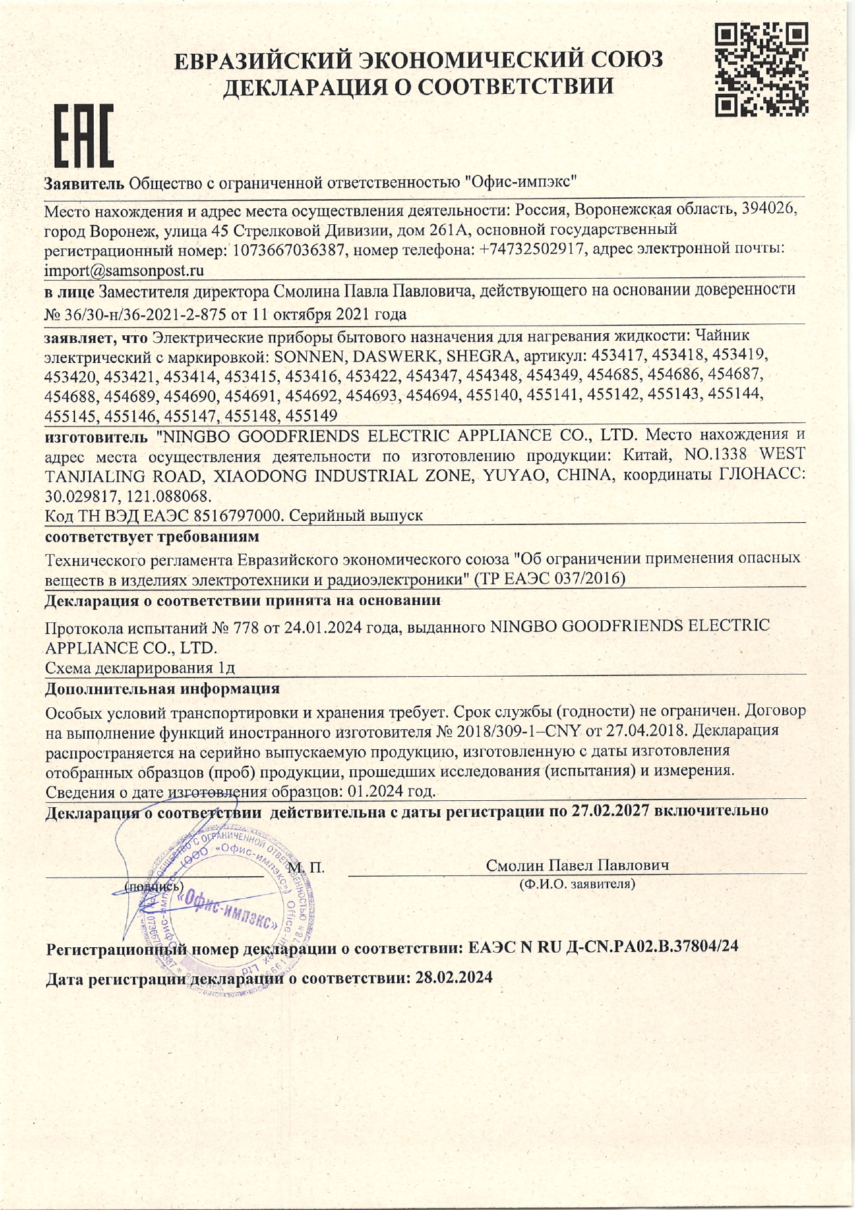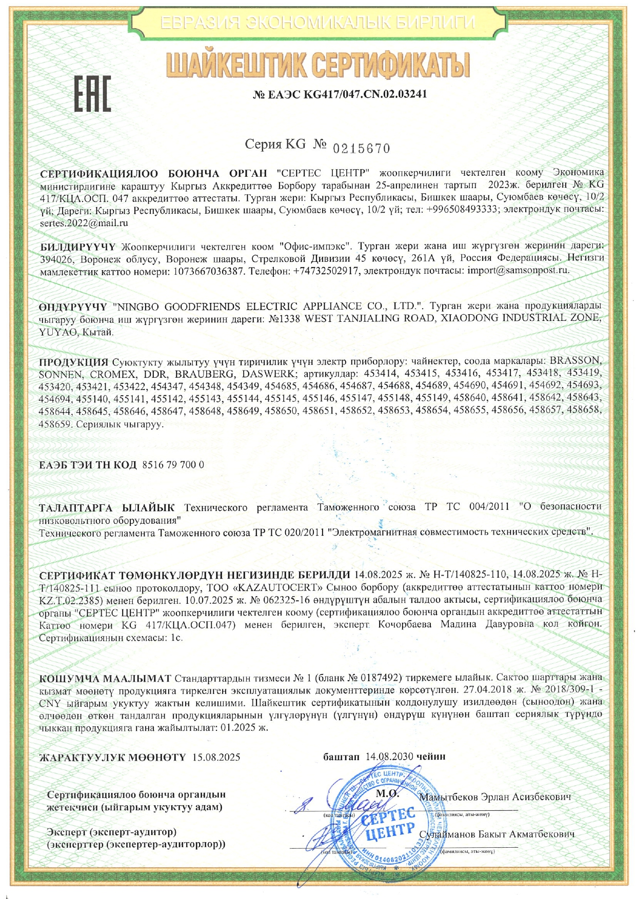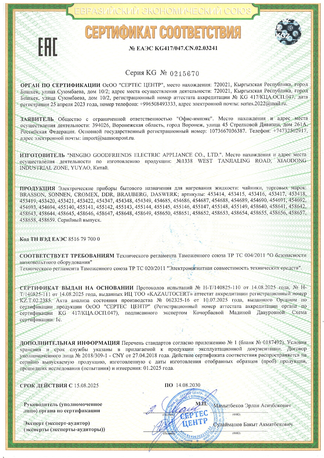 Чайник SONNEN KT-1776, 1,7 л, 2200 Вт, закрытый нагревательный элемент, пластик, черный/горчичный Код товара: 453418 1 151,38 ₽ Купить Производитель:SONNEN Чайник SONNEN KT-1776, выполненный из термостойкого пластика с декоративными вставками, отличается стильным и эргономичным дизайном. Данная модель отлично подходит для эксплуатации как дома, так и в офисе. Мощность чайника составляет 2200 Вт, что позволит воде закипеть за считанные минуты. Закрытый нагревательный элемент увеличит срок службы прибора. Индикатор уровня воды позволит с легкостью определить количество воды в чайнике. Сменный нейлоновый фильтр предотвратит попадание накипи в напиток. На ручке чайника находится кнопка открывания крышки, что делает удобнее его эксплуатацию. Автоотключение при недостаточном количестве воды и защита от перегрева делают данную модель чайника безопасной в использовании. Индикатор проинформирует о том, что чайник включен и процесс нагрева воды запущен. Шнур чайника, при необходимости, можно спрятать в специальный отсек, расположенный в подставке.Производство: КитайОбъем: 1.7 лМощность: 2200 ВтМатериал корпуса: пластикВид нагревательного элемента: закрытыйАвтоотключение при закипании: даСерия: KT-1776Отключение при отсутствии воды: даИндикатор включения: даИндикация уровня воды: даВращение на 360°: даФильтр от накипи: даДлина шнура: 0.75 мЦвет корпуса: черныйШирина: 210 ммВысота: 220 ммГлубина: 165 ммВес (без упаковки): 0.7 кгВес: 956 грРазмер упаковки: 21.9 × 21 × 16.6 смОбъём: 0.009 м3Промежуточная упаковка: 8 штТранспортная упаковка: 8 штШтрих-код: 4606224169460 Файлы Сертификат-1.jpg Сертификат-2.jpg Сертификат-3.jpg Сертификат-4.jpg Сертификат-5.jpg Сертификат-6.jpg Сертификат-7.jpg