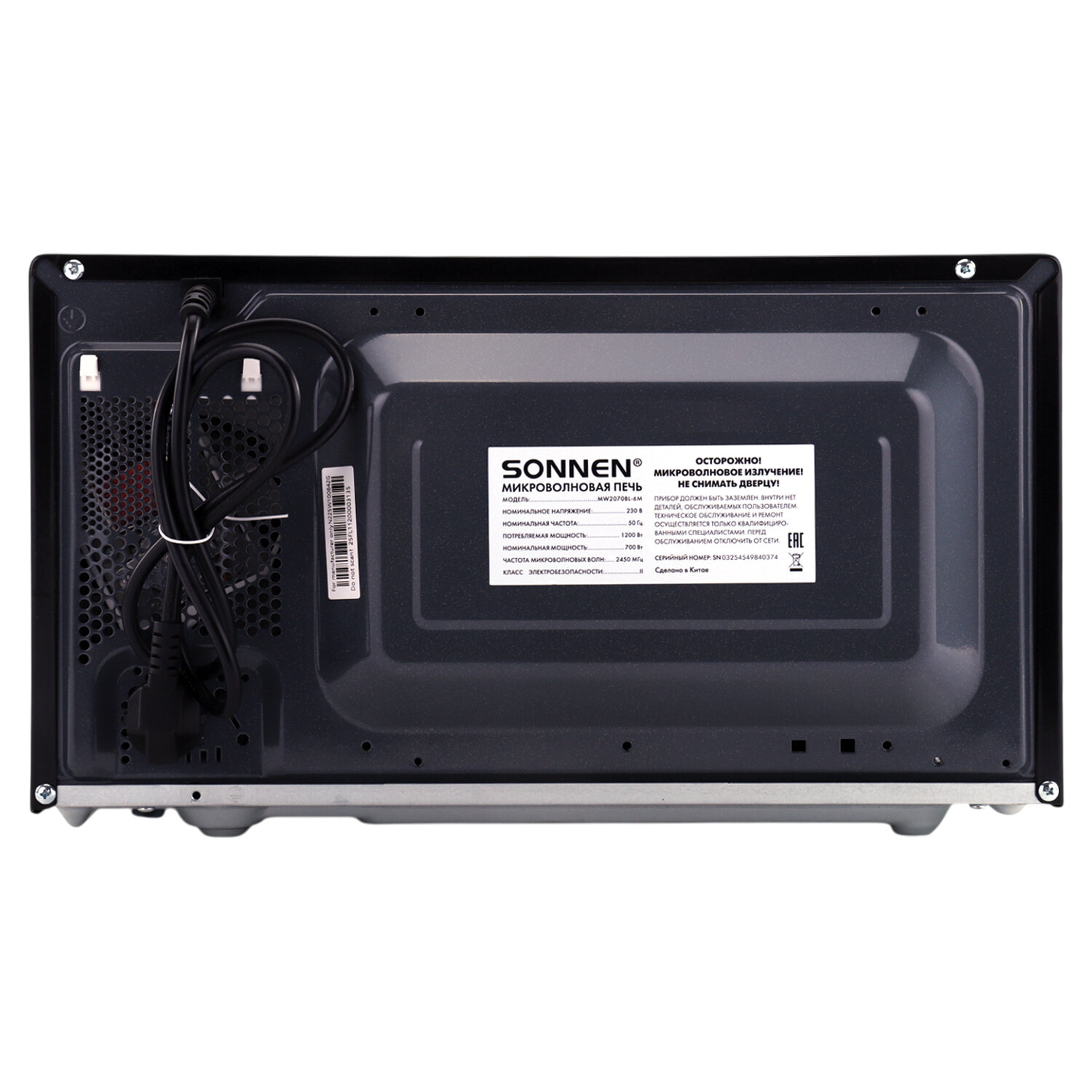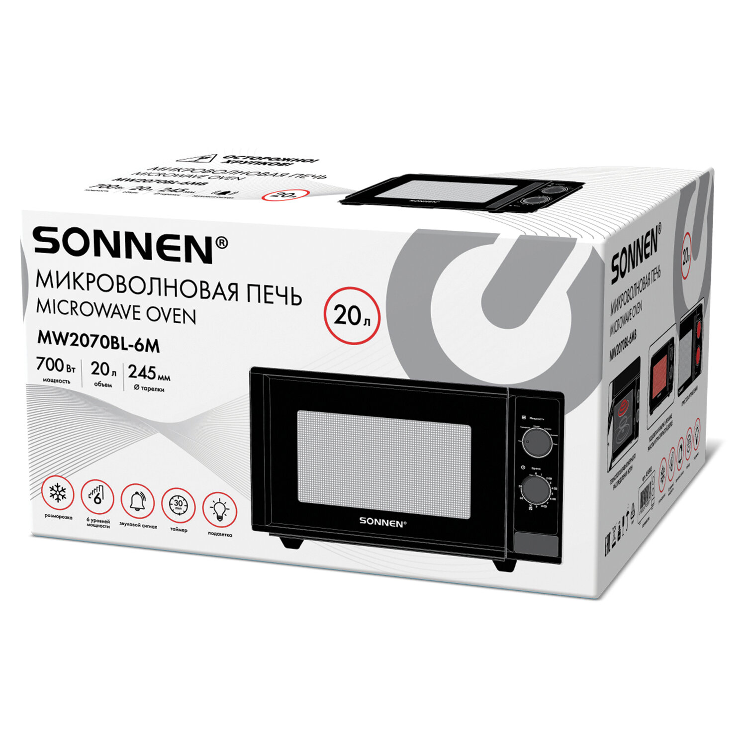 Микроволновая печь SONNEN MW2070BL-6M, 20 л, 700 Вт, таймер, механическое управление, кнопка, черная Код товара: 454984 6 490 ₽ Купить Производитель:SONNEN Стильная микроволновая печь SONNEN – ваш надежный помощник на каждый день! Микроволновая печь SONNEN выполнена в элегантном черном цвете. Обладает всеми необходимыми функциями. Она имеет объем 20 литров, что идеально подходит для приготовления вторых блюд, выпечки и разморозки продуктов. Мощность 700 Вт позволяет быстро и равномерно разогреть различные блюда. Простое механическое управление осуществляется с помощью поворотных переключателей. С их помощью вы можете переключить режим мощности или таймера. В микроволновой печи установлено 6 режимов мощности, благодаря которым вы с легкостью подберете самый подходящий для ваших любимых блюд. Дверца прибора открывается с помощью кнопки. Внутреннее покрытие из эмалированной стали легко очищается губкой с моющим средством или даже обычной влажной салфеткой.Производство: КитайОбъем: 20 лМощность микроволн: 700 ВтУправление: механическоеВнутреннее покрытие: эмалированная стальФункционал: режим размораживанияТаймер: 30 мин.Внутреннее освещение: даНаличие звукового сигнала: даНаличие поворотного стола: даКоличество автоматических программ: 0 шт.Диаметр поддона: 24.5 смОткрывание дверцы: кнопкаСерия: MW207Дизайн: MW2070BL-6MЦвет корпуса: черныйШирина: 26.2 смВысота: 32 смГлубина: 45.2 смВес: 10.5 кгРазмер упаковки: 29.2 × 49.8 × 35.4 смОбъём: 0.0515 м3Промежуточная упаковка: 1 штТранспортная упаковка: 1 штШтрих-код: 4606224455648 Файлы Сертификат-1.jpg Сертификат-2.jpg Сертификат-3.jpg Сертификат-4.jpg Сертификат-5.jpg Сертификат-6.jpg Сертификат-7.jpg