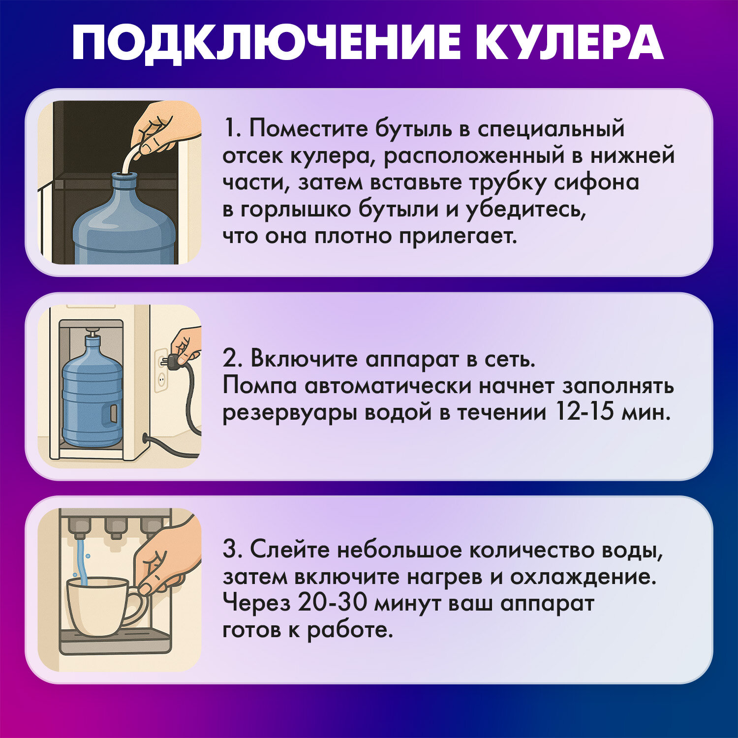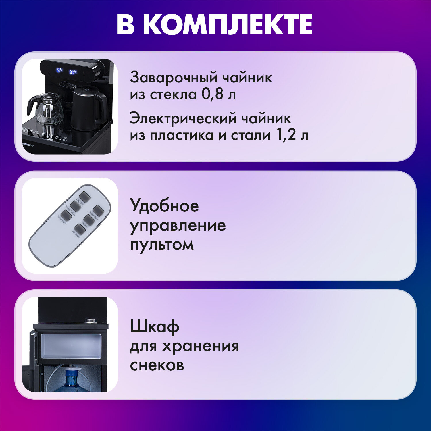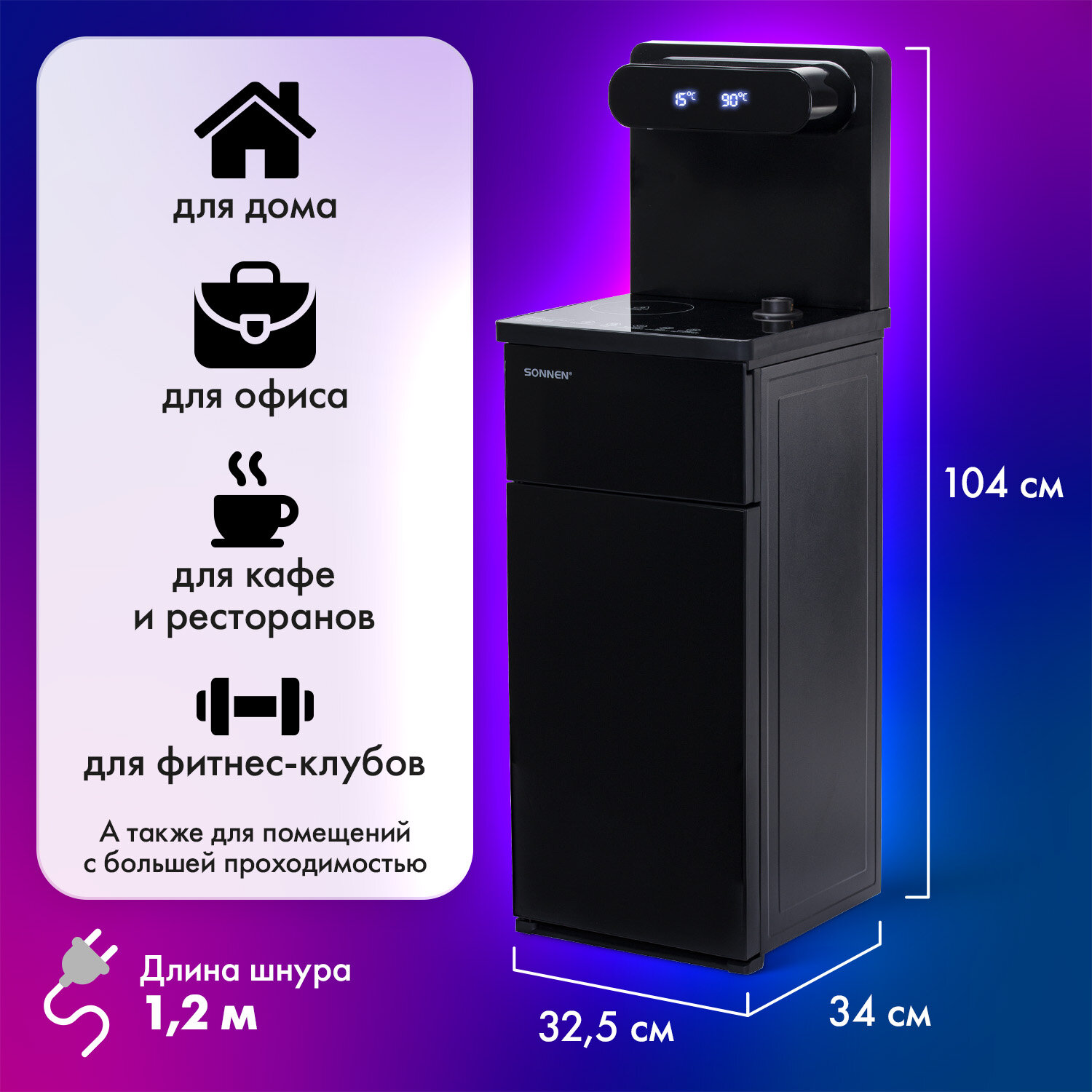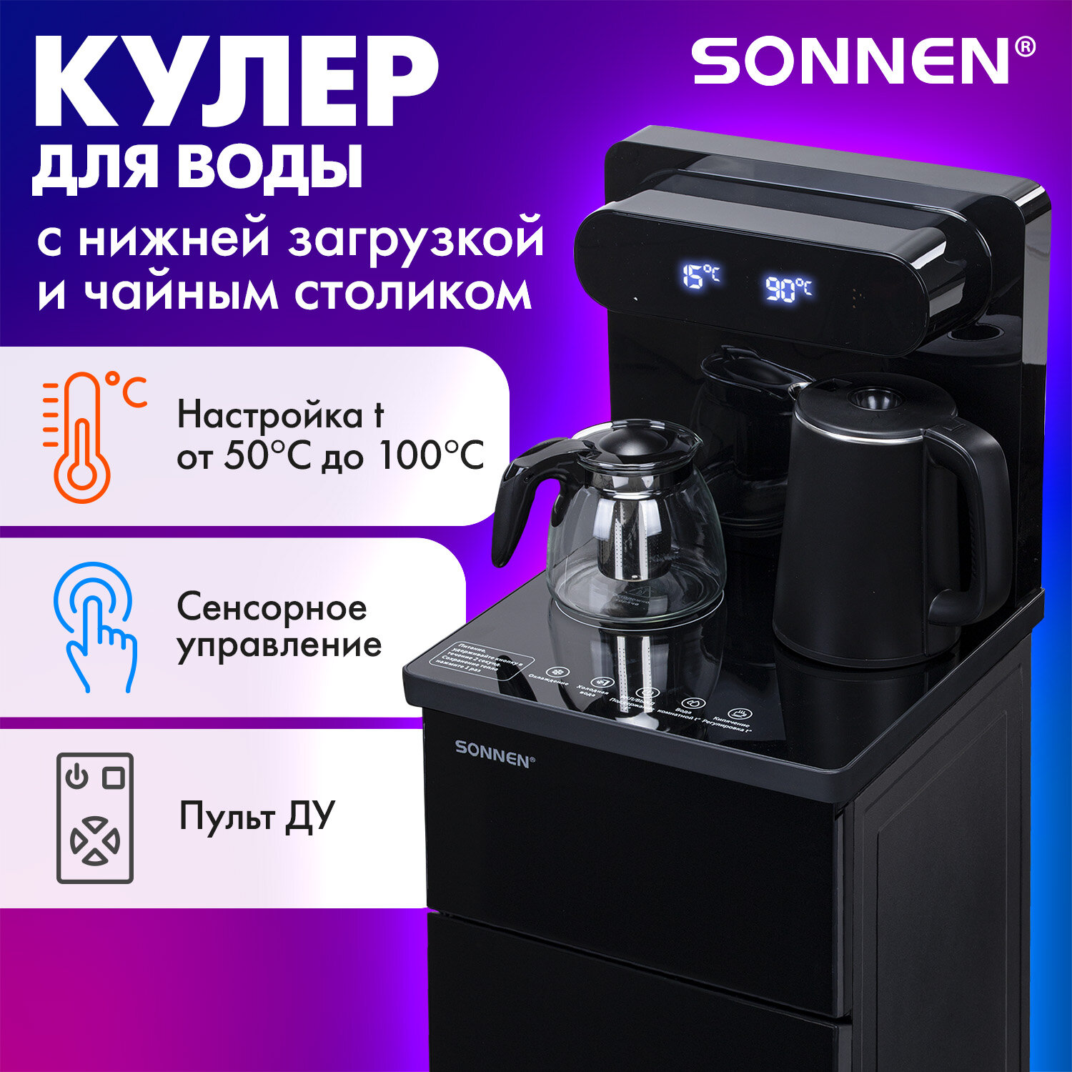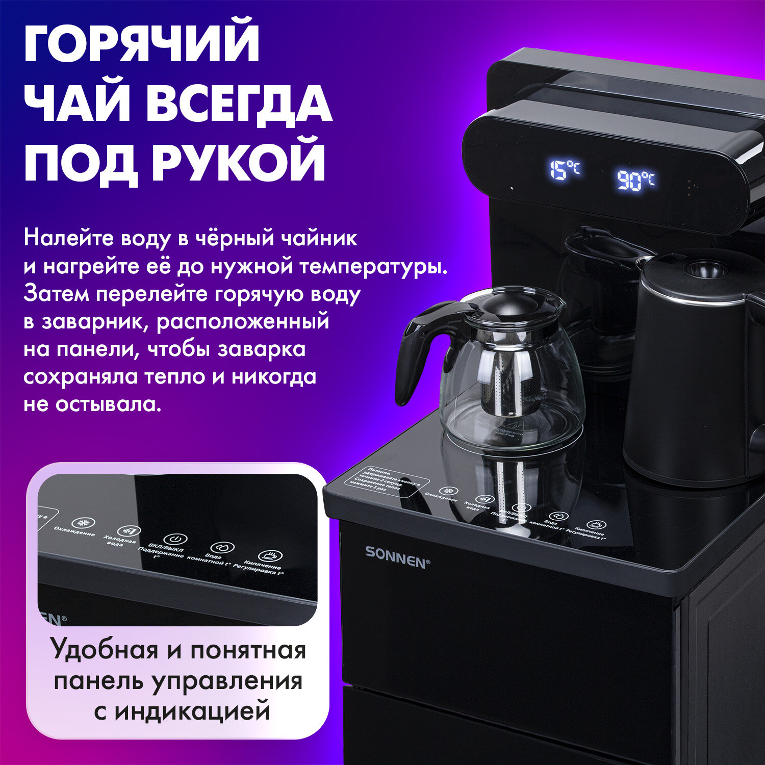 Кулер для воды с чайником SONNEN TBE-01 Tea Bar, напольный, ОХЛАЖДЕНИЕ ЭЛЕКТРОННОЕ, сенсорное управление, пульт ДУ, дисплей, шкафчик Код товара: 455749 14 250,33 ₽ Купить Производитель:SONNEN Кулер для воды SONNEN TBE-01 — это уникальное сочетание кулера и чайного столика, которое станет незаменимым помощником в вашем доме или офисе. Благодаря компактности и функциональности он идеально впишется в интерьер любого помещения. Устройство представляет собой кулер с нижней загрузкой и чайным столиком. На столике размещены заварочный и электрический чайники. Вода подаётся в электрический чайник через кран и затем нагревается. Под заварочным чайником расположена панель для подогрева, благодаря которой заваренный чай остаётся горячим долгое время. Модуль электронного охлаждения мощностью 70 Вт поддерживает температуру холодной воды на уровне 15 °C. На чайном столике расположена панель управления, с помощью которой можно получить холодную воду или воду комнатной температуры, охладить воду, выбрать температуру нагрева или отключить устройство. Доступен нагрев от 50 до 100 °C. Температуру горячей и холодной воды можно отслеживать на дисплее. Управление также возможно с помощью пульта ДУ. Под чайным столиком расположен небольшой шкафчик для хранения снеков к чаю. Перед первым использованием необходимо слить примерно 1 л воды для очистки бака холодной воды и внутренних трубок от скопившейся пыли после производства и транспортировки.Производство: КитайТип установки: напольныйТип охлаждения: электронныйПодача воды с нагревом: даПодача воды с охлаждением: даПодача воды комнатной температуры: даКоличество кранов подачи воды: 2 шт. Серия: TBEРекомендуемое количество пользователей: 10Наличие встроенного отделения для хранения: шкафчикРазмещение бутыли с водой: нижнее размещениеТип крана: сенсорМощность нагрева: 1280 ВтМощность охлаждения: 70 ВтПроизводительность нагрева: 13 л/часПроизводительность охлаждения: 0.75 л/часТемпература нагревания воды: 100 градусТемпература охлаждения воды: 15 градусЕмкость бака для горячей воды: 0 лЕмкость бака для холодной воды: 0.4 лТип нагревательного элемента: ТЭНРегулировка температуры нагрева и охлаждения: даИнформационный дисплей: даЗащита от протечек воды: даПодсветка: даОбъем шкафчика: 6 лНапряжение: 220 ВМатериал корпуса: металл/стекло/пластикЦвет корпуса: черныйДлина шнура: 1.2 мВысота: 1040 ммШирина: 325 ммГлубина: 340 ммВес: 6.2 кгРазмер упаковки: 77.9 × 37.9 × 39 смОбъём: 0.1151 м3Промежуточная упаковка: 1 штТранспортная упаковка: 1 штШтрих-код: 4606224439983 Файлы Сертификат-1.jpg Сертификат-2.jpg Сертификат-3.jpg Сертификат-4.jpg Сертификат-5.jpg