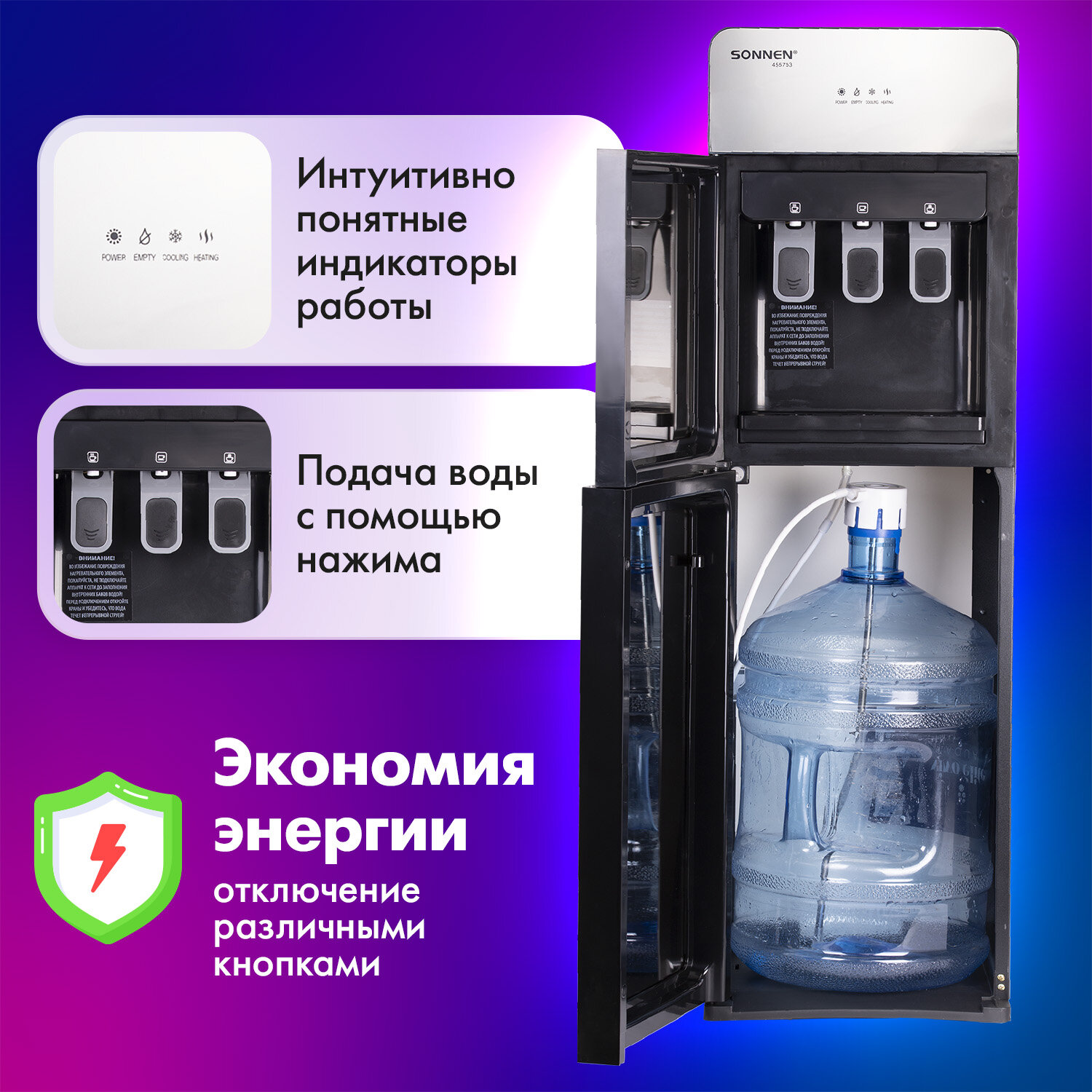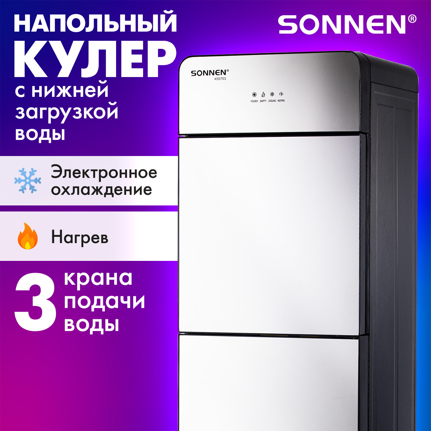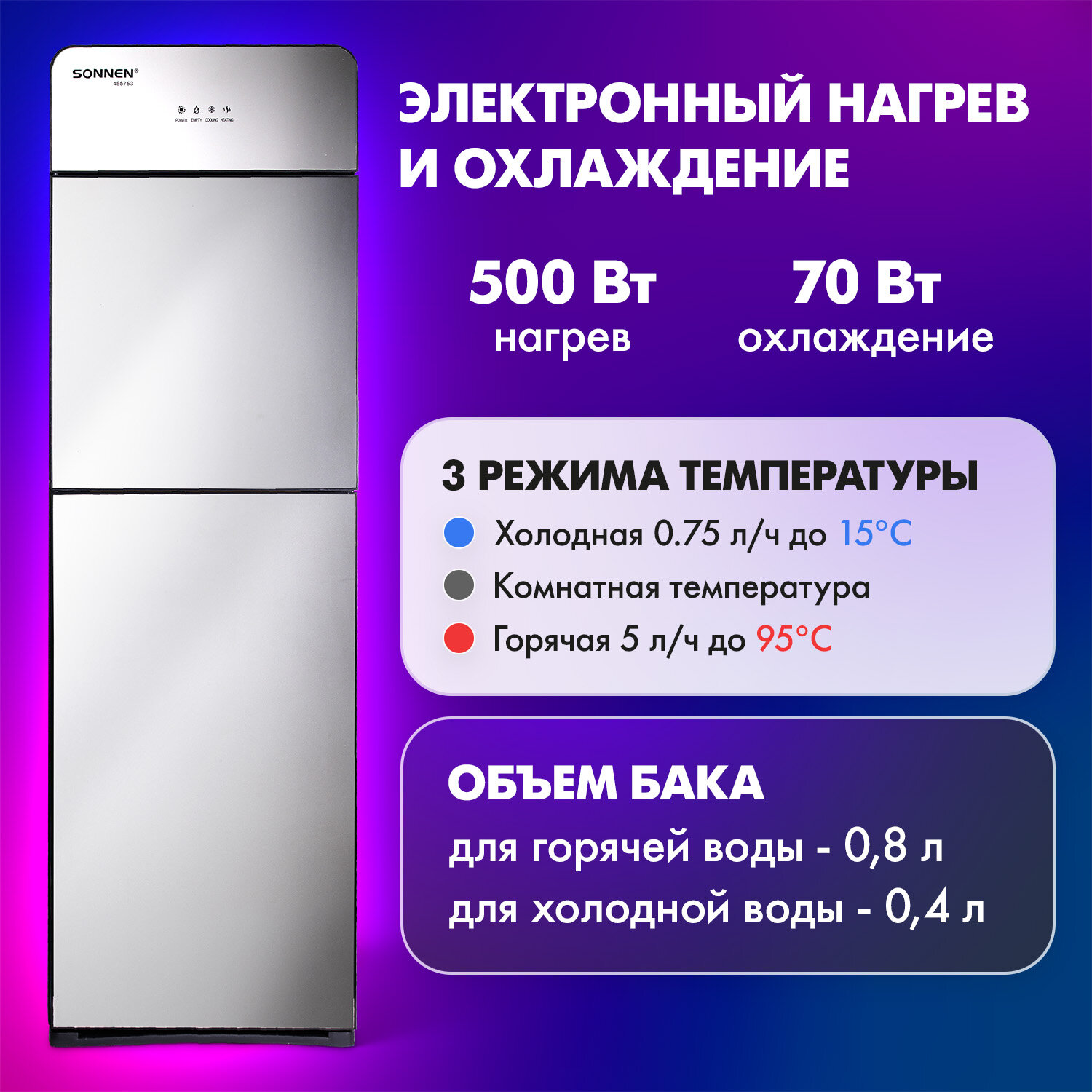 Кулер для воды SONNEN FSE-03G, напольный, нагрев/охлаждение электронное, НИЖНЯЯ ЗАГРУЗКА, 3 крана, зеркальный Код товара: 455753 16 965,04 ₽ Купить Производитель:SONNEN Напольный кулер для воды SONNEN FSE-03G – качественное устройство, которое станет идеальным решением для дома и офиса. Стильный зеркальный корпус гармонично впишется в любой интерьер. Вода нагревается с помощью ТЭНа мощностью 500 Вт, что позволяет достичь температуры 95 °С за считаные минуты. Модуль электронного охлаждения мощностью 70 Вт поддерживает температуру холодной воды на уровне 15 °С. Кулер предназначен для напольного размещения и оснащён 3 кранами типа "нажим кружкой", что позволяет получать не только горячую и холодную воду, но и воду комнатной температуры. Модель оборудована специальным отсеком для установки бутыли в нижней части корпуса. Кулеры с нижней загрузкой облегчают установку бутыли и выглядят более эстетично. Постоянное поддержание высокой температуры воды избавляет от необходимости ждать её нагрева, что особенно важно для крупных компаний с большим количеством сотрудников и посетителей. Перед первым использованием необходимо очистить баки для воды и трубки от скопившейся производственной пыли, для этого нужно слить около 1 л воды.Производство: КитайТип установки: напольныйТип охлаждения: электронныйПодача воды с нагревом: даПодача воды с охлаждением: даПодача воды комнатной температуры: даКоличество кранов подачи воды: 3 шт. Серия: FSE-03Рекомендуемое количество пользователей: 10Крепление стаканодержателя: крепление винтами, крепление магнитомРазмещение бутыли с водой: нижнее размещениеТип крана: нажим кружкойМощность нагрева: 500 ВтМощность охлаждения: 70 ВтПроизводительность нагрева: 5 л/часПроизводительность охлаждения: 0.75 л/часТемпература нагревания воды: 95 градусТемпература охлаждения воды: 15 градусЕмкость бака для горячей воды: 0.8 лЕмкость бака для холодной воды: 0.4 лТип нагревательного элемента: ТЭНЗащита от протечек воды: даПодсветка: даОбъем шкафчика: 0 лНапряжение: 220 ВМатериал корпуса: пластик, стеклоЦвет корпуса: серебристыйДлина шнура: 1.2 мВысота: 1020 ммШирина: 305 ммГлубина: 310 ммВес: 8 кгРазмер упаковки: 109.3 × 35.5 × 35.5 смОбъём: 0.1377 м3Промежуточная упаковка: 1 штТранспортная упаковка: 1 штШтрих-код: 4606224455600 Файлы Приложение-1.pdf Сертификат-1.jpg Сертификат-2.jpg Сертификат-3.jpg Сертификат-4.jpg Сертификат-5.jpg