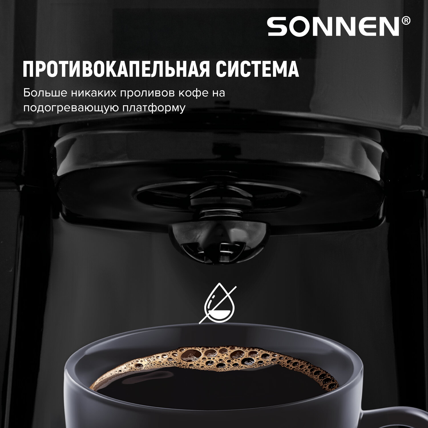 Кофеварка капельная SONNEN CM1095, 900 Вт, объем 1,8 л, подогрев кофе, противокапельная система, черная Код товара: 456334 2 131,63 ₽ Купить Производитель:SONNEN Сделать утро по-настоящему добрым поможет капельная кофеварка SONNEN CM1095 – стильное и удобное устройство для приготовления насыщенного бодрящего напитка! Капельная кофеварка SONNEN CM1095 готовит ароматный кофе и управляется всего одной кнопкой! Она компактная и простая в использовании. Кофеварка идеально подойдёт для приготовления кофе дома или в офисе. Мощность 900 Вт позволяет приготовить напиток всего за несколько минут. Кофеварка оснащена многоразовым нейлоновым фильтром, который удобно мыть после использования. Корпус из прочного пластика обеспечивает долговечность и надёжность устройства. Резервуар ёмкостью 1,8 л позволяет за один раз приготовить кофе на 14 чашек объёмом 120 мл. Прозрачный корпус кофейника позволяет всегда видеть, сколько кофе осталось. По окончании приготовления кофеварка переходит в режим подогрева. Благодаря платформе с подогревом ваш кофе останется горячим в течение 40 минут, после чего устройство выключится автоматически.Производство: КитайЕмкость резервуара для воды: 1.8 лМощность: 900 ВтИспользуемый кофе: молотыйАвтоматическое отключение: даСъемный многоразовый фильтр: даТип кофеварки: капельнаяСъемный фильтродержатель: даИндикатор уровня воды: даКомплектация: стеклянный кувшинОсновной цвет корпуса: черныйДополнительный цвет корпуса: черныйМатериал корпуса: пластикМатериал резервуара для воды: пластикВысота: 346 ммШирина: 184.8 ммГлубина: 239 ммВес: 1.47 кгРазмер упаковки: 22.8 × 39.2 × 30.5 смОбъём: 0.0308 м3Промежуточная упаковка: 4 штТранспортная упаковка: 4 штШтрих-код: 4606224408545 Файлы Приложение-1.pdf Сертификат-1.jpg Сертификат-2.jpg Сертификат-3.jpg Сертификат-4.jpg Сертификат-5.jpg Сертификат-6.jpg
