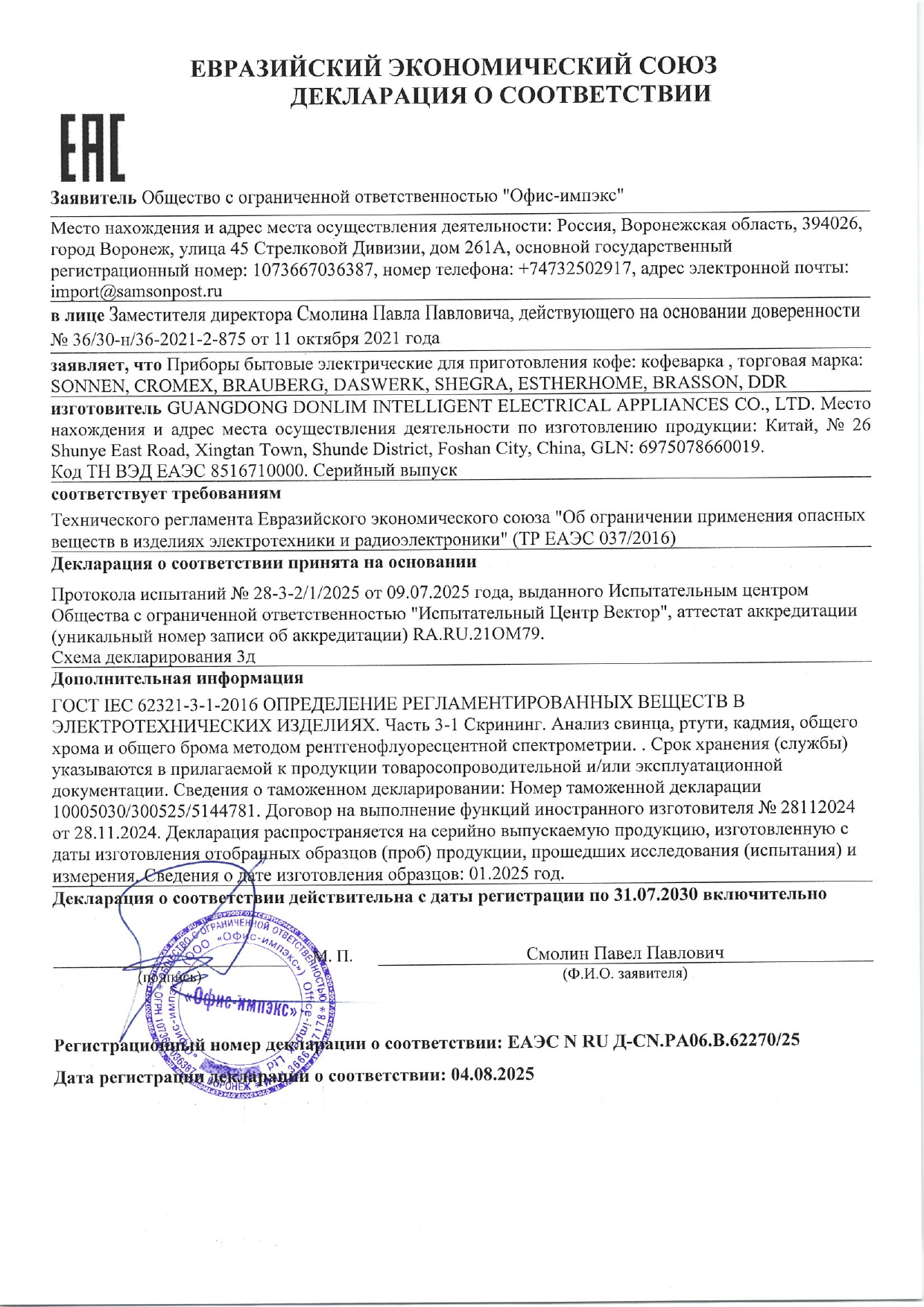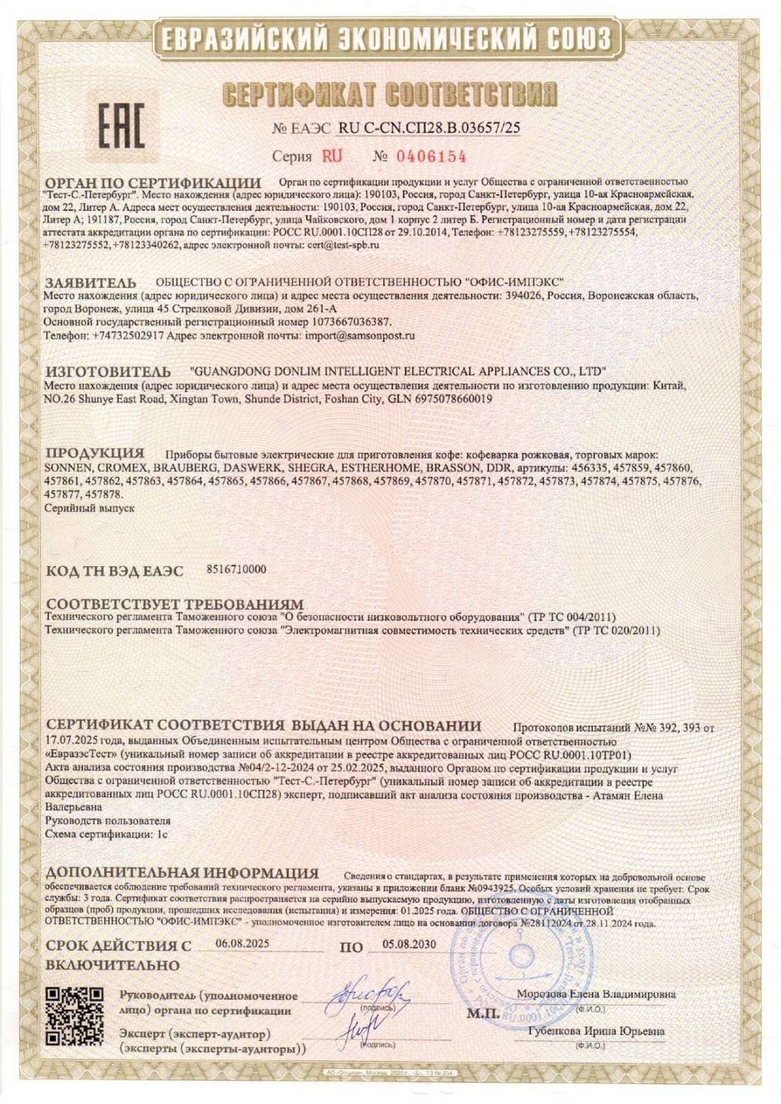Кофеварка рожковая ручной капучинатор SONNEN CM8501, 1100 Вт, 1,5 л, 15 бар, черная/серебро Код товара: 456335 5 390,68 ₽ Купить Производитель:SONNEN SONNEN CM8501 – это современная рожковая кофеварка, с помощью которой вы легко приготовите любимые кофейные напитки. Отличный выбор для гурманов, желающих ежедневно наслаждаться букетом вкусов и ароматов свежего кофе. Рожковая кофеварка SONNEN CM8501 оснащена итальянской помпой, которая создаёт постоянное давление 15 бар. Благодаря стабильно высокому давлению кофе получается насыщенным, с плотной пенкой и богатым ароматом. Мощность 1100 Вт позволяет приготовить напиток всего за несколько минут. Кофеварка может одновременно приготовить две порции эспрессо – это удобно, когда нужно быстро сварить кофе к завтраку для себя и близких или угостить гостей ароматным напитком. Съёмный резервуар для воды объёмом 1,5 литра легко наполнять и чистить. Для любителей капучино есть возможность самостоятельно взбивать молочную пенку. Насадка-капучинатор обеспечивает оптимальное давление и подачу пара, благодаря чему молоко эффективно аэрируется и превращается в пенку с воздушной и кремообразной текстурой. Кофеварка оборудована поддоном для сбора капель со съёмной решёткой из нержавеющей стали – его легко мыть и устанавливать обратно. В поддоне есть специальный поплавок: если он наполнится водой, поплавок поднимется выше решётки. SONNEN CM8501 идеально подойдёт для приготовления кофе дома или в офисе.Производство: КитайЕмкость резервуара для воды: 1.5 лТип управления: кнопочноеТип нагревателя: бойлерМощность: 1100 ВтДавление: 15 барИспользуемый кофе: молотыйТип кофеварки: рожковаяСъемный поддон для сбора капель: даАвтоматическое отключение: даПодача горячей воды: даКапучинатор: даТип капучинатора: ручнойОдновременное приготовление 2 чашек кофе: даЦвет: черныйМатериал корпуса: пластикМатериал рожка: металлВысота: 292 ммШирина: 275 ммГлубина: 217 ммВес: 3 кгСерия: CMРазмер упаковки: 26.4 × 35.1 × 32.1 смОбъём: 0.0335 м3Промежуточная упаковка: 2 штТранспортная упаковка: 2 штШтрих-код: 4606224408552 Файлы Приложение-1.pdf Сертификат-1.jpg Сертификат-2.jpg Сертификат-3.jpg Сертификат-4.jpg Сертификат-5.jpg