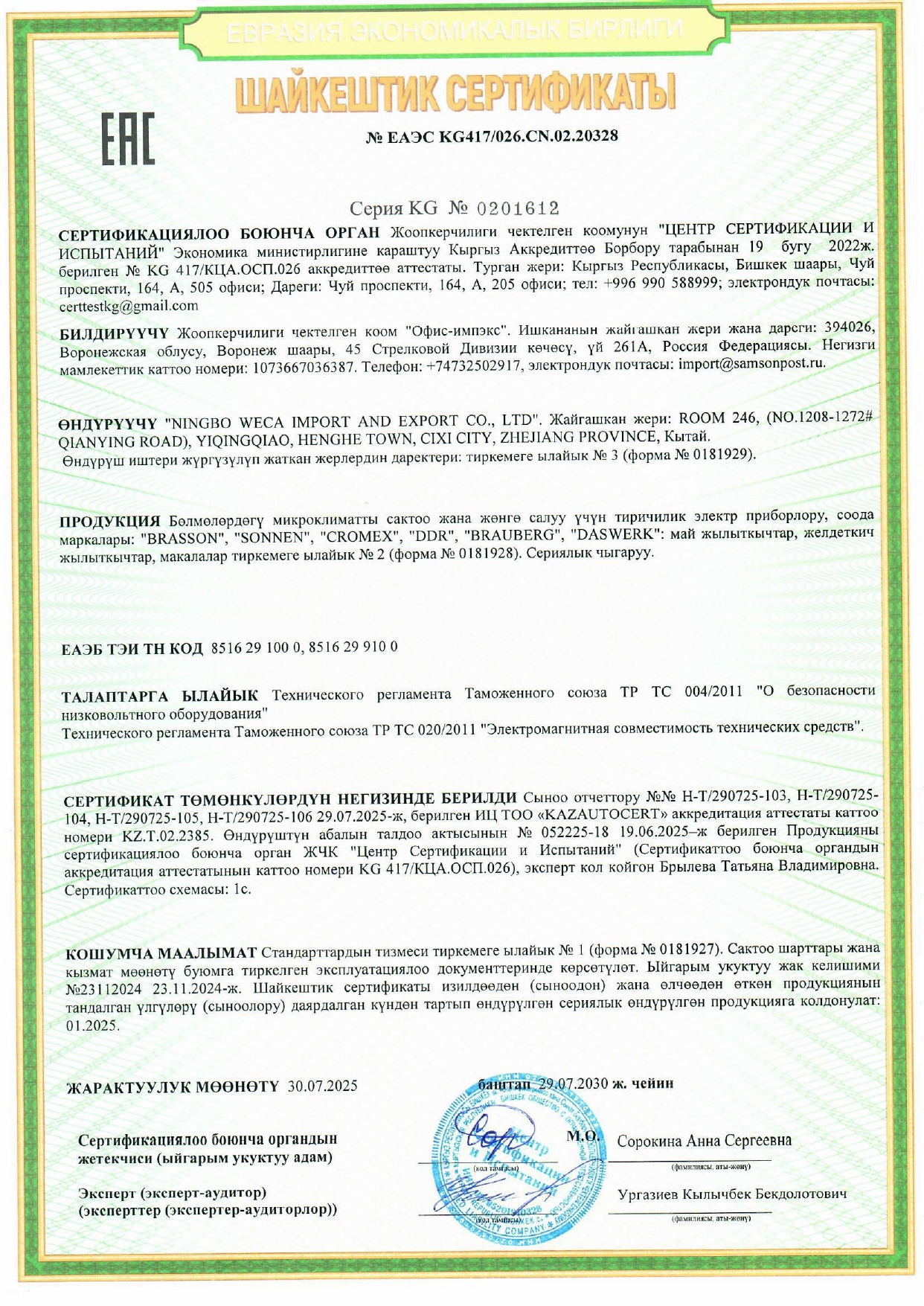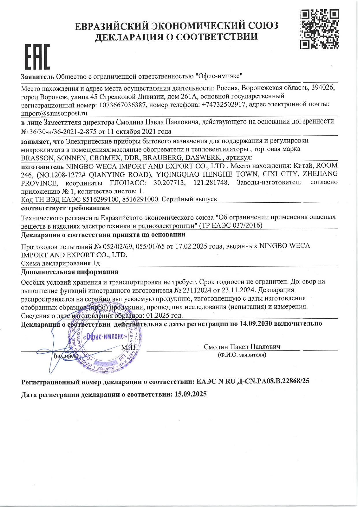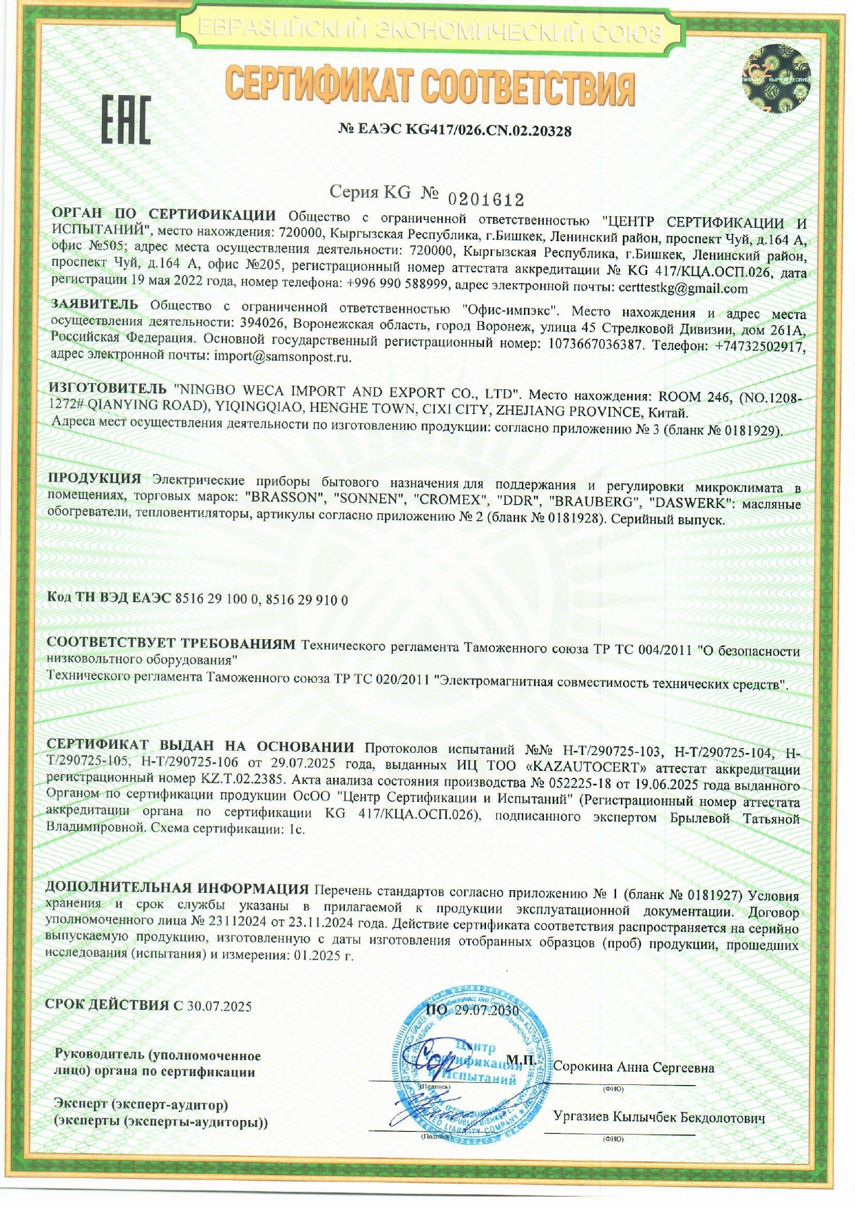 Обогреватель масляный SONNEN DFS-9E, 9 секций, 2000 Вт, 3 режима, механическое управление, белый Код товара: 457780 4 603,95 ₽ Купить Производитель:SONNEN Масляный обогреватель SONNEN DFS-9E обеспечит комфорт и тепло на даче, в офисе или дома. Обогреватель SONNEN DFS-9E способен обеспечить быстрый и эффективный обогрев помещения площадью до 20 м2. Устройство оборудовано интуитивно простым механическим управлением. Для создания комфортных условий в помещении Вы можете выбрать один из 3 температурных режимов. Также обогреватель оборудован встроенным термостатом и индикатором работы. Устройство безопасно в эксплуатации, не сжигает кислород в помещении и обладает функцией защиты от перегрева. Обогреватель подключается к бытовой электрической сети. Его можно свободно перемещать при помощи колес и удобной ручки, также предусмотрено место для хранения шнура. Может быть размещен в любом удобном месте.Производство: КитайМощность: 2000 ВтКоличество секций: 9 шт.Рекомендованная площадь обогрева: 20 м2Тип управления: механическоеТермостат (терморегулятор): даИндикация: даСерия: DFSОтключение при перегреве: даНожки-колесики в комплекте: даНаличие ручки для перемещения: даМесто для хранения шнура: даДлина шнура: 1.5 мВысота товара: 540 ммШирина товара: 240 ммГлубина товара: 410 ммЦвет: белый/серыйВес (без упаковки): 7.1 кгВес: 7,95 кгРазмер упаковки: 58.3 × 44.6 × 13.7 смОбъём: 0.0356 м3Промежуточная упаковка: 1 штТранспортная упаковка: 1 штШтрих-код: 4606224486468 Файлы Приложение-1.pdf Сертификат-1.jpg Сертификат-2.jpg Сертификат-3.jpg Сертификат-4.jpg Сертификат-5.jpg Сертификат-6.jpg Сертификат-7.jpg Сертификат-8.jpg Сертификат-9.jpg Сертификат-10.jpg Сертификат-11.jpg Сертификат-12.jpg