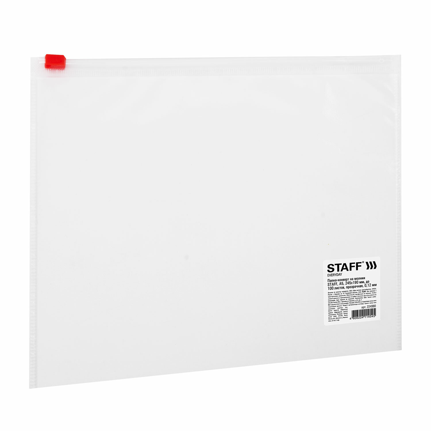 Папка-конверт на молнии МАЛОГО ФОРМАТА (245х190 мм), А5, прозрачная, 0,12 мм, STAFF Ликвидация Код товара: 224980 22,52 ₽ Купить Производитель:STAFF Папка-конверт на молнии STAFF незаменима для хранения и транспортировки документов. Изготовлена из прочного прозрачного пластика толщиной 0,12 мм с гладкой фактурой. Формат А5 (245х190 мм). Герметичная застежка-зиплок защищает документы от механических повреждений, а также пыли и влаги. Цвет молнии - ассорти (поставляется без возможности выбора).Производство: РоссияФормат: A5Фактура: гладьКоличество отделений: 1 шт.Застежка: молнияЦвет: прозрачныйЦвет молнии: ассортиВысота: 245 ммШирина: 190 ммТолщина пластика: 120 мкмМатериал: полипропиленВес: 11 грРазмер упаковки: 0.2 × 25.5 × 19.5 смПромежуточная упаковка: 20 штТранспортная упаковка: 500 штШтрих-код: 4606224114545 Сертификат-1.jpg Сертификат-2.jpg