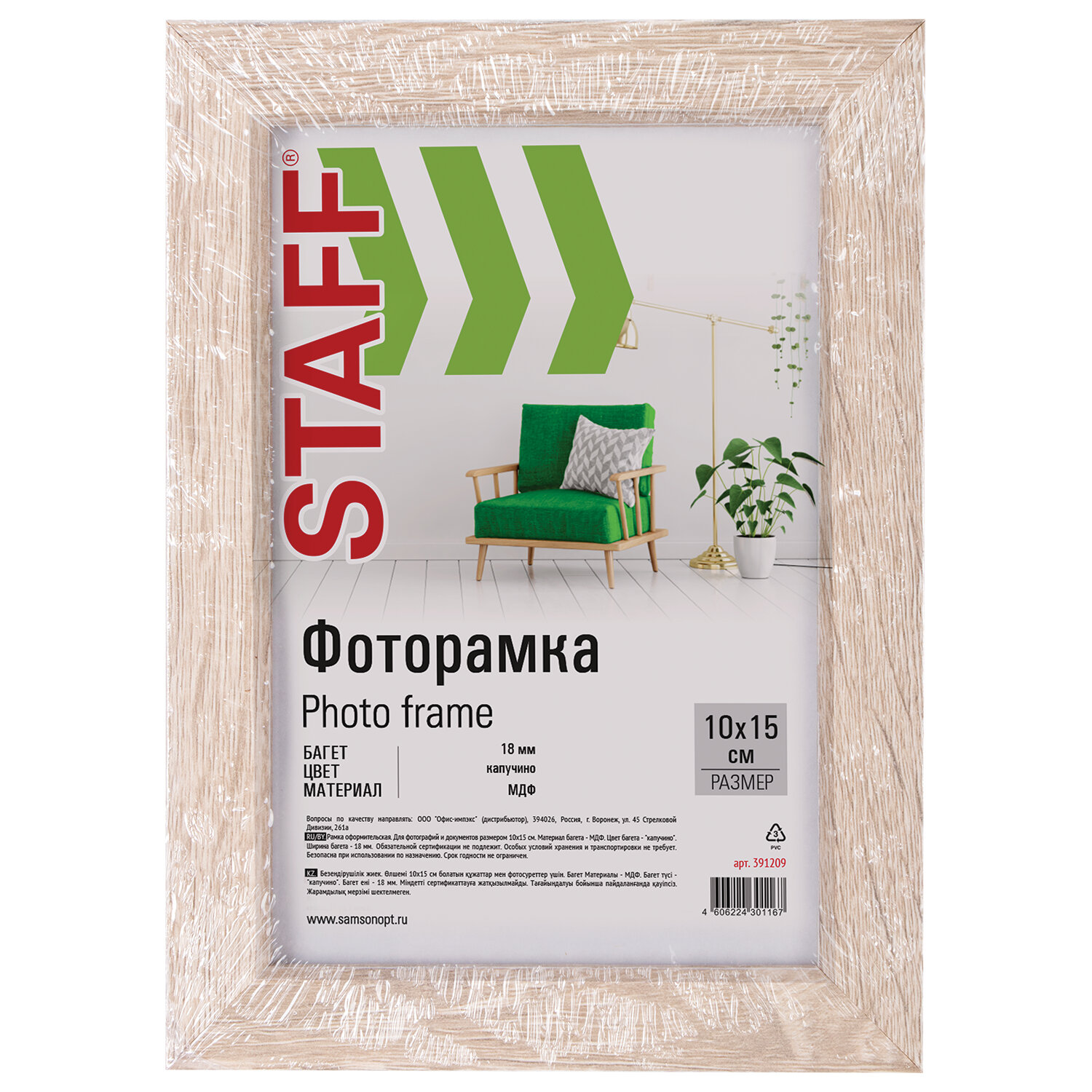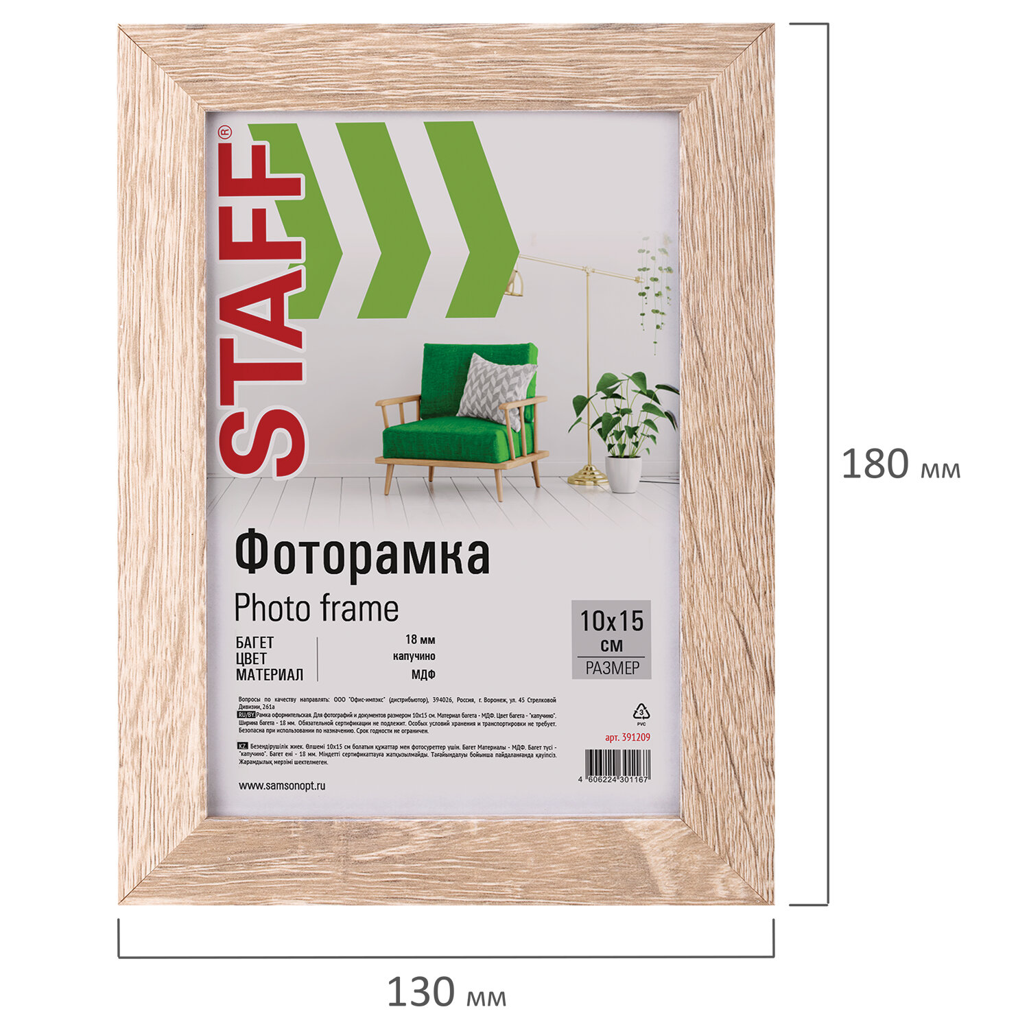 Рамка 10х15 см, небьющаяся, STAFF "Grand", багет 18 мм, цвет "капучино", МДФ Код товара: 391209 296,95 ₽ Купить Производитель:STAFF Рамка STAFF "Grand" с фотографиями, наградами, дипломами, сертификатами и другими ценными документами гармонично будет смотреться на стенах дома и офиса, салонов и предприятий, магазинов и различных учреждений. Рамка компактного формата А6 (10х15 см) выполнена из материала МДФ в цвете "капучино", за счет чего отлично впишется в домашний и деловой интерьер. Имеется возможность вертикального и горизонтального подвеса, а также имеется подставка для установки рамки на столе. Ширина багета – 18 мм. Микрогофрокартон обеспечивает плотное прилегание и отсутствие в будущем деформации содержимого в рамке. Поставляется в термоусадочной пленке, которая гарантирует сохранность рамки при транспортировке, отсутствие сколов и потертостей. ВНИМАНИЕ! На данный момент производится перевод данного артикула со стекла на пластиковую вставку. На переходный период допускается поставка данной продукции как со стеклом, так и с пластиком.Производство: РоссияРазмер: 10х15 смНазначение: для фотографий, для дипломов, сертификатов, грамот, для студийных и оформительских работСерия: GrandДизайн: СовременныйМатериал рамки: МДФЦвет рамки: бежевыйВозможность размещения: вертикальное, горизонтальноеПодставка для установки на столе: даШирина багета: 18 ммМатериал вставки: стеклоМатериал подложки: микрогофрокартонУпаковка: термоусадочная пленкаВес: 138 грРазмер упаковки: 1.1 × 17.8 × 12.8 смОбъём: 0.0004 м3Промежуточная упаковка: 50 штТранспортная упаковка: 50 штШтрих-код: 4606224301167 Файлы Сертификат-1.jpg Сертификат-2.jpg Сертификат-3.jpg Сертификат-4.jpg Сертификат-5.jpg Сертификат-6.jpg Сертификат-7.jpg Сертификат-8.jpg Сертификат-9.jpg Сертификат-10.jpg Сертификат-11.jpg Сертификат-12.jpg Сертификат-13.jpg Сертификат-14.jpg Сертификат-15.jpg Сертификат-16.jpg Сертификат-17.jpg Сертификат-18.jpg Сертификат-19.jpg Сертификат-20.jpg Сертификат-21.jpg Сертификат-22.jpg Сертификат-23.jpg Сертификат-24.jpg Сертификат-25.jpg Сертификат-26.jpg