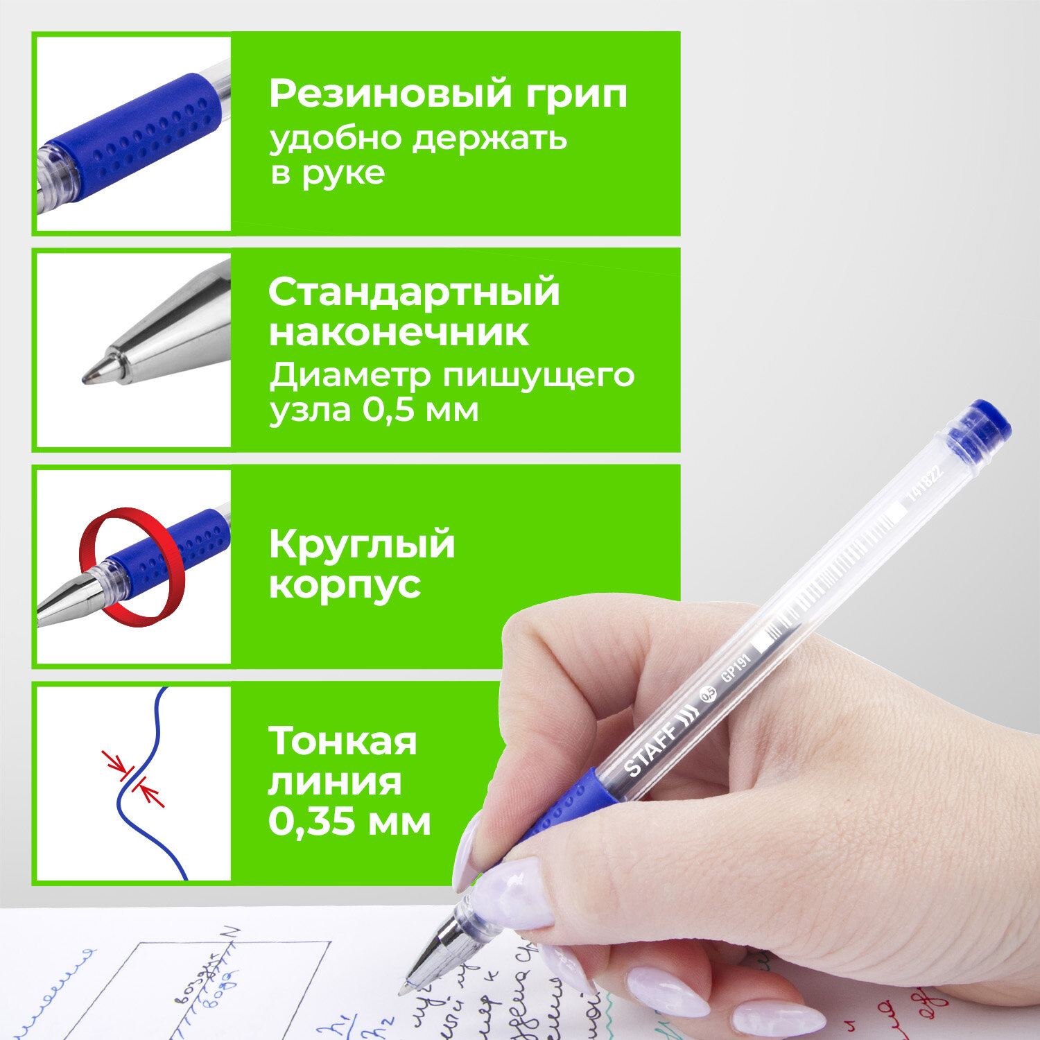 Ручка гелевая STAFF "EVERYDAY" GP-191, синяя, ВЫГОДНЫЙ КОМПЛЕКТ 12 штук, линия письма 0,35 мм, с грипом Код товара: 880215 176,76 ₽ Купить Производитель:STAFF Гелевая ручка STAFF "EVERYDAY" обеспечивает комфортное и качественное письмо. Имеет круглый прозрачный корпус с резиновым держателем. Детали ручки выполнены в цвет синих чернил. Сменный стержень длиной 130 мм со стандартным наконечником позволит использовать ручку максимально долго. Диаметр пишущего узла, равный 0,5 мм, создает линию письма, равную 0,35 мм.Производство: КитайЦвет чернил: синийТолщина линии письма: 0.35 ммДиаметр пишущего узла: 0.5 ммФорма наконечника: стандартныйКоличество в комплекте: 12 шт.Серия: EVERYDAYДлина сменного стержня: 130 ммЭргономичная зона захвата: резиновый держательЦвет корпуса: прозрачныйФорма корпуса: круглаяПокрытие корпуса: без дополнительного покрытияУпаковка: картонная коробкаСрок годности: 48 месВес: 90 грРазмер упаковки: 2.5 × 15.2 × 6.5 смОбъём: 0.0003 м3Промежуточная упаковка: 144 штТранспортная упаковка: 144 штШтрих-код: 4606224328072 Сертификат-1.jpg Сертификат-2.jpg Сертификат-3.jpg