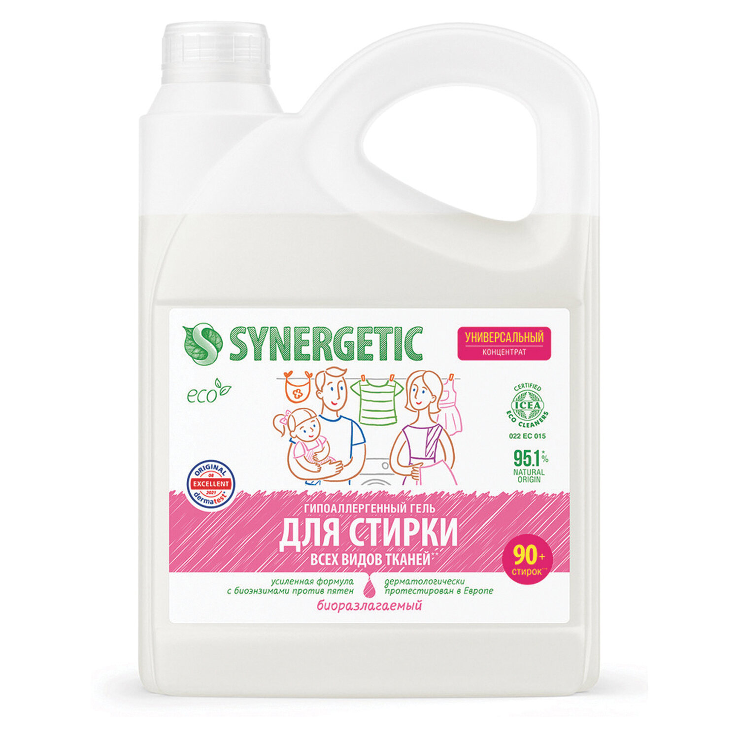 Гель для стирки для всех видов тканей 2,75 л SYNERGETIC, гипоаллергенный Код товара: 606750 756,97 ₽ Купить Производитель:SYNERGETIC Высококонцентрированное профессиональное средство предназначено для стирки любых типов тканей при температуре от 40 до 60 °C. Подходит для стирки в стиральных машинах любого типа и ручной стирки. Биоразлагаемый концентрированный гель для стирки SYNERGETIC универсальный обеспечивает бережное и эффективное очищение тканей, гигиеническую чистоту одежды и устраняет неприятные запахи. Комбинация энзимов и растительных ПАВ эффективно удаляет загрязнения и свежие пятна с волокон ткани даже в холодной воде. Функциональные добавки предотвращают окрашивание, а также повторное оседание загрязнений на ткани, сохраняя ее первоначальный вид, насыщенность цвета, прочность и структуру. Гипоаллергенная отдушка на основе эфирных масел оставляет легкий и приятный аромат. Гель предназначен для стирки всех видов тканей, кроме деликатных и мембранных, а также шерсти и шелка. Средство можно использовать в стиральных машинах любого типа и при ручной стирке при температуре 15-90 °C. Биоразлагаемый гель полностью выполаскивается из тканей, подходит для стирки детского белья 0+ и одежды людей с чувствительной кожей. Состав: подготовленная вода > 30%, комплекс растительных А-тензидов 5-15%, комплекс растительных Н-тензидов < 5%, зеленый хелат < 5%, парфюмерная композиция "Ландыш" (масла жасмина, герани, нероли, розы).Производство: РоссияТип: автоматОбъем/Вес: 2750 мл/гВид средства: гельНазначение: для всех типов бельяОтдушка: цветочнаяГипоаллергенный: даКоличество бункеров: 0 шт.Серия: LAUNDRYLIQUIDВид упаковки: канистраСрок годности: 36 месРазмер упаковки: 25.9 × 18 × 9.6 смОбъём: 0.005 м3Промежуточная упаковка: 6 штТранспортная упаковка: 6 штШтрих-код: 4623722441836 Сертификат-1.jpg Сертификат-2.jpg
