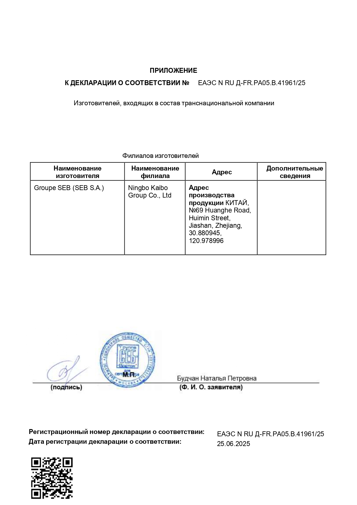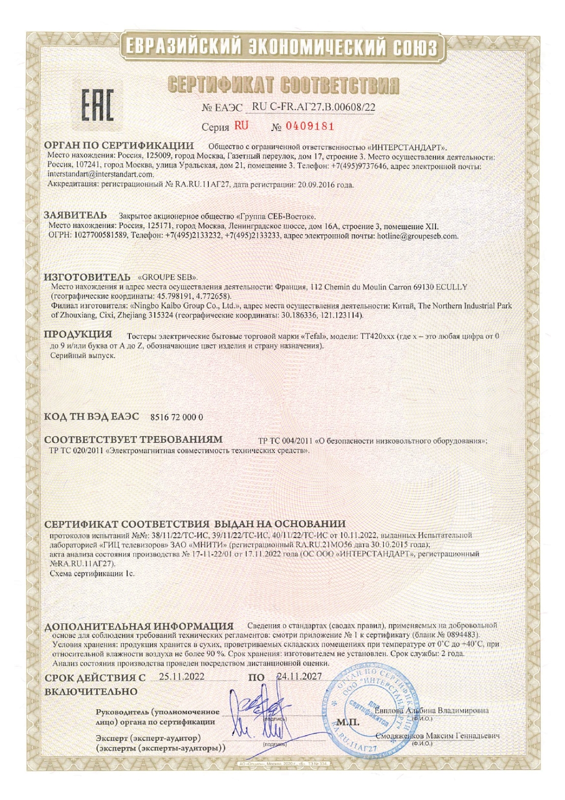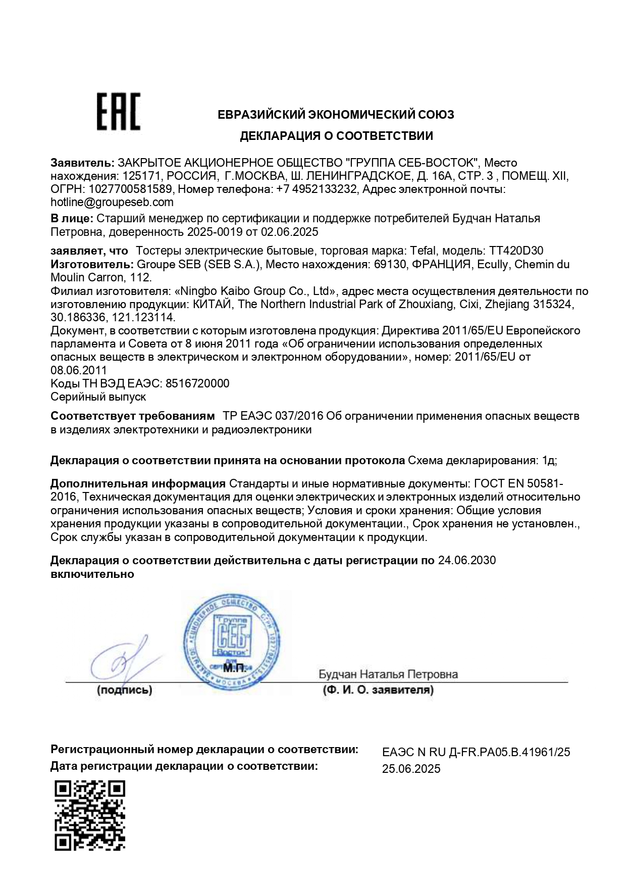 Тостер TEFAL TT420D30, 900 Вт, 2 тоста, 7 режимов, сталь, серебристый Код товара: 456500 5 069,99 ₽ Купить Производитель:TEFAL Элегантный корпус из нержавеющей стали позволил TEFAL сделать из модели TT420D30 незаменимого и яркого помощника на каждый день. Тостер с двумя отсеками для хлеба и 7 уровнями поджарки станет вашим надежным помощником для идеального завтрака. Мощность 900 Вт позволяет быстро приготовить тосты, а режимы "Разморозка" и "Подогрев" делают его универсальным для любых задач. Специальная термоизоляция стенок защищает от ожогов, а высокий подъем тостов обеспечивает удобство при извлечении готового хлеба. Благодаря мощности 900 Вт вы сможете приготовить вкусный завтрак за считанные минуты. Два отсека вмещают ломтики хлеба любого размера, а 7 уровней поджарки помогут добиться идеального результата. Поддон для крошек и отсек для кабеля упрощают уход, а прорезиненные ножки предотвращают скольжение по поверхности стола. Функция остановки позволяет прервать приготовление на любом этапе, а система автоматического центрирования обеспечивает равномерную поджарку. Управление осуществляется с помощью удобных кнопок и регулятора на боковой панели. Стильный корпус из нержавеющей стали станет украшением любой кухни. Производитель оставляет за собой право без предварительного уведомления вносить изменения в технические характеристики, комплектацию и конструкцию, не ухудшающие эксплуатационные характеристики изделия.Производство: КитайТип товара: тостерТип управления: механическоеМощность: 900 ВтКоличество отделений: 2Количество тостов/вафель: 2Количество панелей: 0Количество степеней обжаривания: 7Функционал: индикатор работы, подогрев, размораживаниеСерия: TT420D30Поддон для крошек: даМатериал корпуса: металлЦвет корпуса: черный/серебристыйВысота: 19 смШирина: 26.5 смГлубина: 17.5 смВес: 1.61 кгДизайн: TT420D30Размер упаковки: 21.9 × 33.4 × 22.7 смОбъём: 0.0196 м3Промежуточная упаковка: 2 штТранспортная упаковка: 2 штШтрих-код: 3016661148187 Файлы Приложение-1.pdf Сертификат-1.jpg Сертификат-2.jpg Сертификат-3.jpg Сертификат-4.jpg Сертификат-5.jpg Сертификат-6.jpg