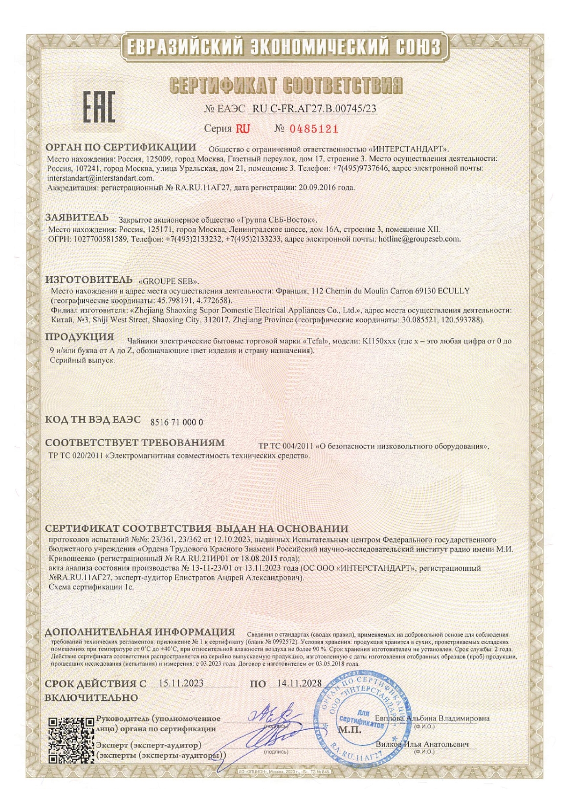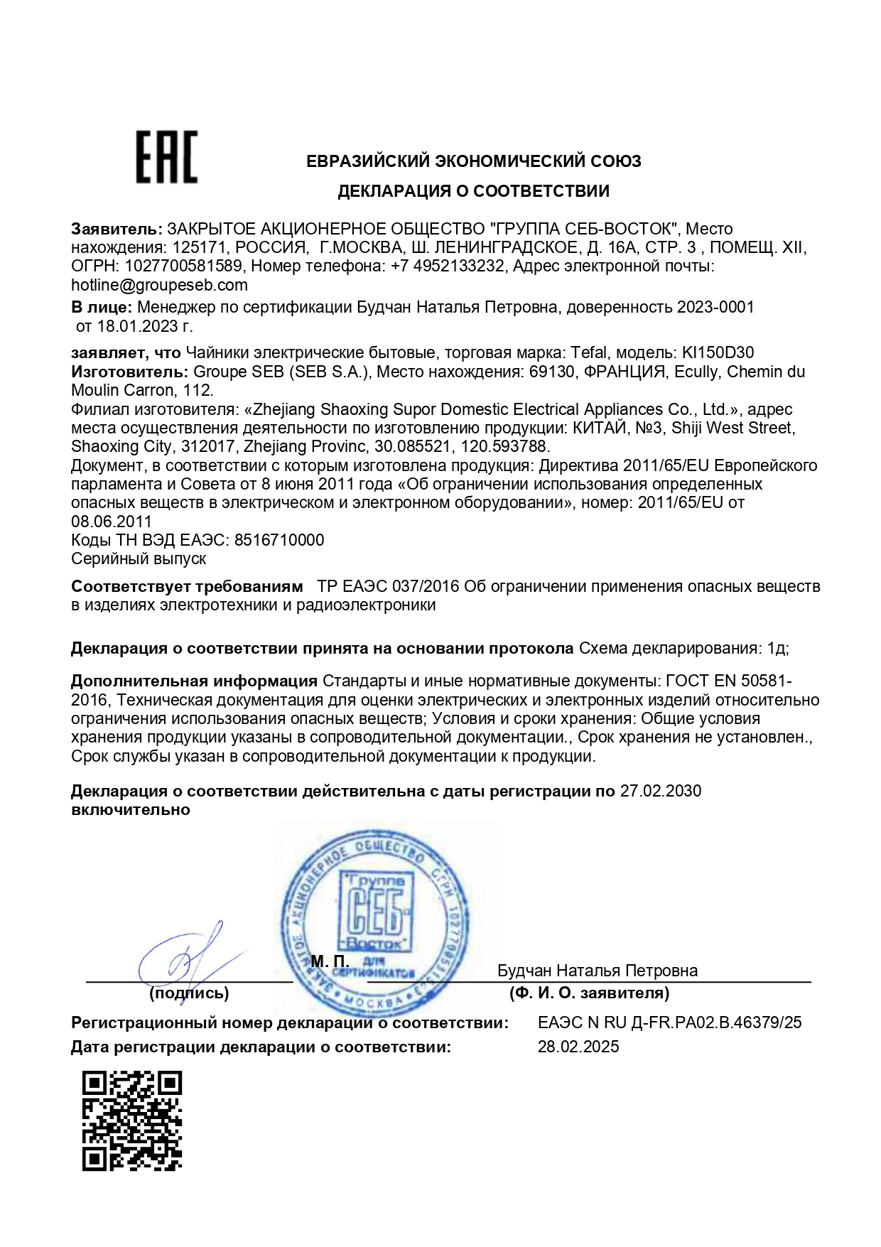 Чайник TEFAL KI150D30, 1,7 л, 2400 Вт, закрытый нагревательный элемент, сталь, серебристый Код товара: 456505 4 644,49 ₽ Купить Производитель:TEFAL Чайник TEFAL KI150D30 из серии Good Value – это классический элегантный дизайн и высокое качество материалов. Прочный серебристый корпус из нержавеющей стали с черными вставками прекрасно впишется в любой интерьер. Высокая мощность 2400 Вт обеспечит долгую и качественную службу. У чайника имеется один переключатель для включения и выключения. Благодаря ему вы всегда сможете регулировать процесс кипячения, в любой момент выключив чайник, если вам нужна теплая вода. При этом следить за процессом кипячения нет необходимости: когда вода достигнет точки кипения, сработает функция автоматического отключения. Скрытое расположение нагревательного элемента и внутреннее покрытие из нержавеющей стали премиального качества обеспечивают быстрое кипячение воды и легкую чистку чайника. Чайник имеет съемную крышку для удобства наполнения и очистки. Специальный фильтр от накипи, расположенный в основании носика, предотвращает попадание накипи в вашу кружку, легко снимается и промывается под проточной водой. Снимайте и ставьте чайник с любой стороны – круглое основание с поворотом на 360° обеспечивает удобное использование устройства. Производитель оставляет за собой право без предварительного уведомления вносить изменения в технические характеристики, комплектацию и конструкцию, не ухудшающие эксплуатационные характеристики изделия.Производство: КитайОбъем: 1.7 лМощность: 2400 ВтМатериал корпуса: нержавеющая сталь, пластикВид нагревательного элемента: закрытыйАвтоотключение при закипании: даСерия: KI150D30Отключение при отсутствии воды: даИндикатор включения: даВращение на 360°: даФильтр от накипи: даДлина шнура: 0.9 мЦвет корпуса: стальной серыйШирина: 162 ммВысота: 235 ммГлубина: 225 ммВес (без упаковки): 0.9 кгВес: 1,23 кгРазмер упаковки: 18.9 × 22.2 × 21.7 смОбъём: 0.0091 м3Промежуточная упаковка: 1 штТранспортная упаковка: 1 штШтрих-код: 3045386362813 Файлы Приложение-1.pdf Сертификат-1.jpg Сертификат-2.jpg Сертификат-3.jpg Сертификат-4.jpg Сертификат-5.jpg